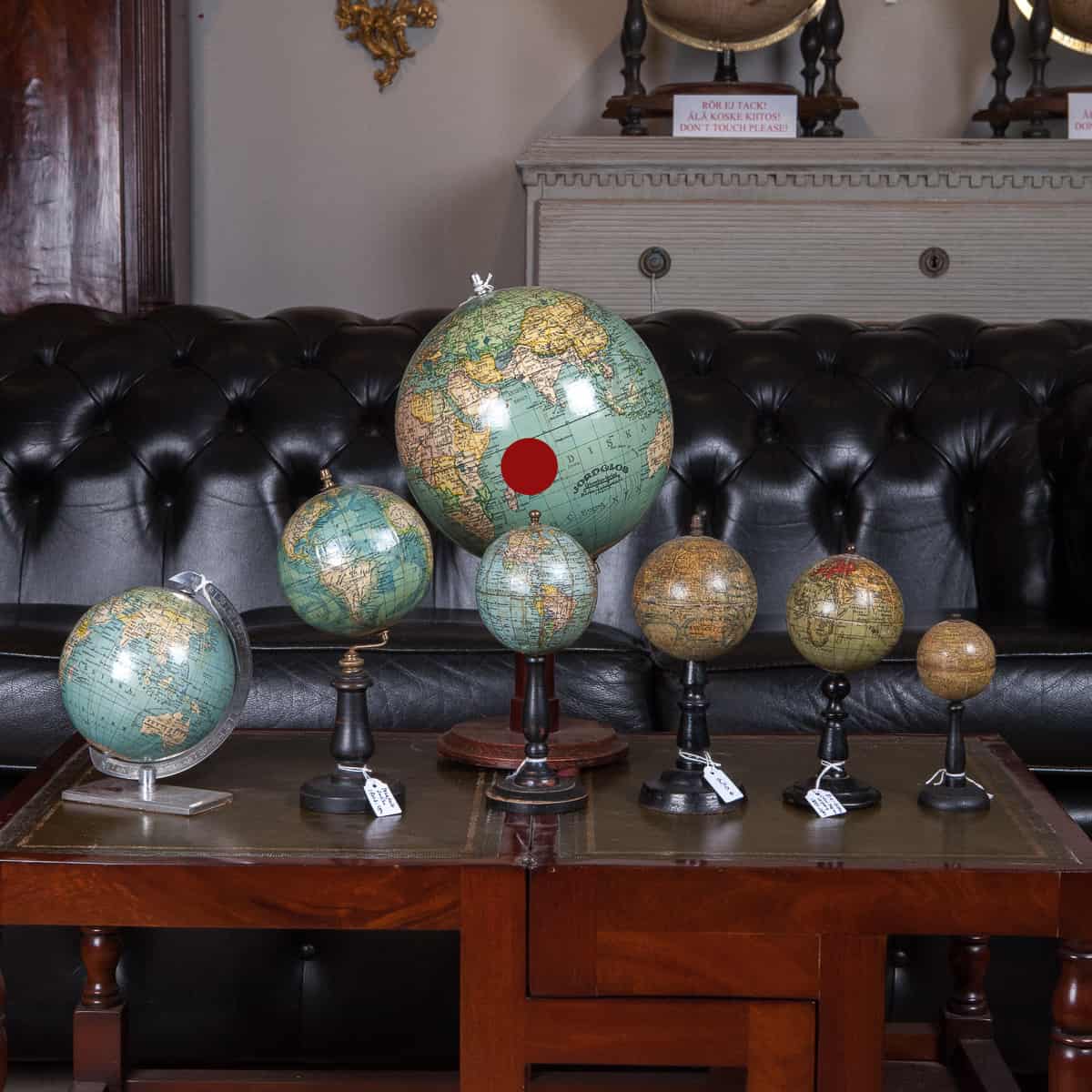 French “Globe Terrestre miniature globe from the 19th century. Editeur G.Thomas, Paris. Globe diameter: approx. 8 cm. Height: approx. 15 cm. Hidden structure is made of wood or papier-mâché.