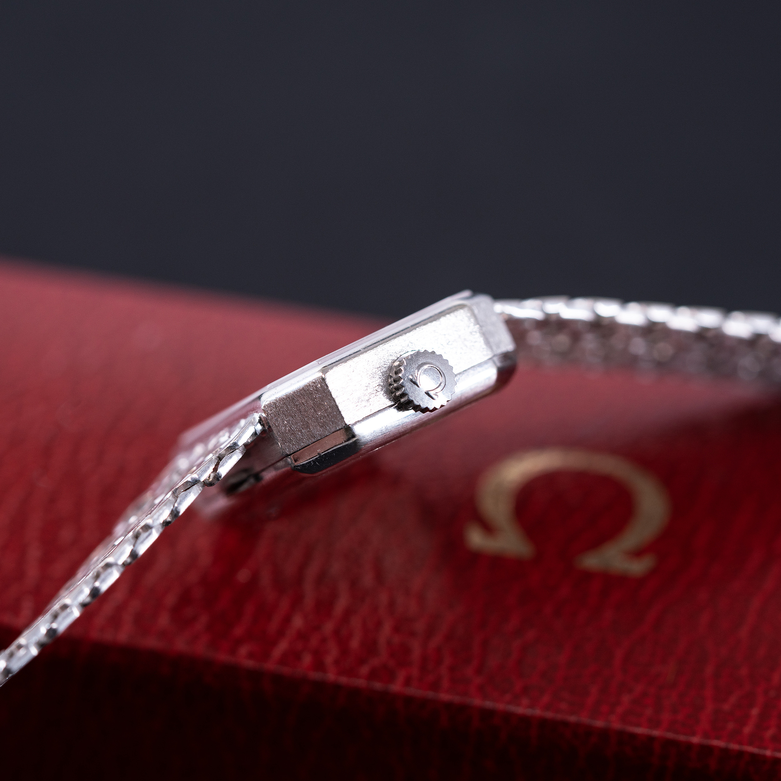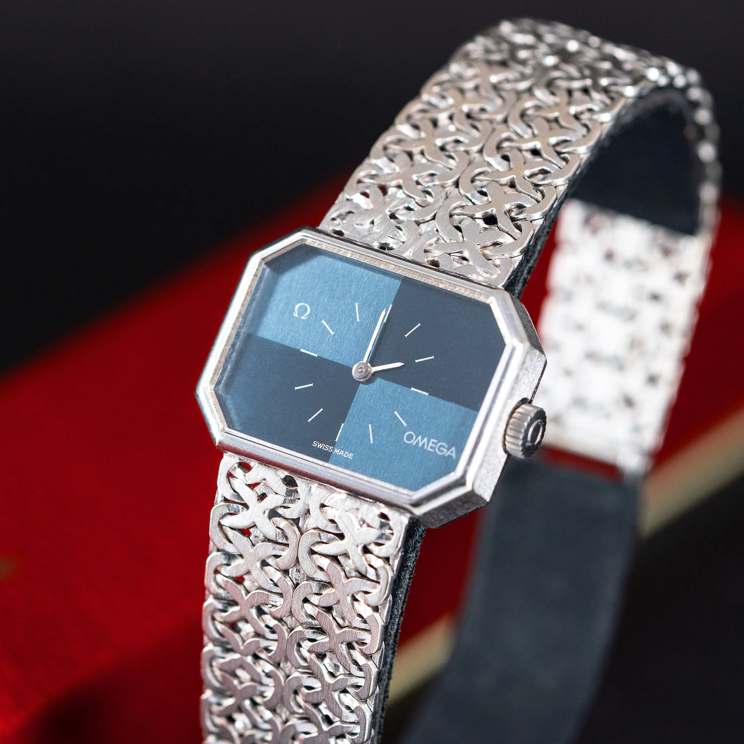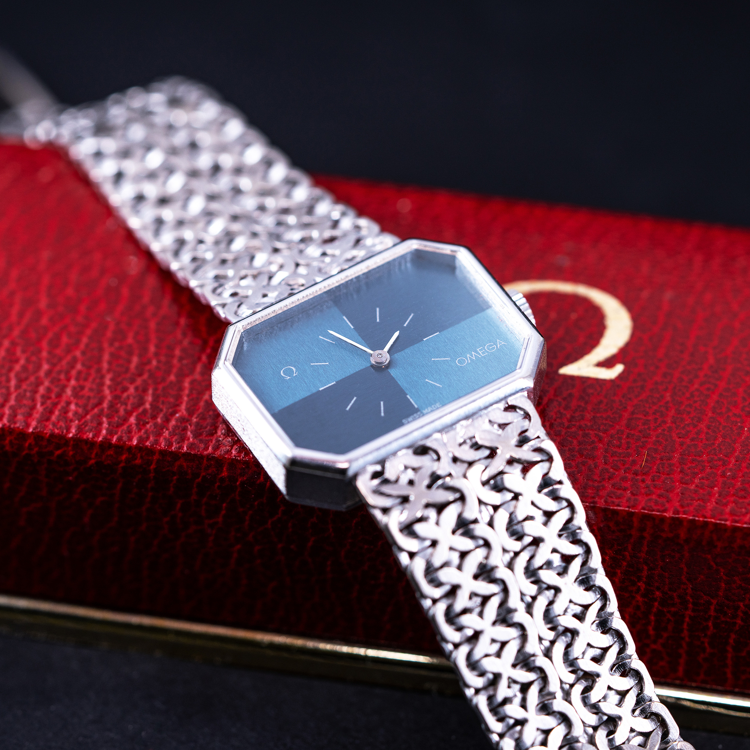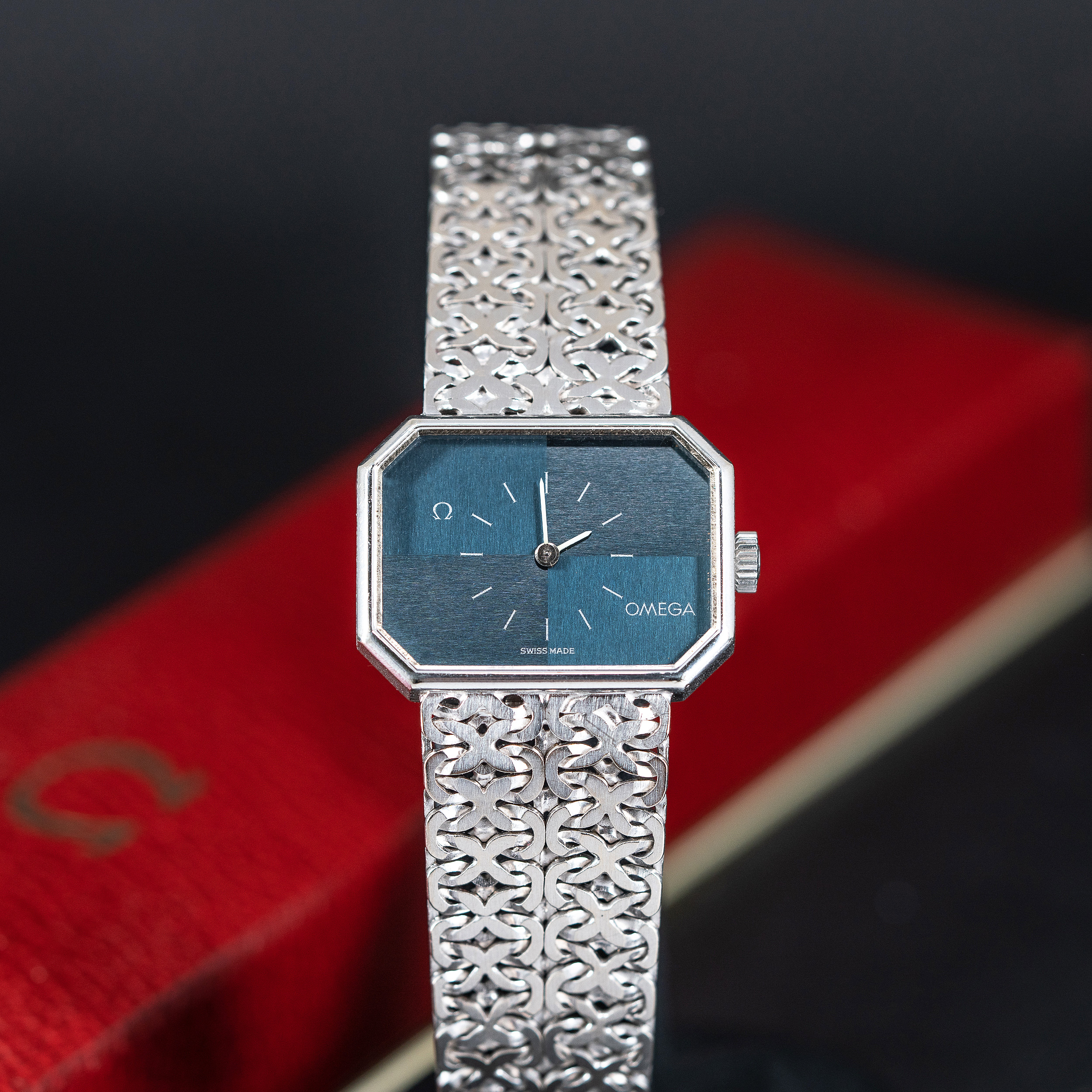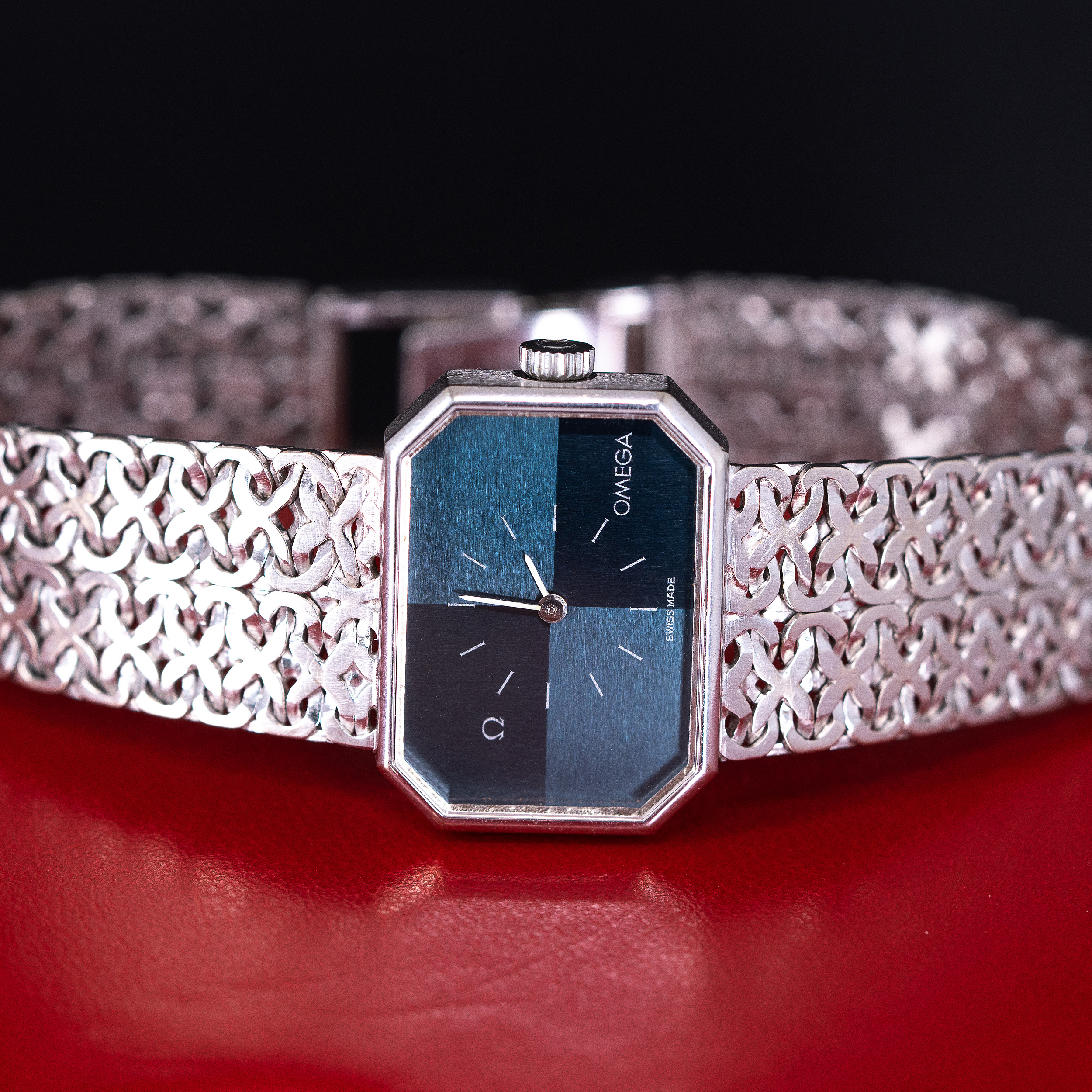 Harvinainen 14k Omega De Ville Jeux d’Or valkokultainen naisten pukukello vuodelta 1973. Kellossa on huippukuntoinen sininen two-tone kellotaulu. Valkokultainen kuori ja ranneke on hienossa kunnossa.