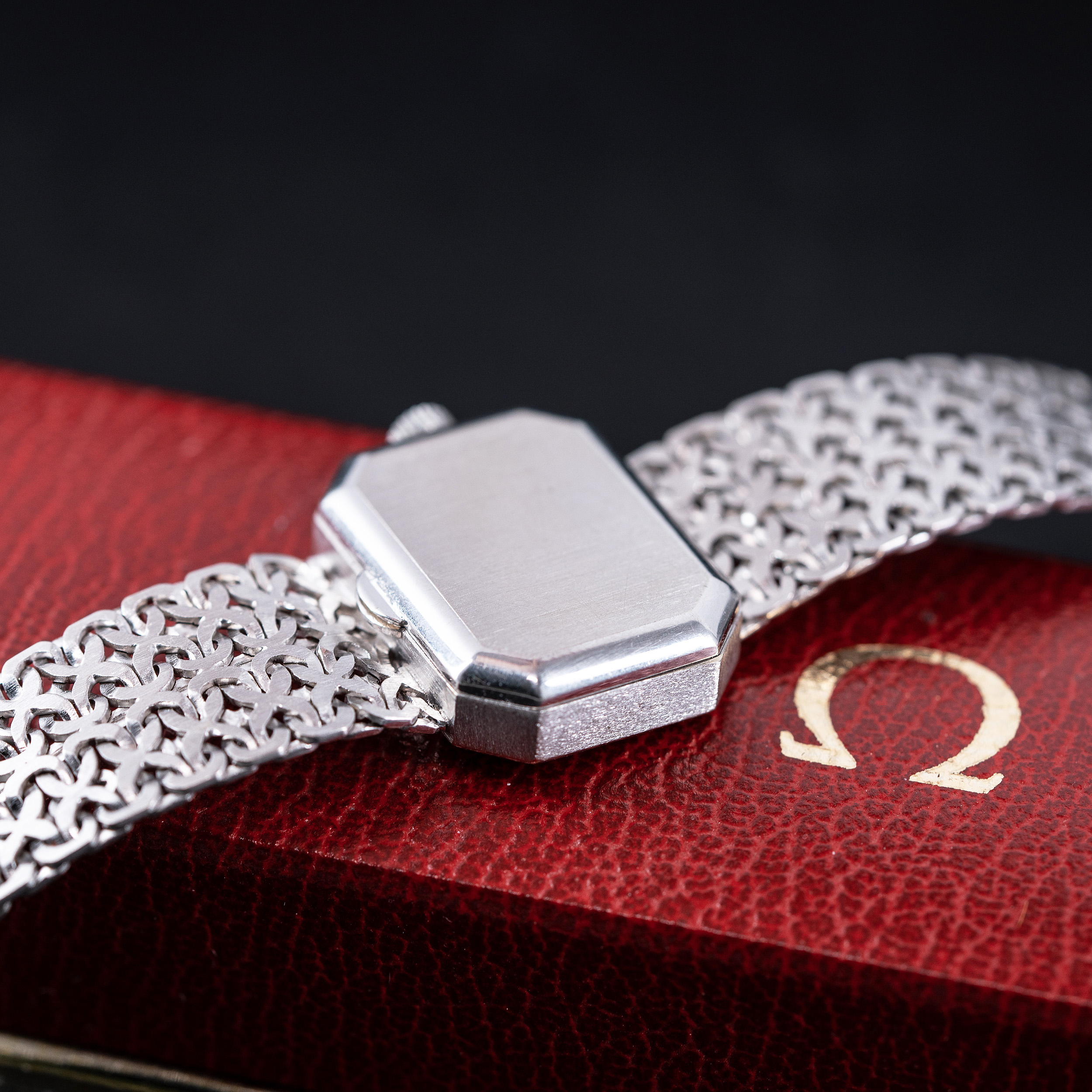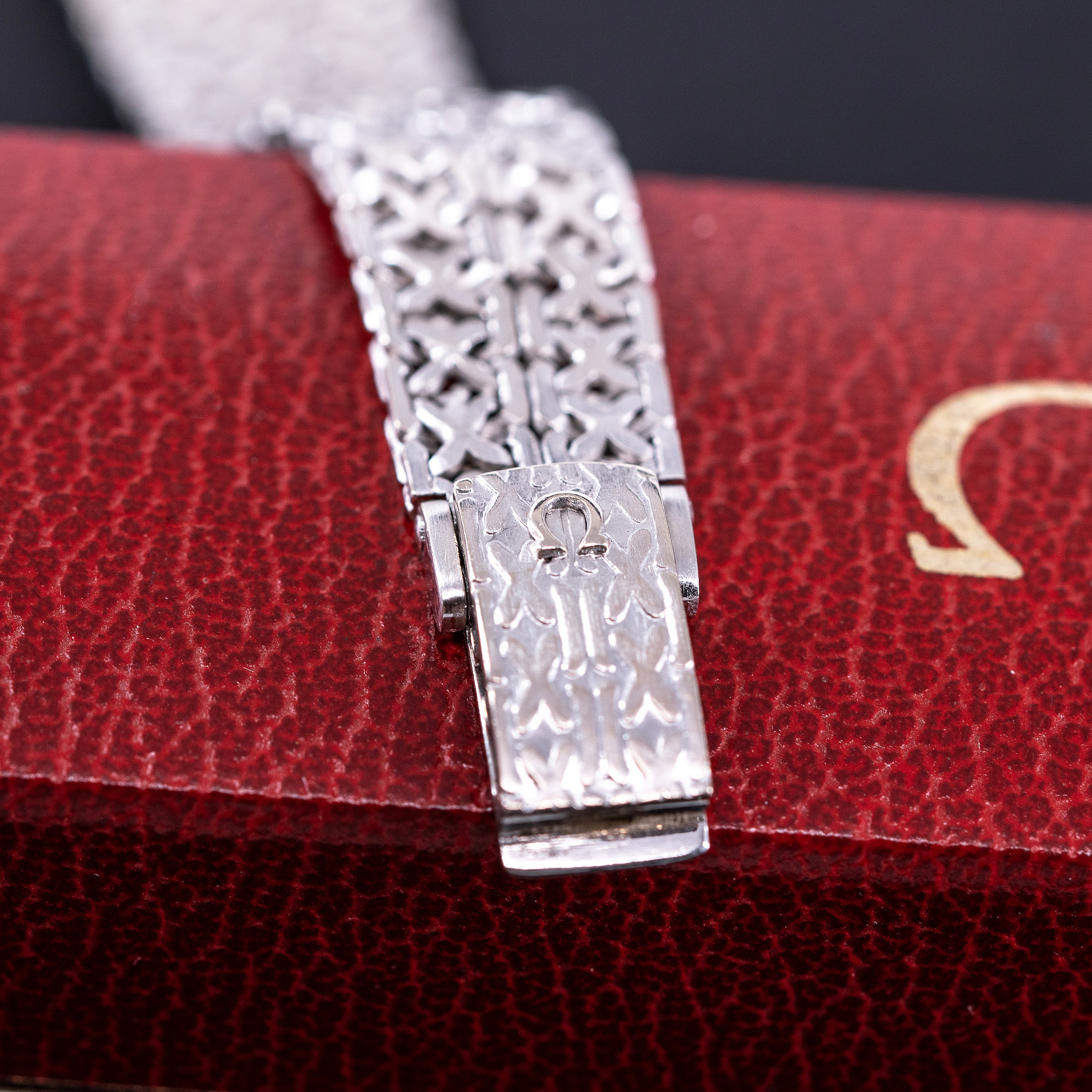 Kellossa on Omegan cal.485 manuaalivetoinen koneisto. Koneisto on juuri täysin kunnostettu. Kellon alkuperäinen 14k valkokultainen ranneke on huippukunnossa. Ranteen lukossa on Omegan logo.