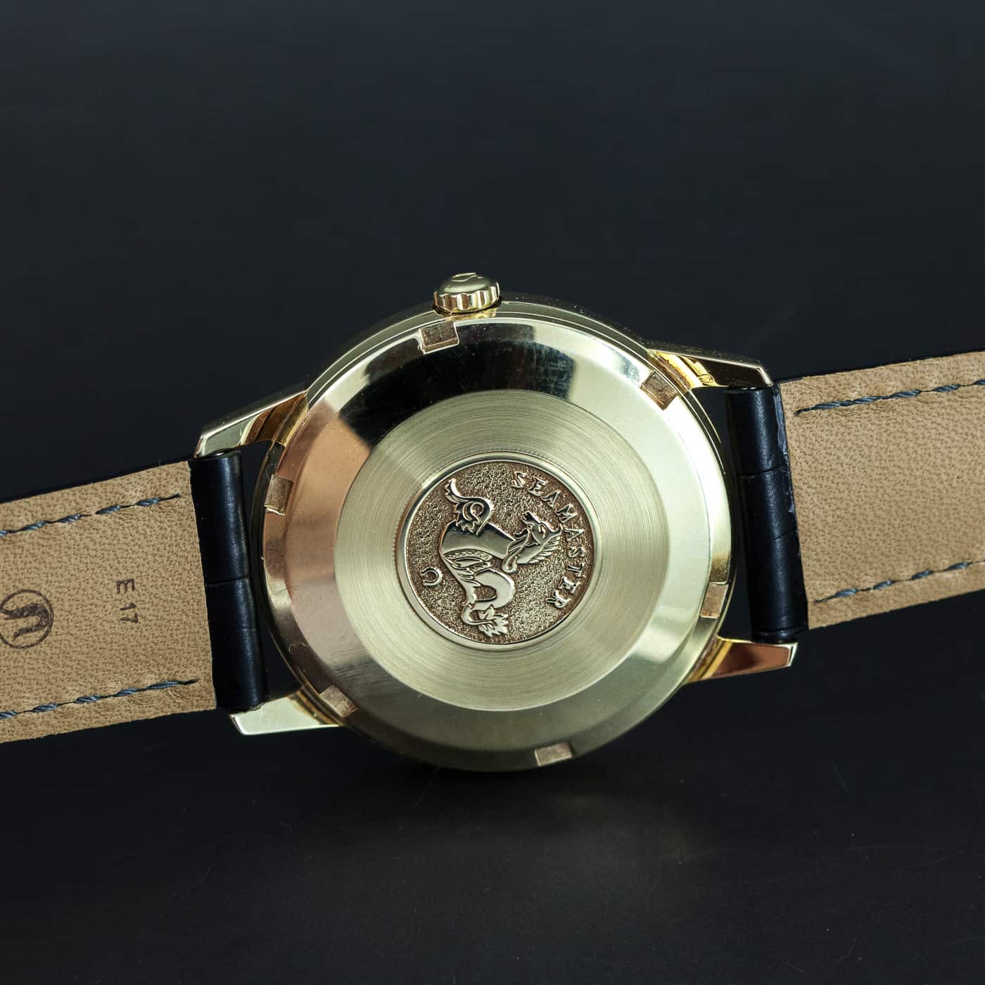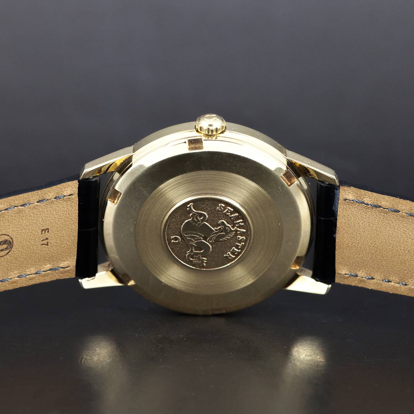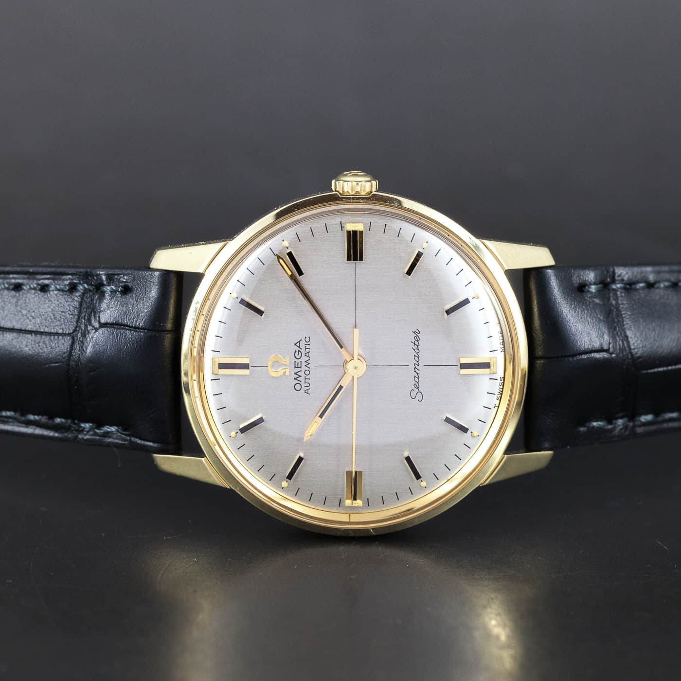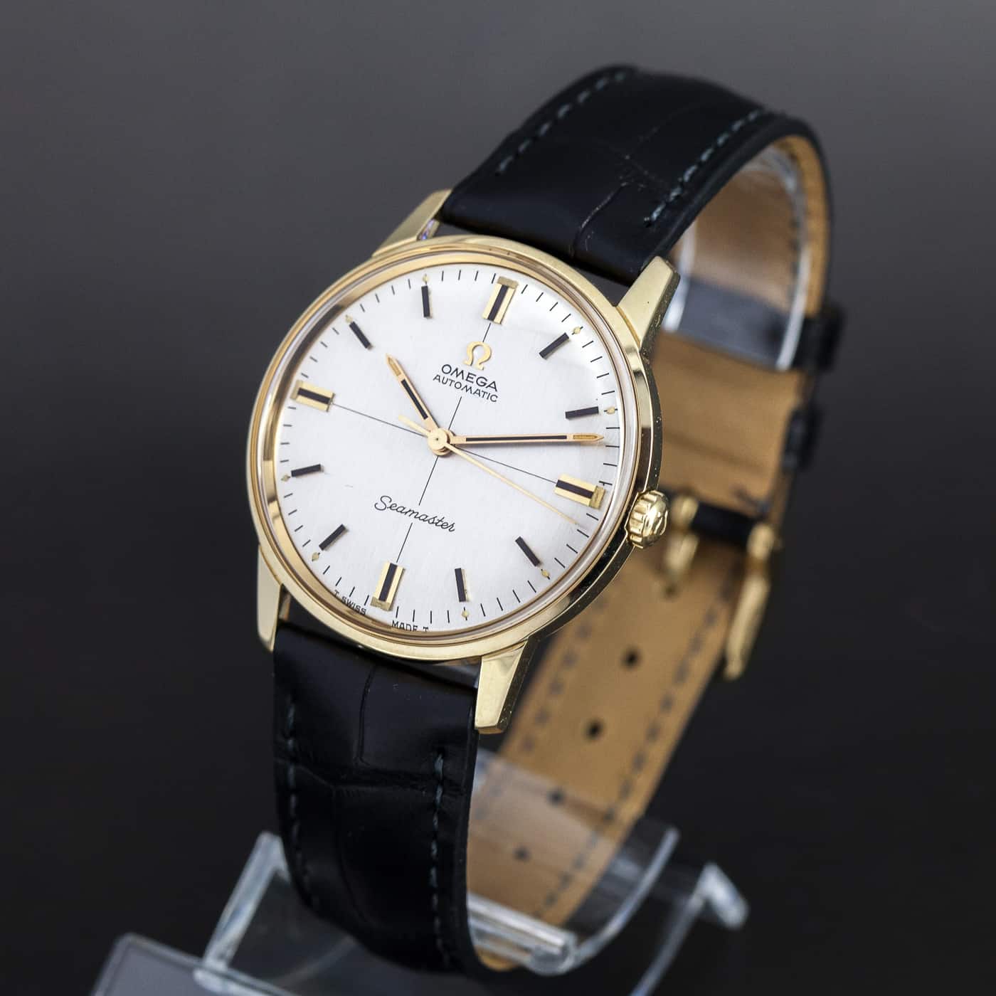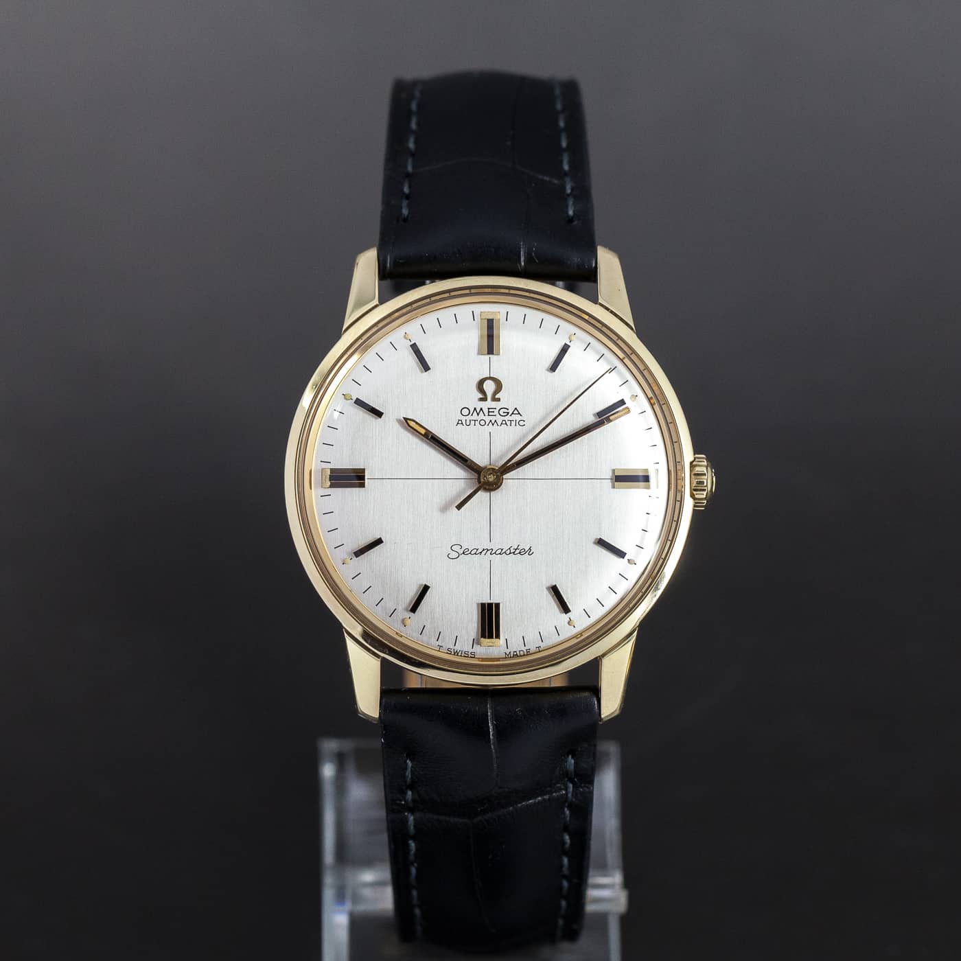 Virheetön 14k Omega Seamaster Automatic pukukello vuodelta 1966. Ref.165.001. Täydellisesti kunnostettu Omegan cal.552 automaattikoneisto. Virheetön alkuperäinen ”crosshair” kellotaulu. Kuori on myös huippukunnossa. Hirsch London Alligator ranneke. Kuoren koko on 34mm.