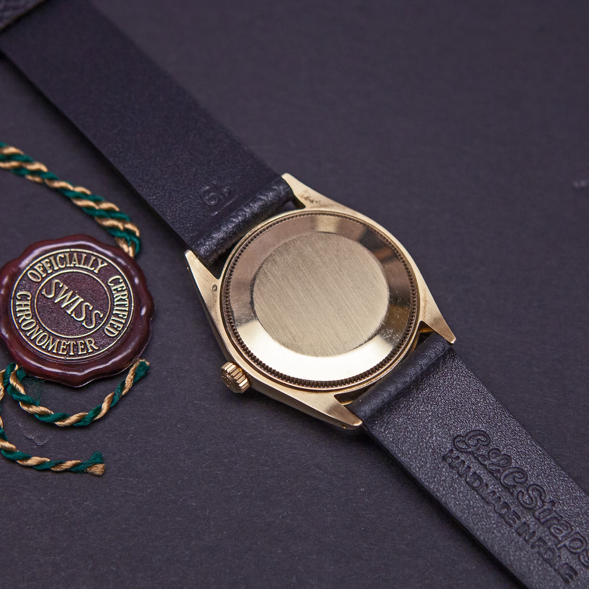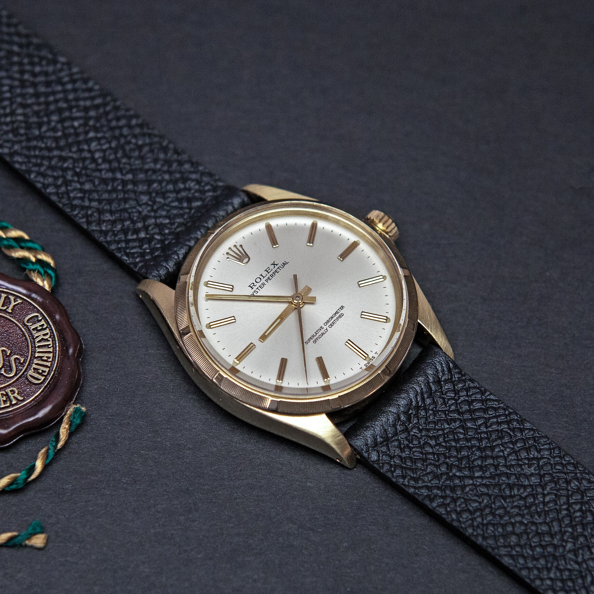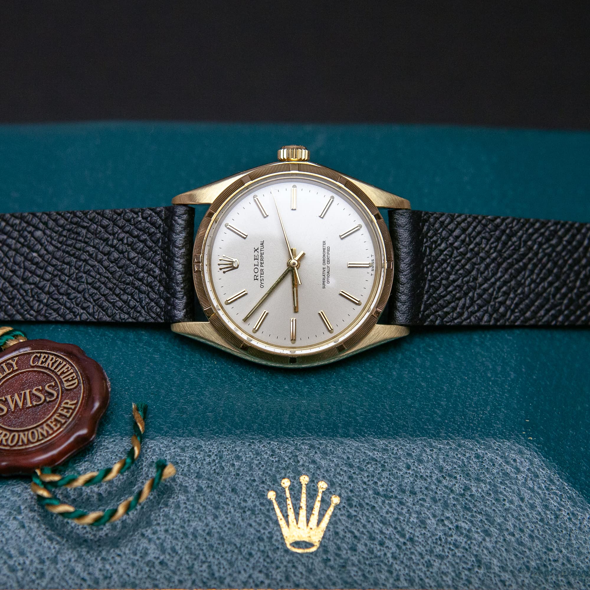 Rolex Oyster Perpetual ref. 1003 automaattirannekello vuodelta 1970. Huippukuntoinen 14k kultakuori. Virheetön hopeinen kellotaulu ja kullatut osoittimet. Rolex cal. 1570 automaattikoneisto on huollettu kaksi vuotta sitten. Koneisto toimii hyvin ja kuori on yhä vesitiviis. Tämä kello on jo alkunperin myyty nahkaranteisena, kuoressa ei ole minkäänlaisia metalliranteen jälkiä. Ranneke on käsin ommeltu italialainen malli. Alkuperäinen Rolexin kullattu solki.