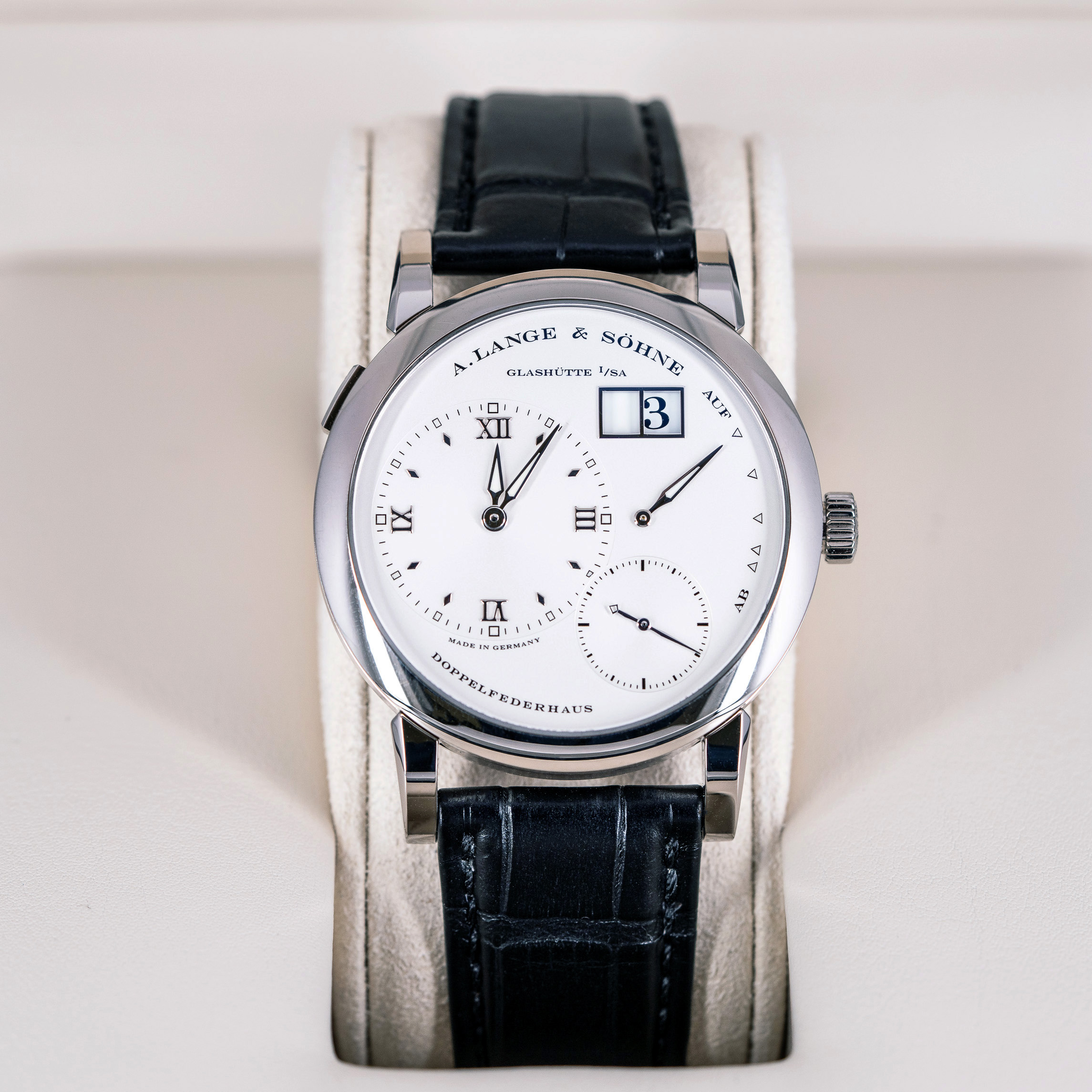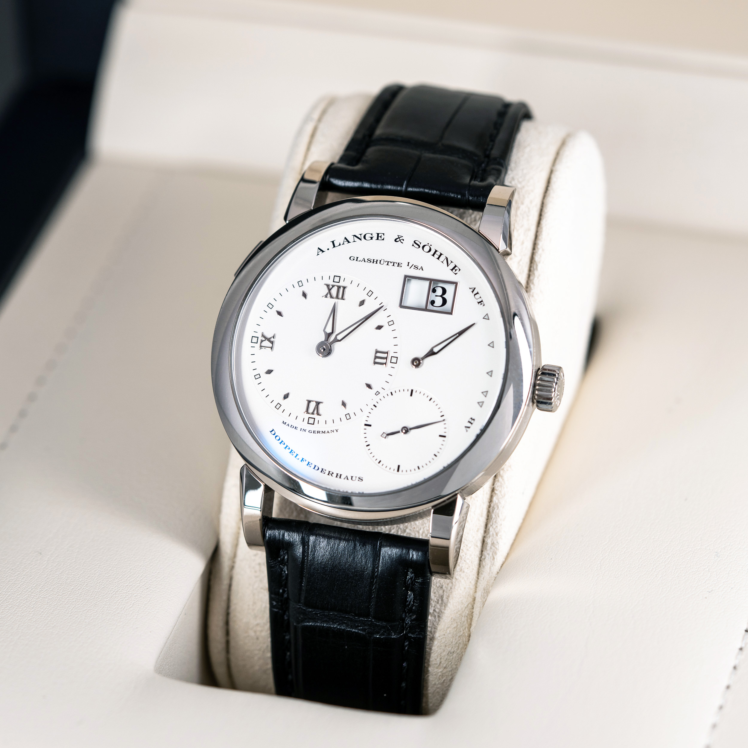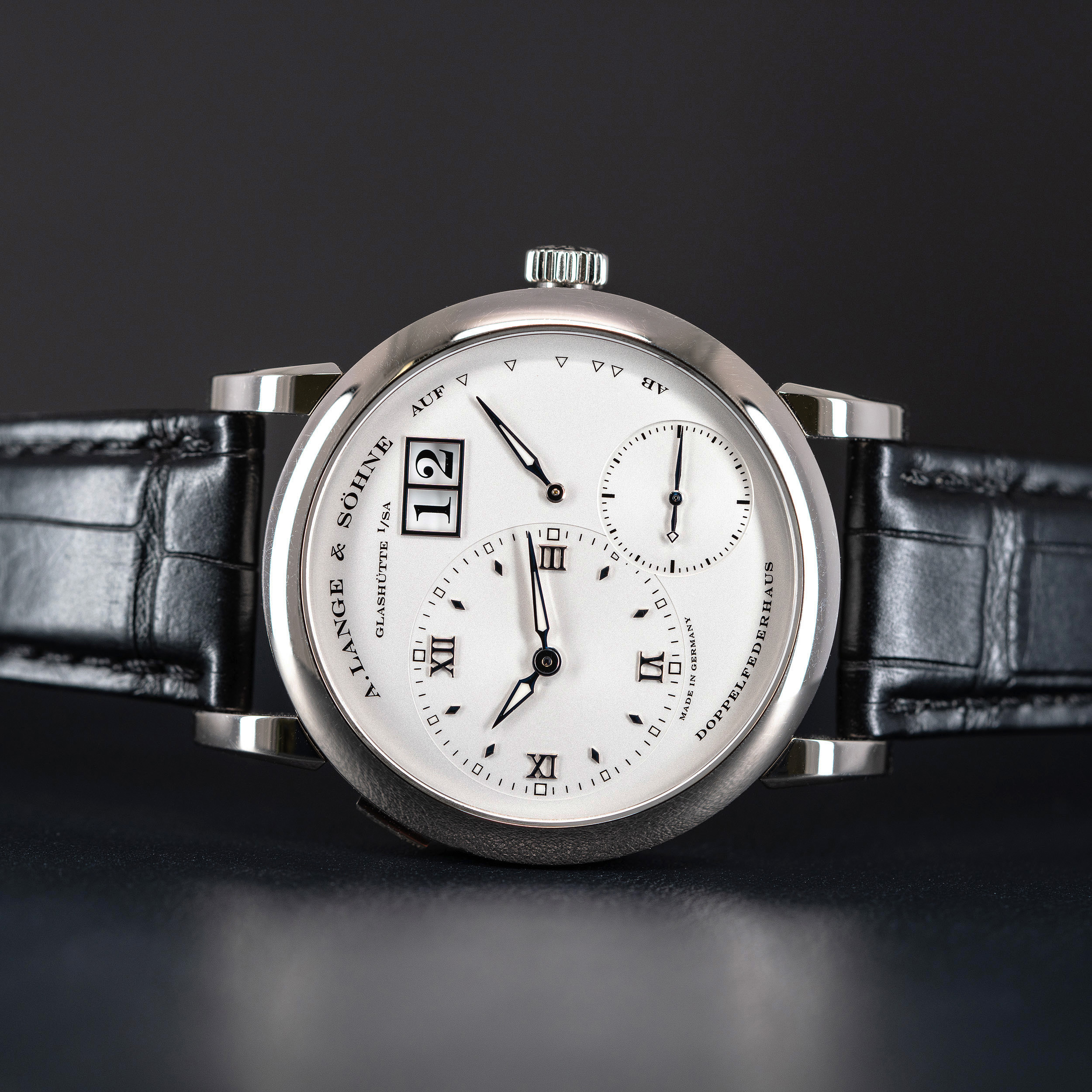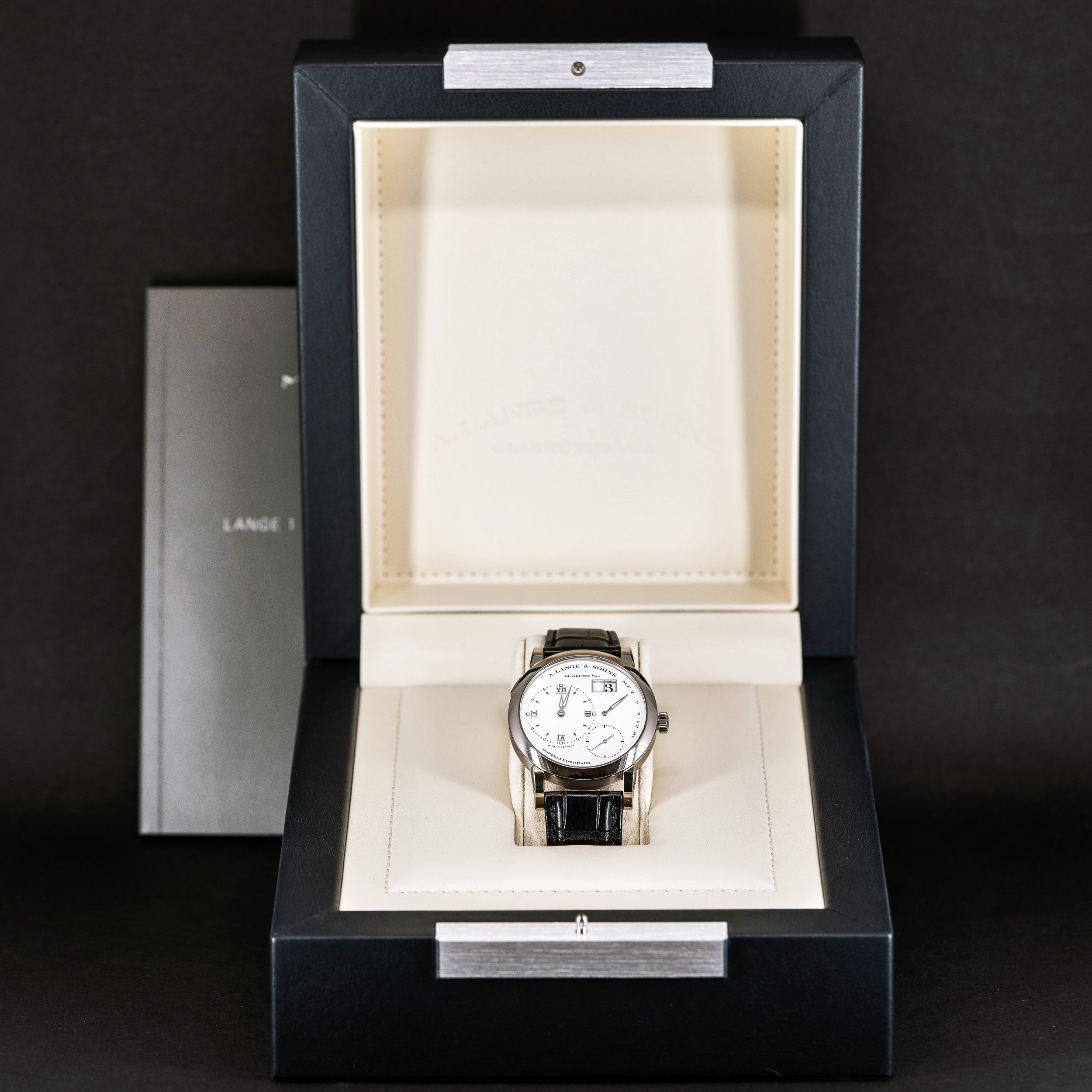 Klassisen kaunis., NOS (new old stock) 18k valkokultainen A.Lange & Söhne Lange 1 rannekello noin vuodelta 2014. Ref. 101.039. Kellossa on virheetön massiivihopeasta valmistettu kellotaulu, jossa on valkokultaiset osoittimet ja suurikokoinen tuplapäivyri. Päivyrin kehys on valkokultaa. Tunti-, minuutti ja jousivoiman reservin osoittimessa on super-luminova loistemassa. Päivyrin asetus tapahtuu kuoren suurikokoisella painimella. 18k valkokultainen kuori on virheetön. Kuoren koko on 38,5mm.