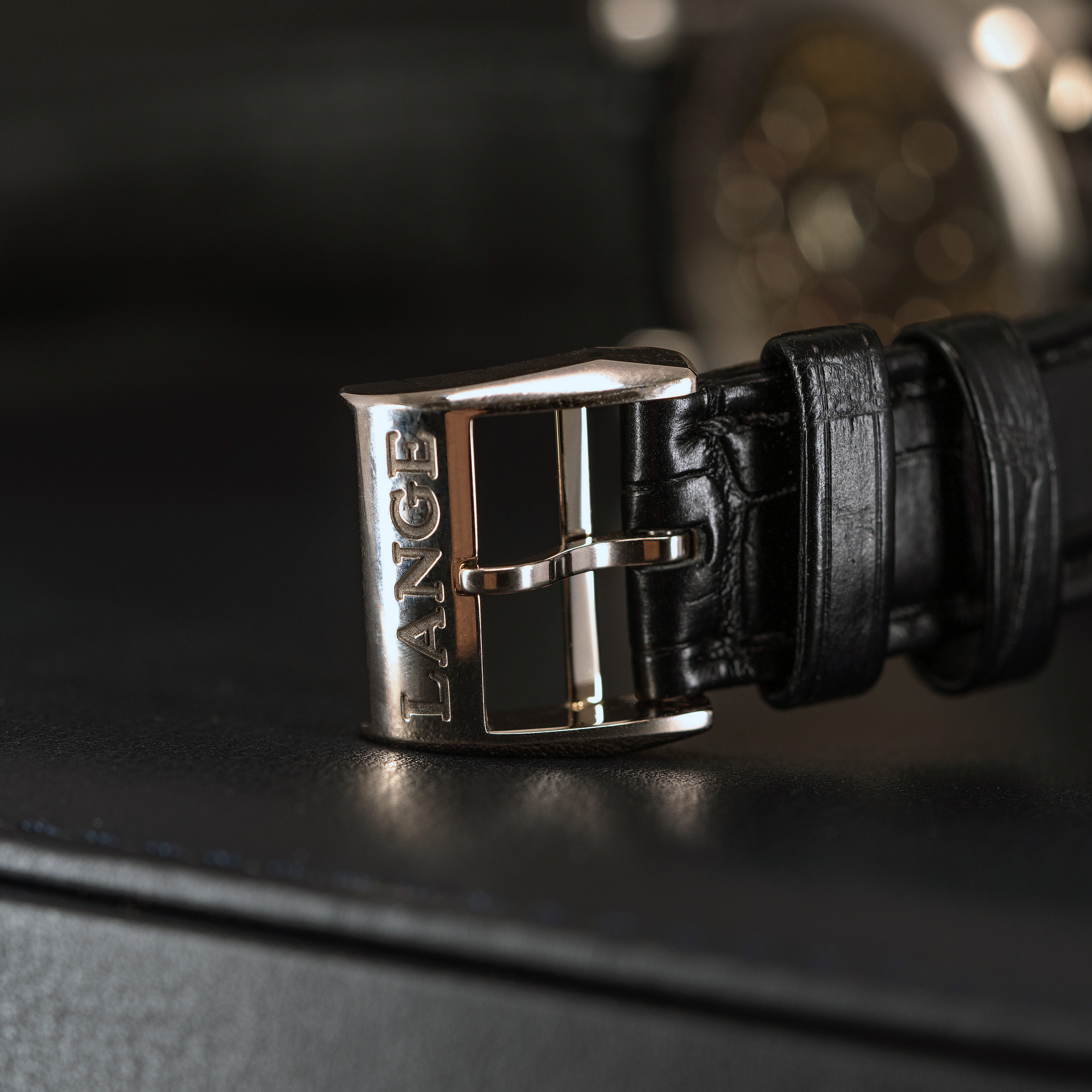 Kellossa on A.Langen alkuperäinen käyttämätön alligaattori nahkaranneke ja 18k LANGE solki.