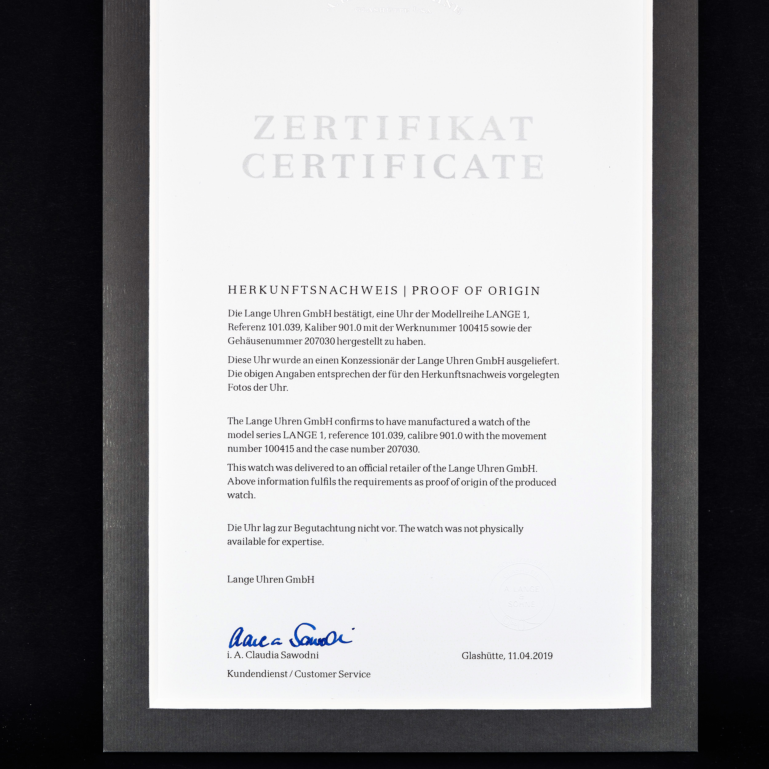 Tämän yksilö on hankittu henkilökuntaetuna suoraan A.Langen tehtaalta, minkä vuoksi sen mukana ei tule liikkeen takuukirjaa. Takuukirjan tilalla on tehtaan Proof of Origin todistus. Kello on käyttämätön.