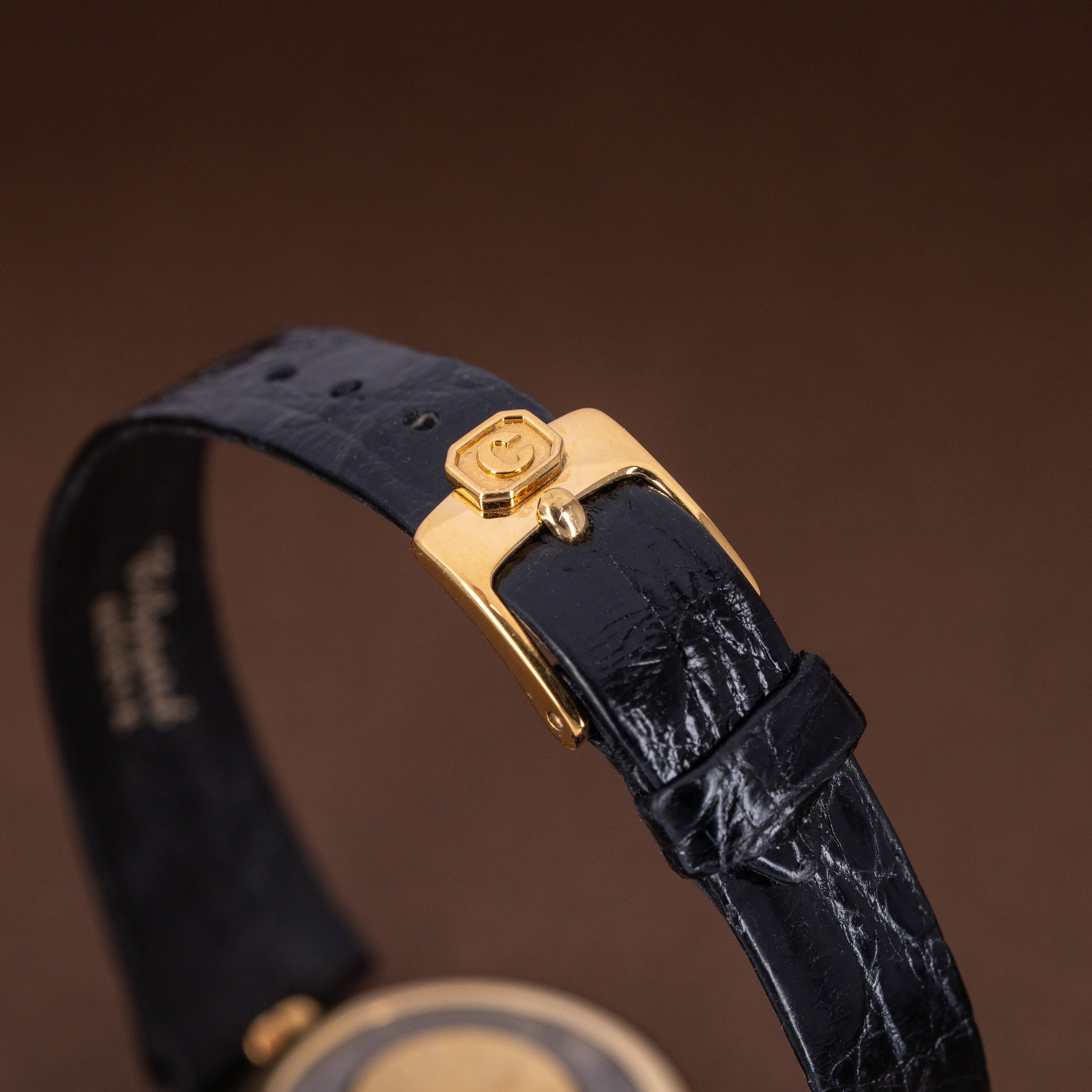 Musta alligaattori nahkaranneke on Chopardin alkuperäinen malli ja ranteessa on Chopardin kullattu solki.