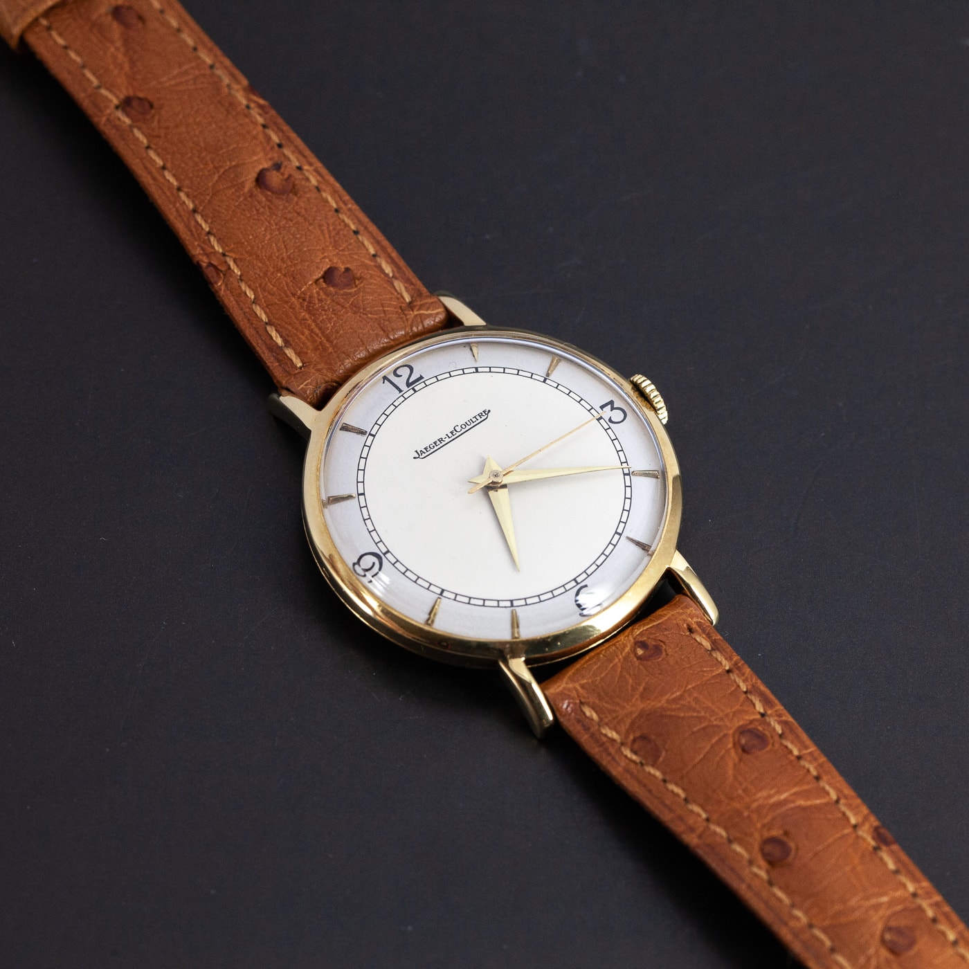 18k Jaeger LeCoultre pukukello vuodelta 1946. Erittäin kaunis hopeoitu kellotaulu ja dauphine osoittimet. Koneisto on JLC:n cal.P450/4C manuaalivetoinen malli. Kuori on 18k kultaa. Tämä kello on tarkoitettu siistiin pukukäyttöön, kuori ei ole vesitiivis. Ranneke on Hirsch Massai Ostrich mallia. Kuoren koko on 35mm.