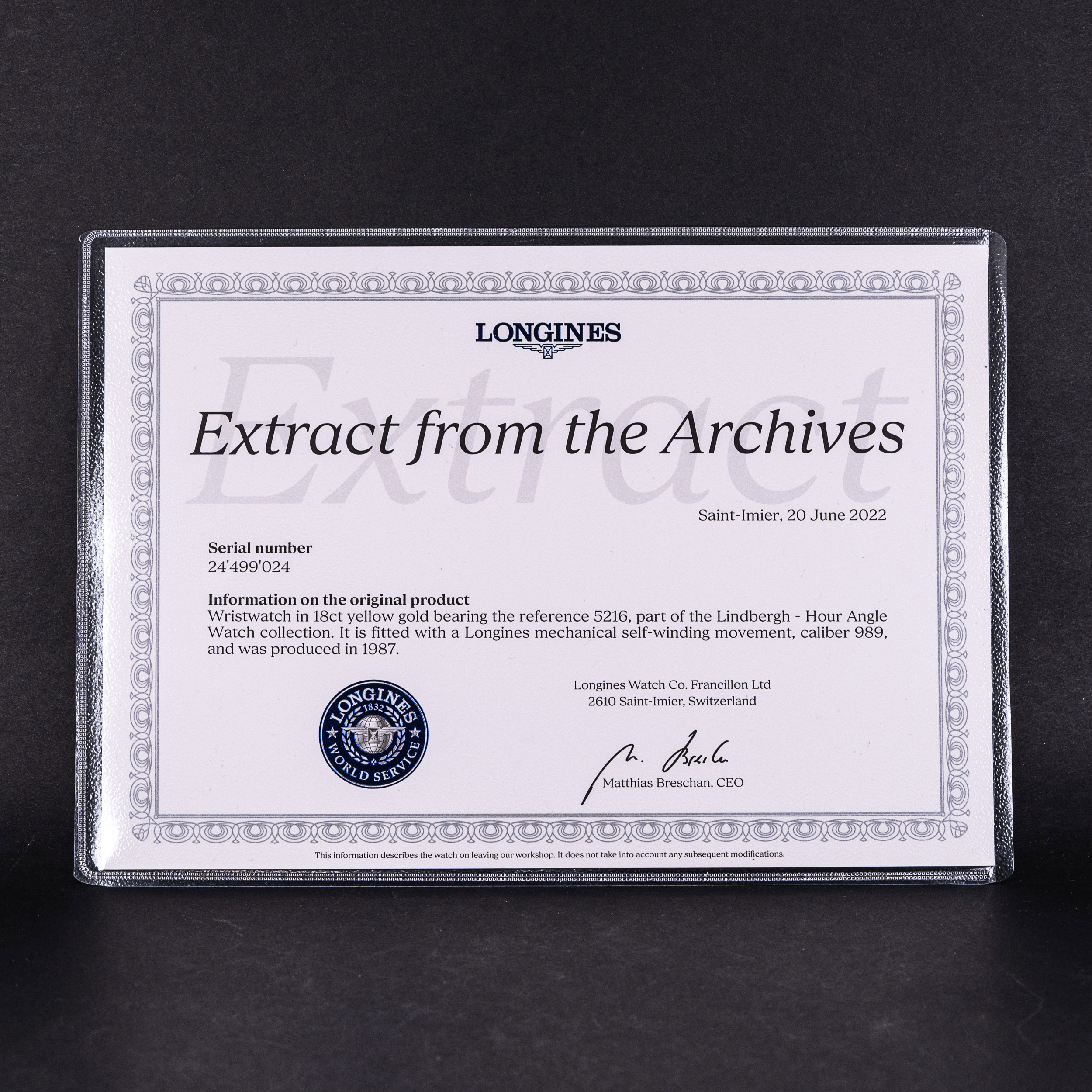 Longines valmisti 1987 ref. 5215 juhlamallin kun Lindberghin lennosta oli kulunut 60 vuotta. Alkuperäisen kokoinen 47,5 mm 1-1 replika oli varustettu Longineksen manuaalikoneistolla ja Hour-Angle mekanismilla. Juhlamallia valmistettiin 1000 kpl teräksisenä ja 100 kpl kultaisena. Näiden lisäksi Longines valmisti myös kultaisen 38mm ref.5216 mallin automaattikoneistolla. Meidän kello on yksi näistä harvinaisista kultaisista 38mm malleista.