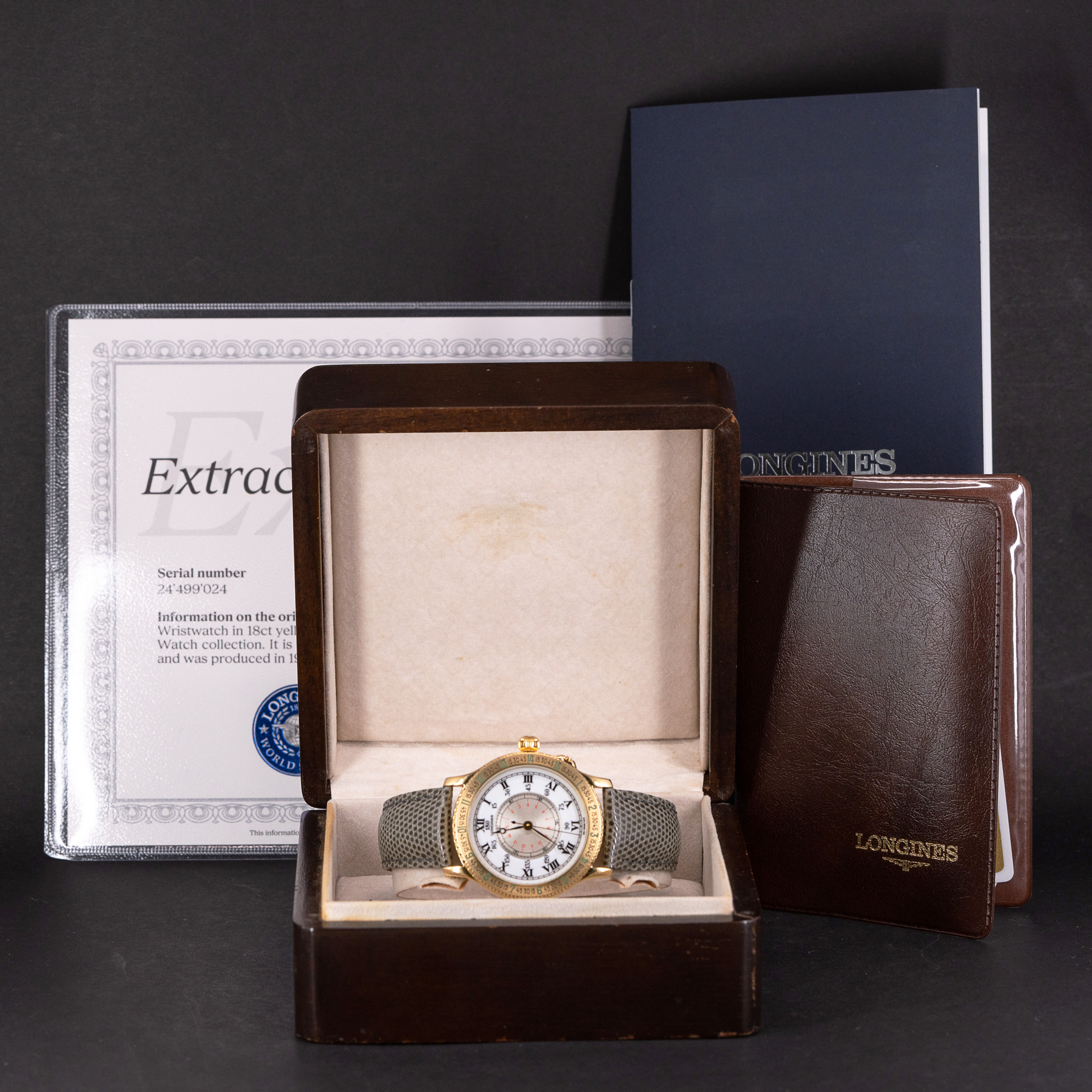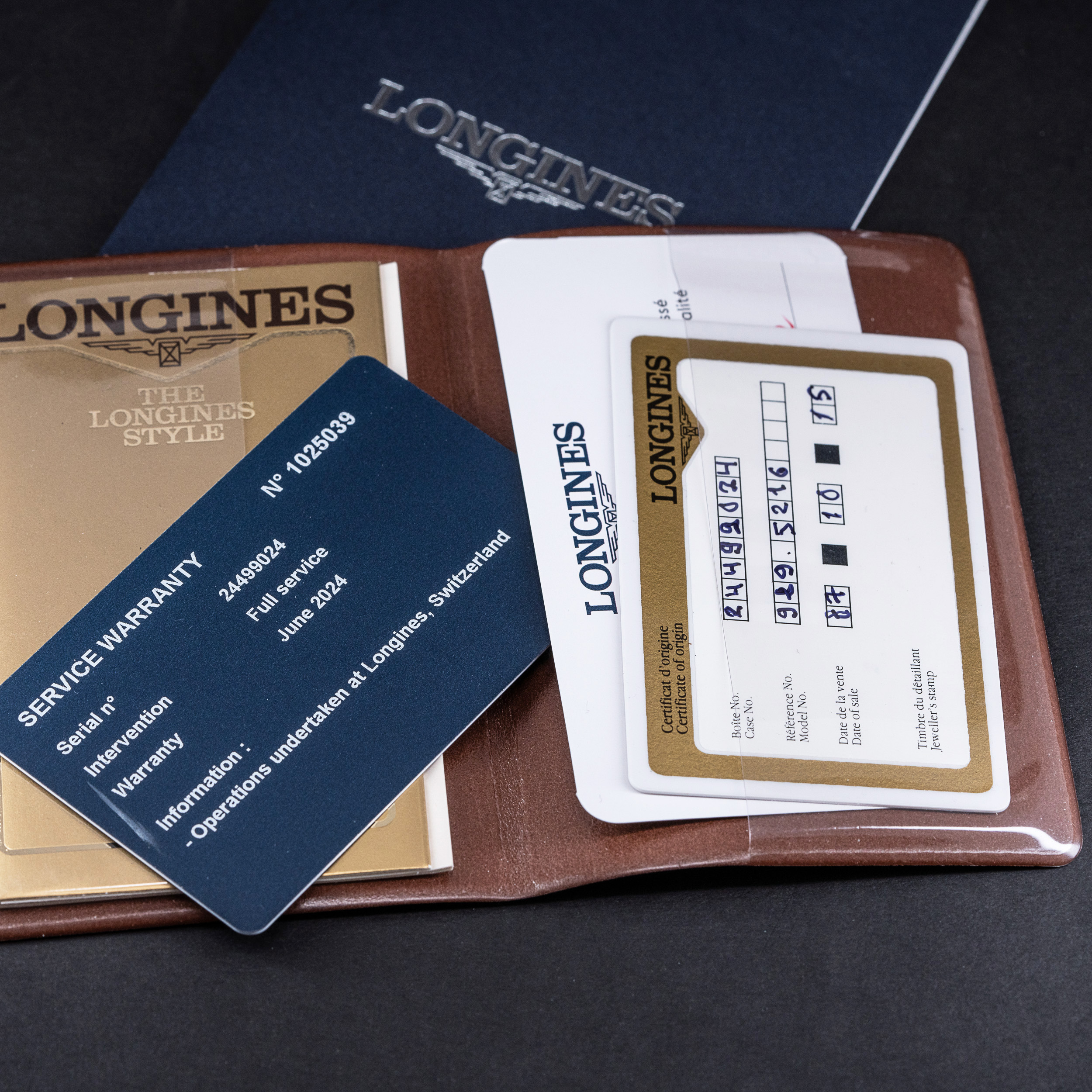 Kellon mukana tulee kultaisen Hour-Angle mallin mahonkinen kellolaatikko, alkuperäinen takuukortti (päivätty, ei liikkeen leimaa), käyttöohjeet, tehtaan takuupaperit ja kortti sekä Longineksen museon sertifikaatti.