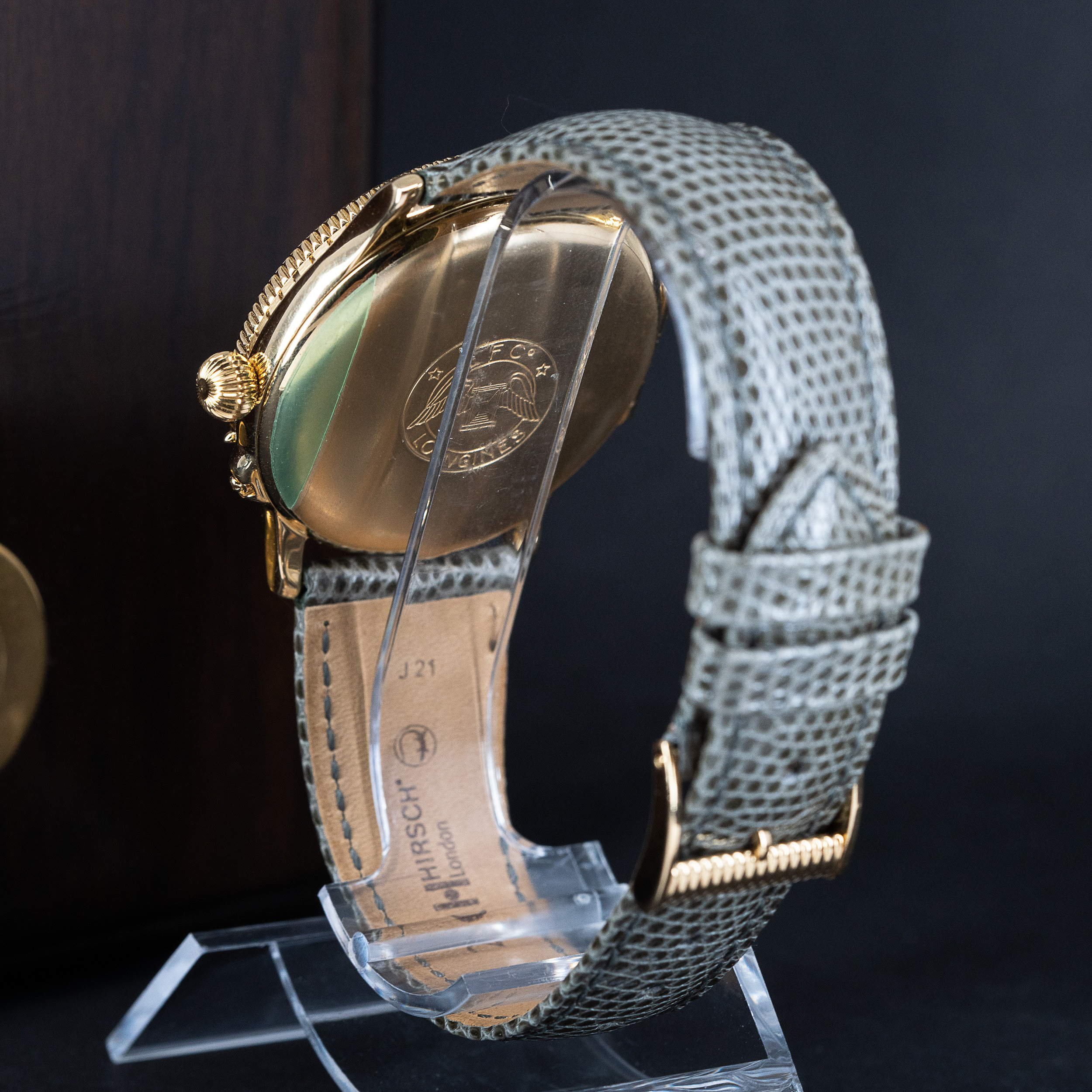 Nahkaranneke on Hirsch London Lizard -mallia ja rannekkeessa on Longineksen alkuperäinen kullattu solki.