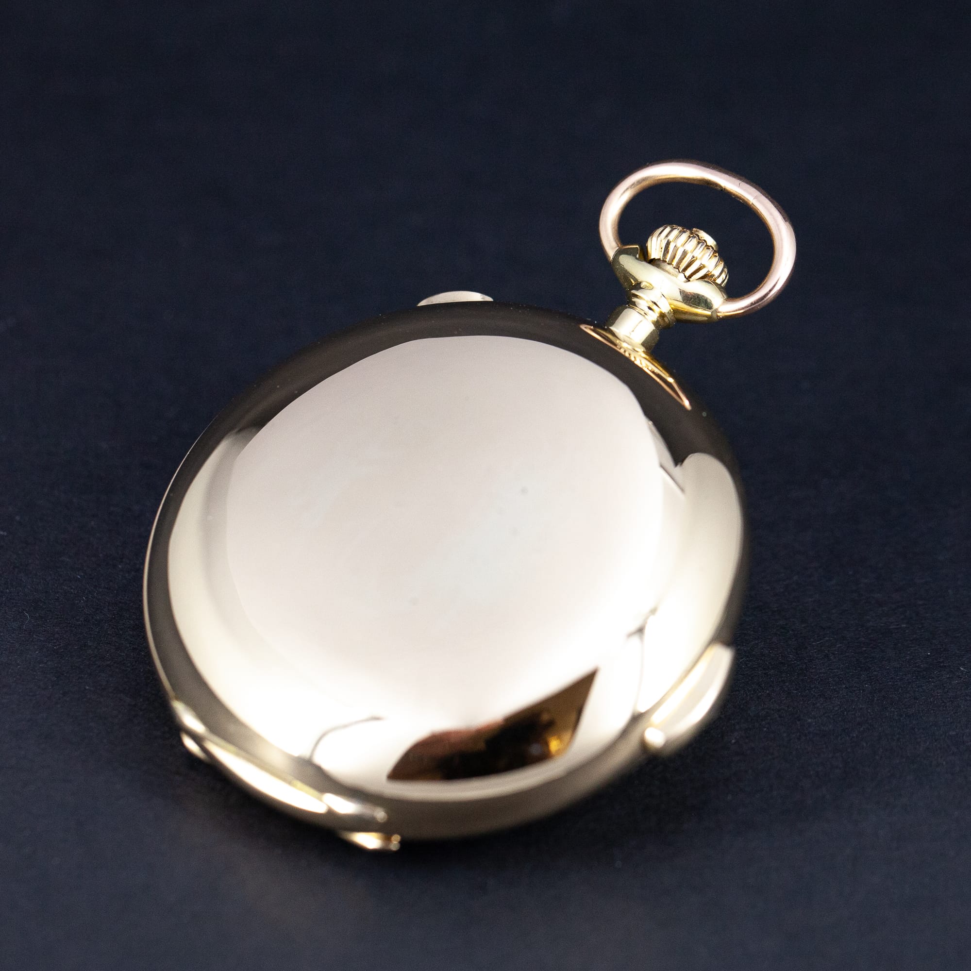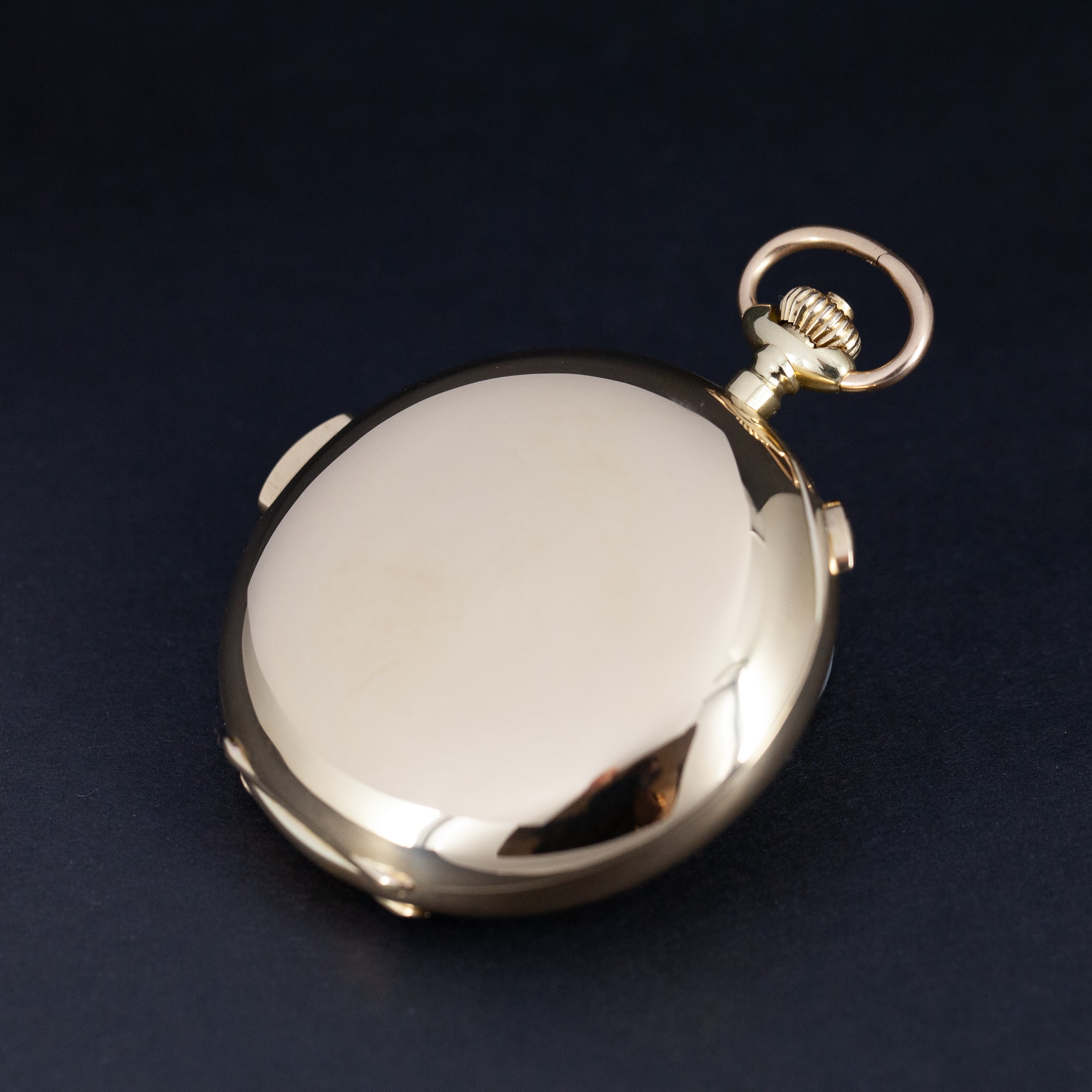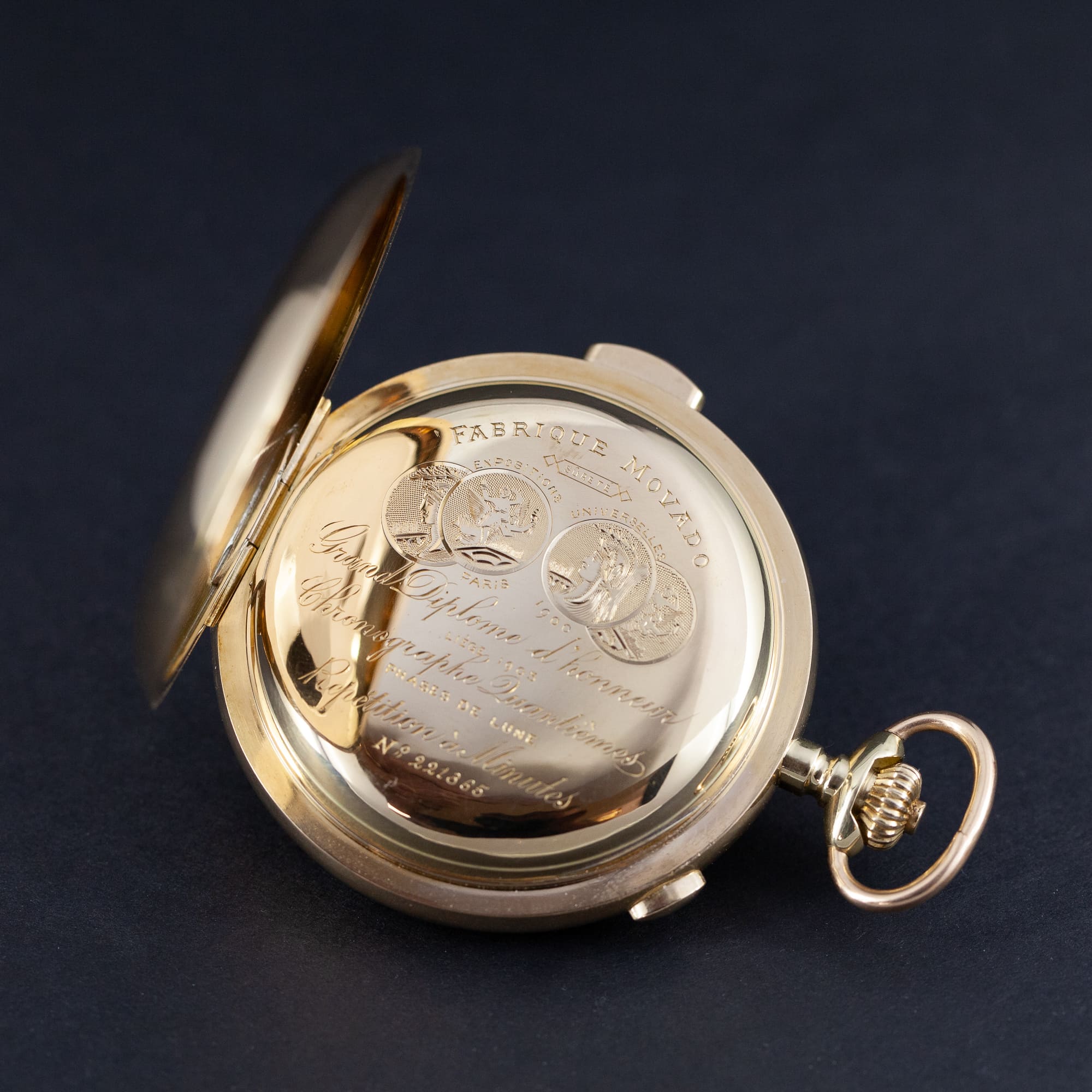 Hyvin harvinainen 18k kultainen Movado Grand Complication minuuttirepeteeri taskukello kuunkierto, kalenteri ja kronografi mekanismilla 1920-luvulta. Juuri täydellisesti restauroitu kokonaisuus.