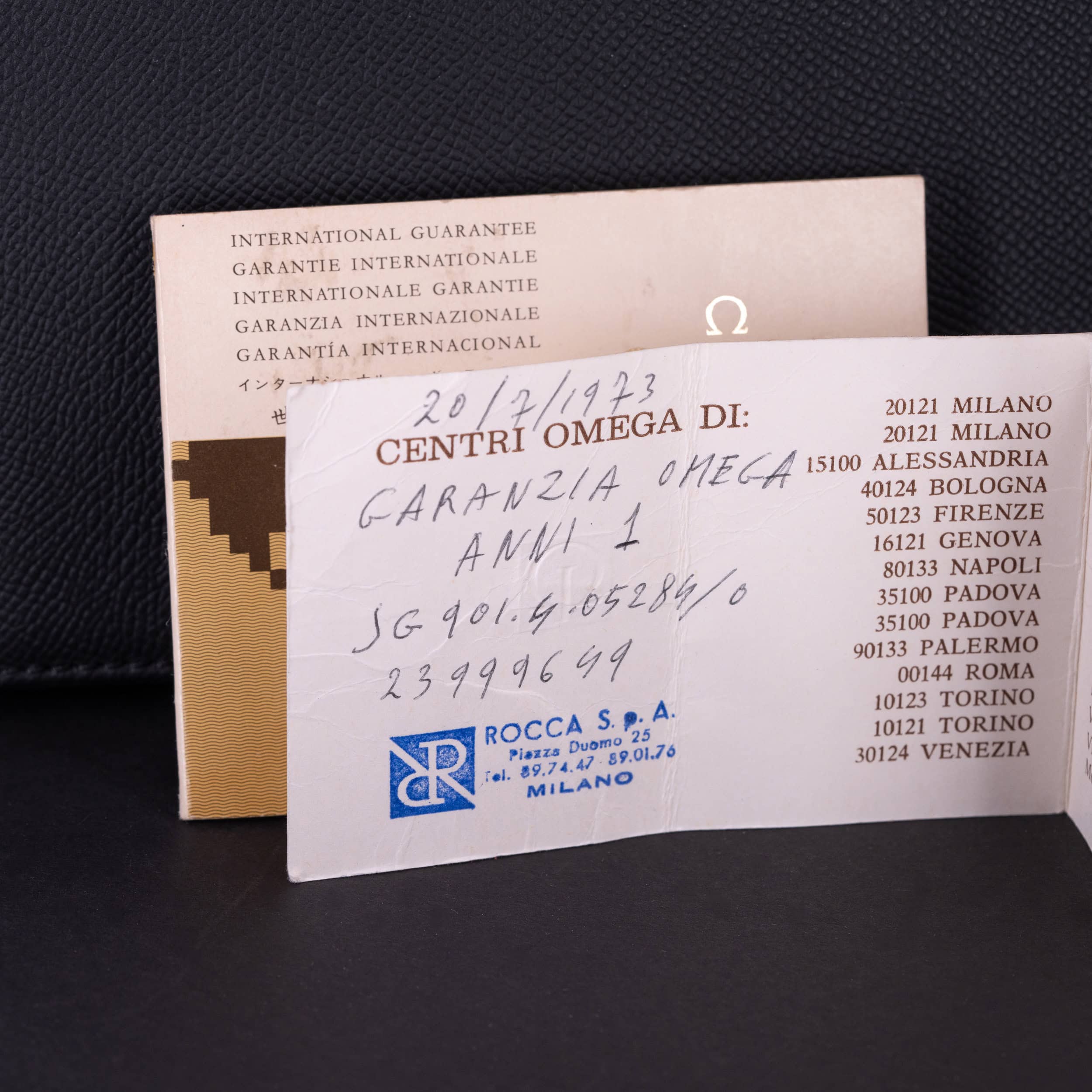 Mukana tulee Omegan punainen kellolaatikko, kellon alkuperäinen takuutodistus vuodelta 1973 (Rocca SPA, Milano), vaihtoehtoinen samppanja-kellotaulu sekä takuuvihko.