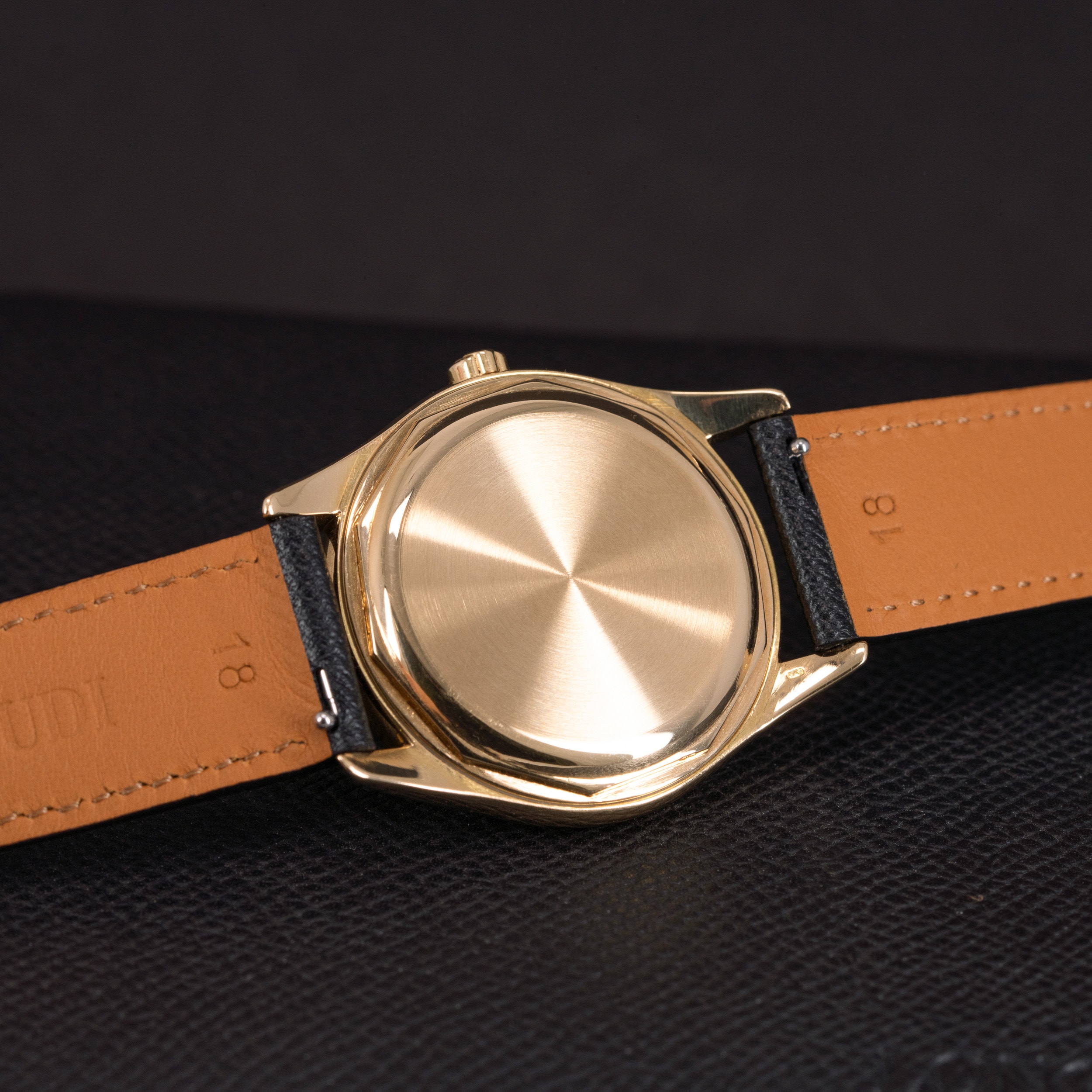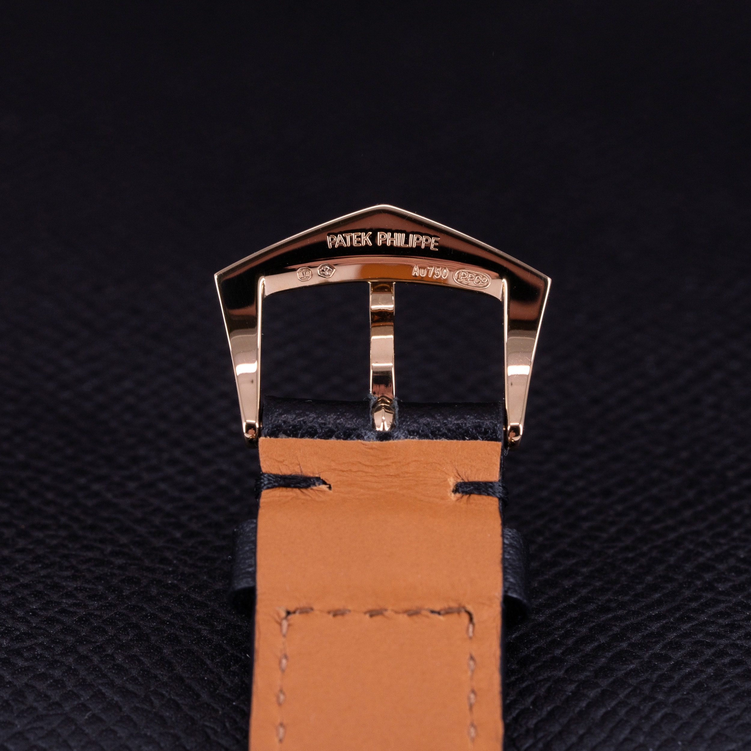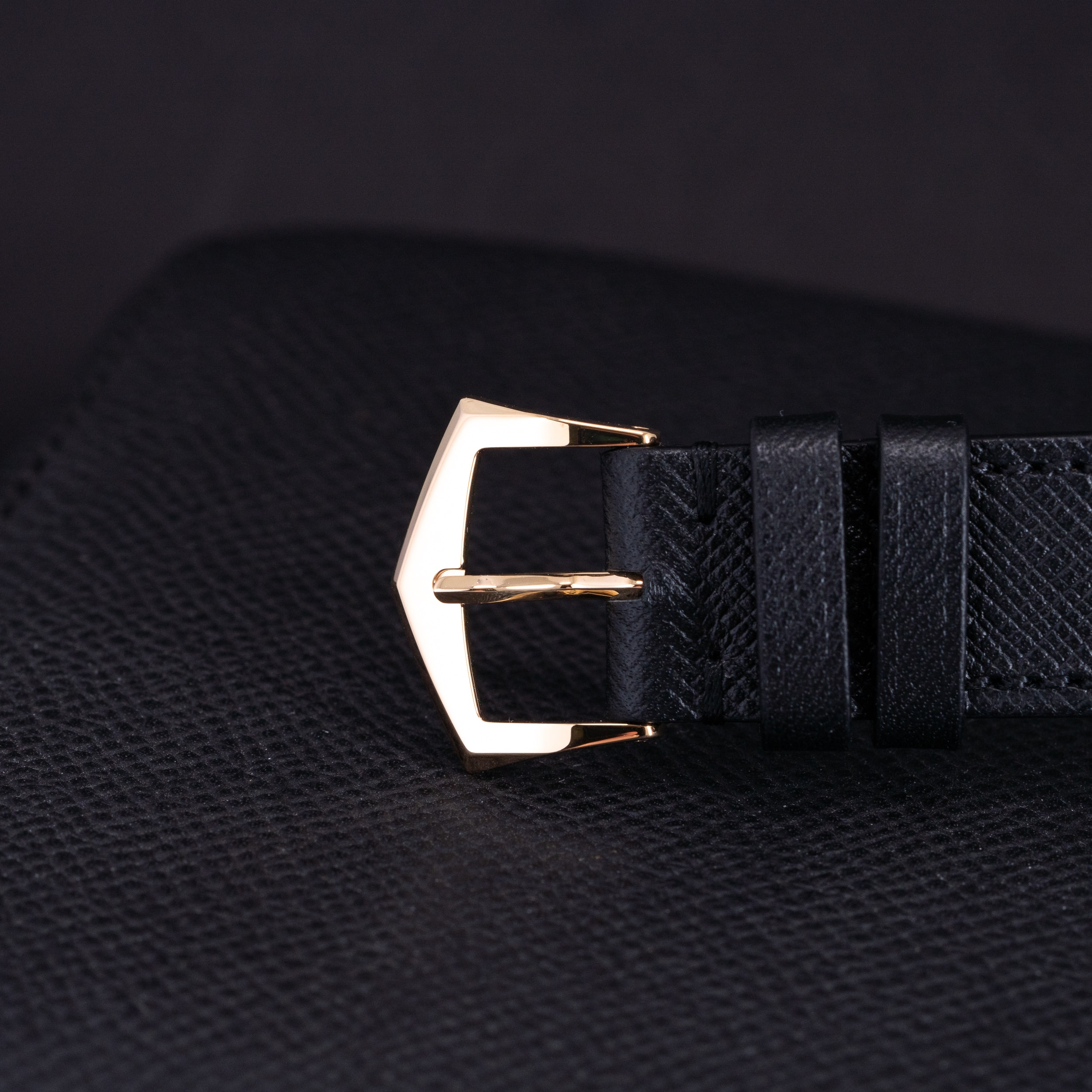 Musta Saffiano-ranneke on meidän omasta mallistosta. Ranteessa on Patek Philippen 18k kultainen solki.