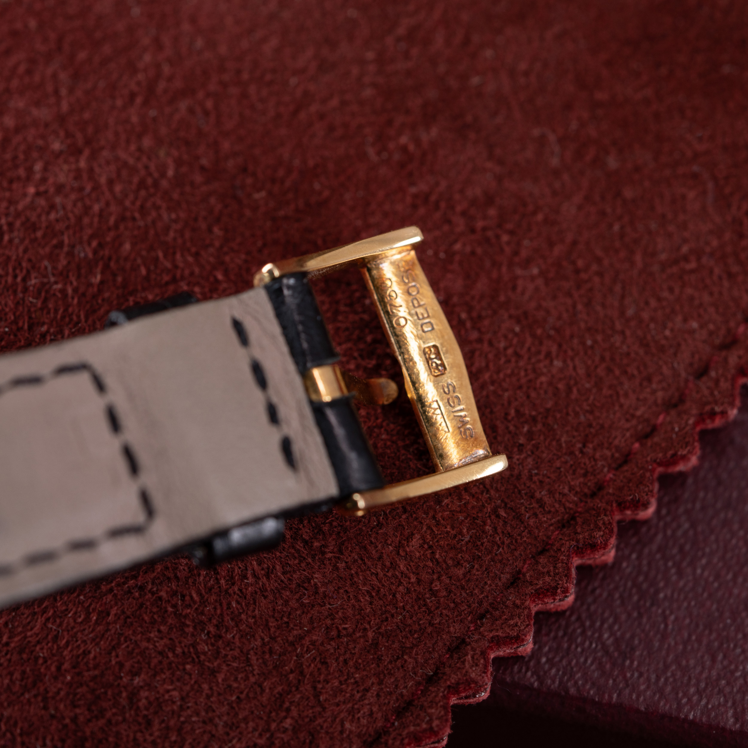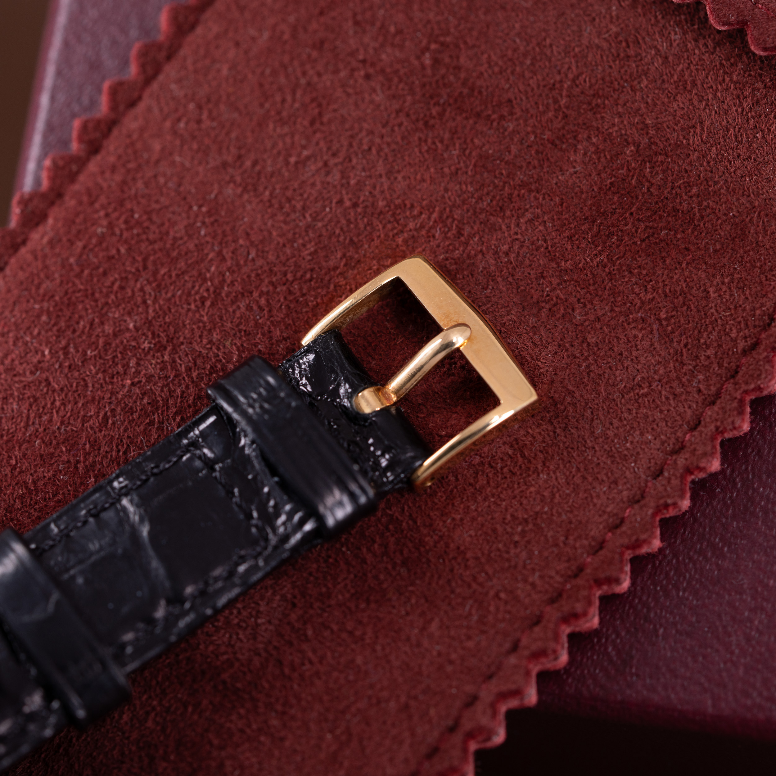 Kellossa on Patek Philippen alligaattori ranneke ja ranteessa PP:n 18k kultasolki.