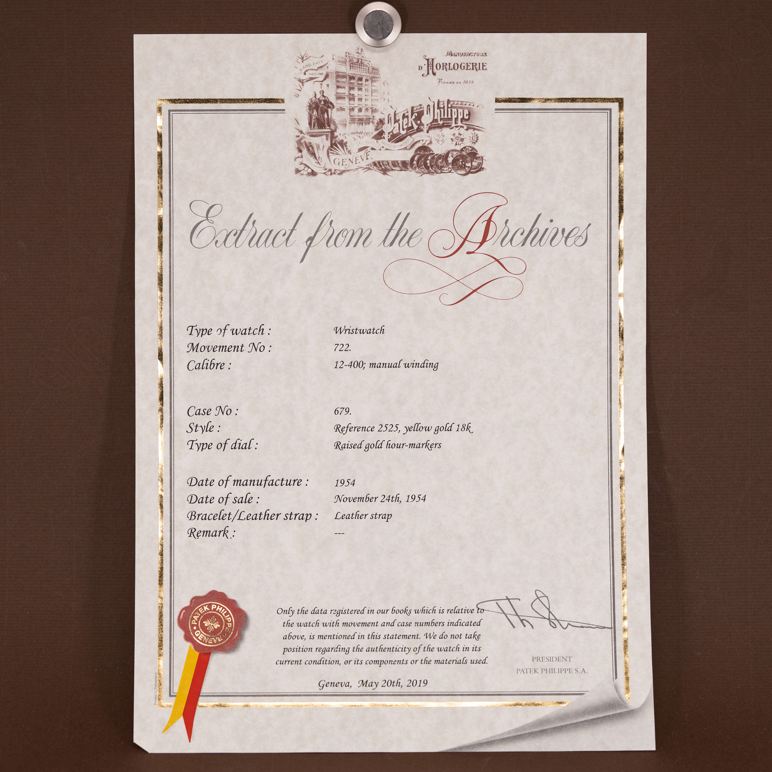 Kellon mukana tulee Patek Philippen kangaspussi ja suojakotelo. Mukana on myös Patek Philippe museon Extract-from-Archives -dokumentti jonka mukaan kello on alunperin myyty 24.11.1954.