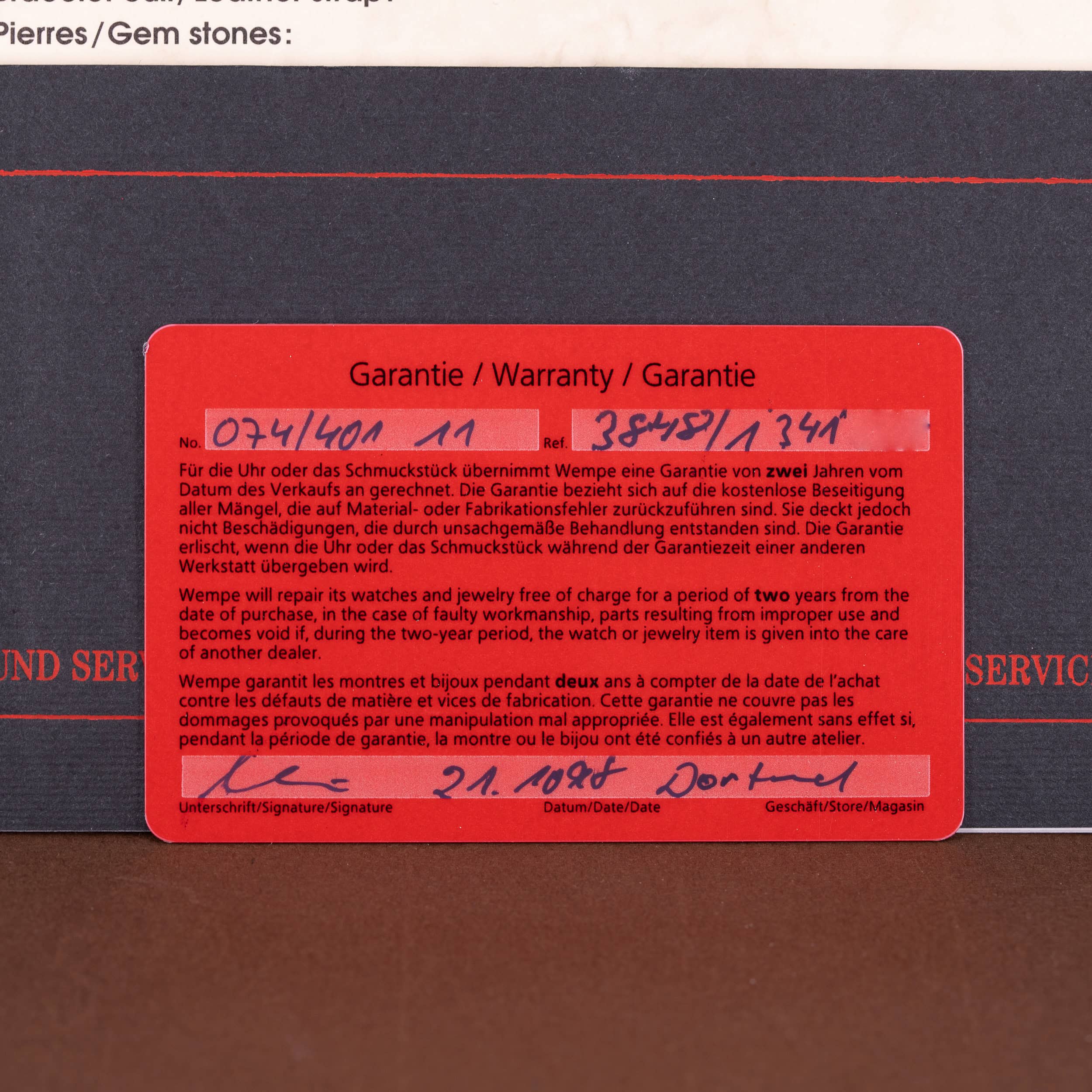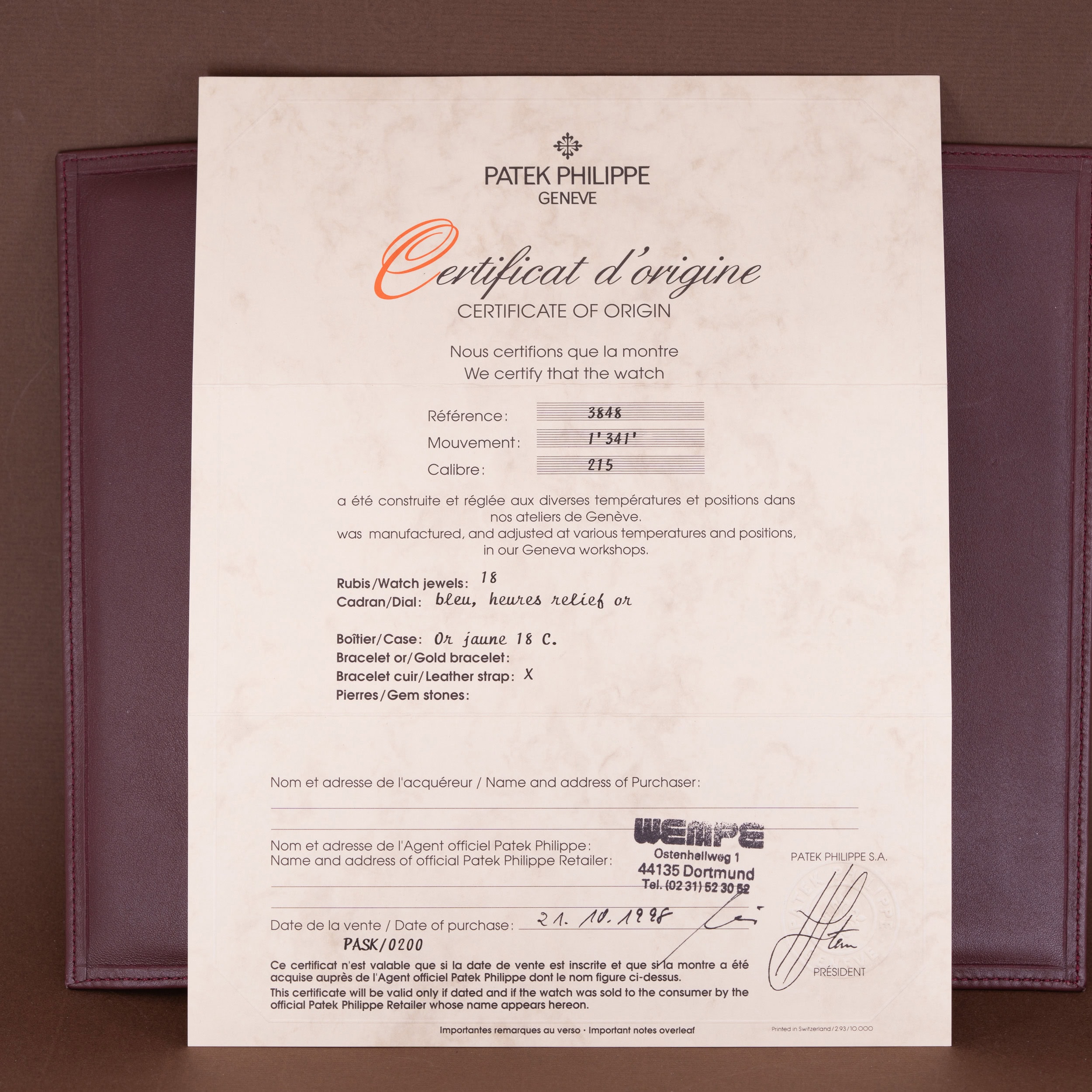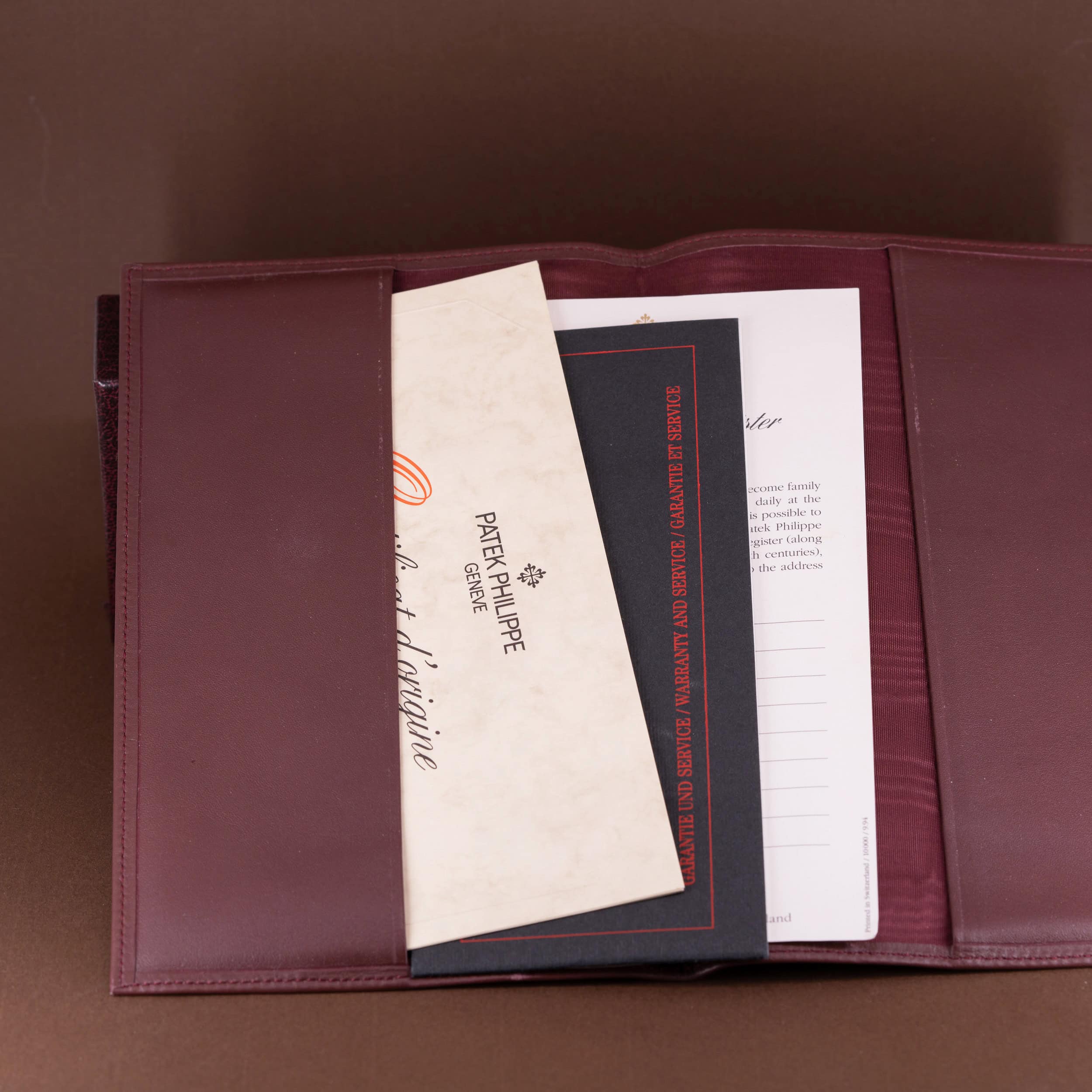 Kellon mukana tulee Patek Philippen kellolaatikko (sisä ja ulko), nahkainen dokumenttivihko, Patekin Certificate-of-Origin -dokumentti, Wempen takuukortti ja -vihko, ym. Kello on alunperin ostettu Wempen -liikkeestä Dortmundista 21.10.1998.