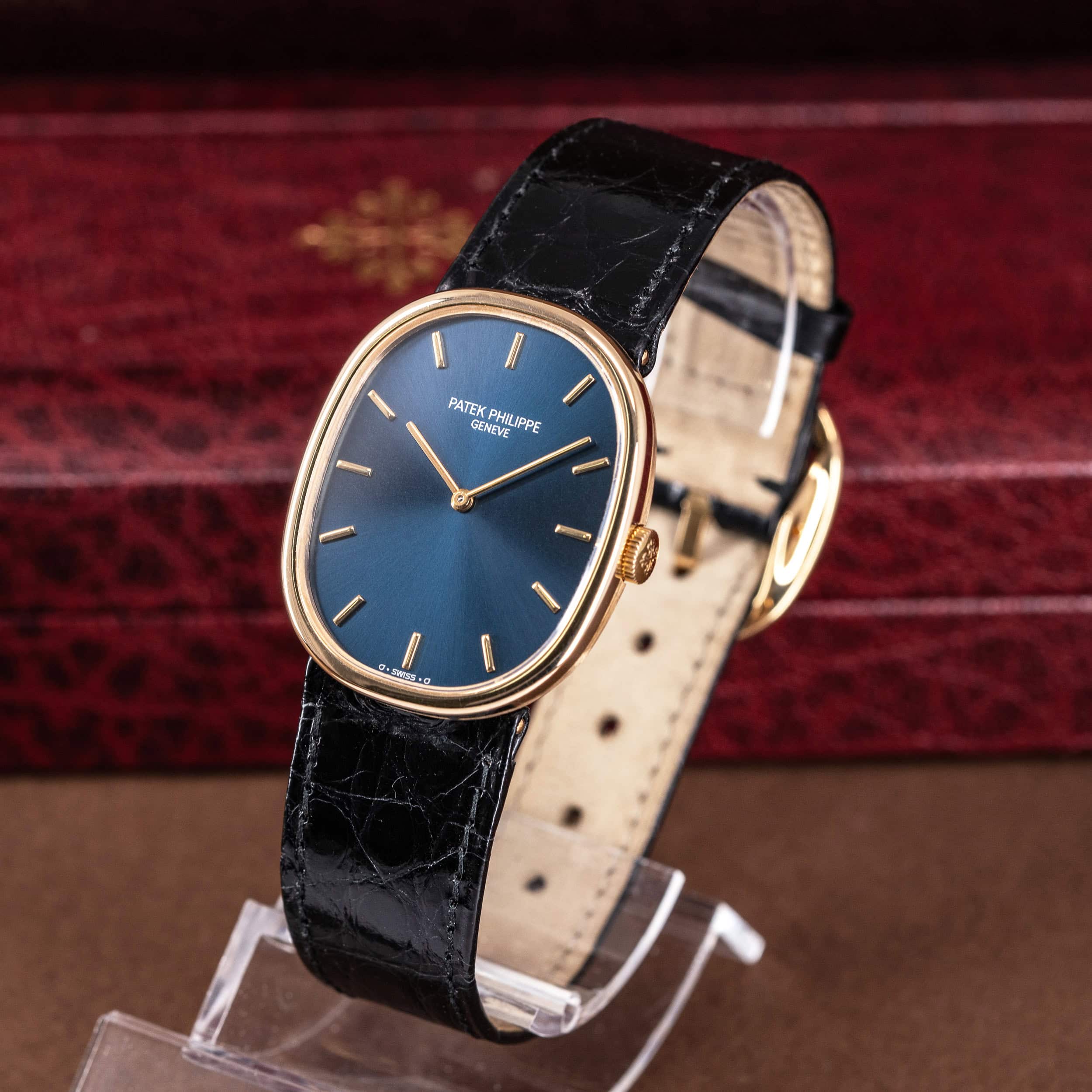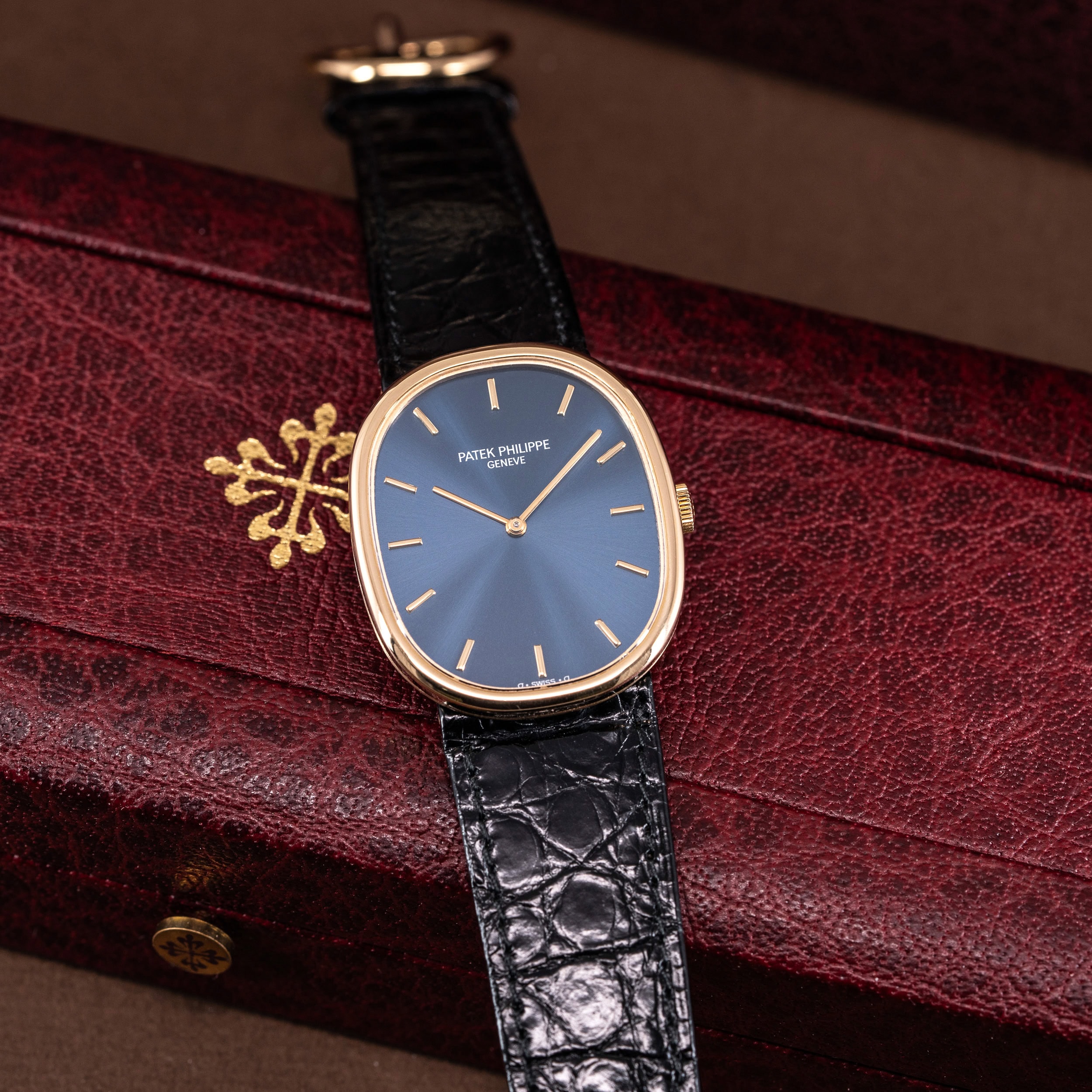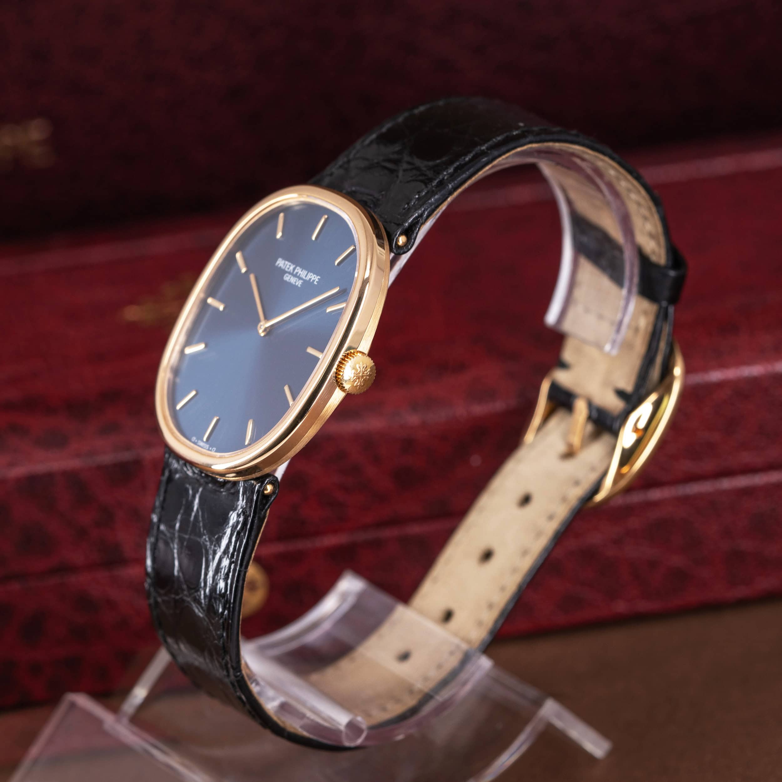 Kellossa on Patek Philippen alkuperäinen ohut krokotiilinahkainen ranneke. Ranteessa on Ellipse-mallin alkuperäinen 18k kultainen solki.