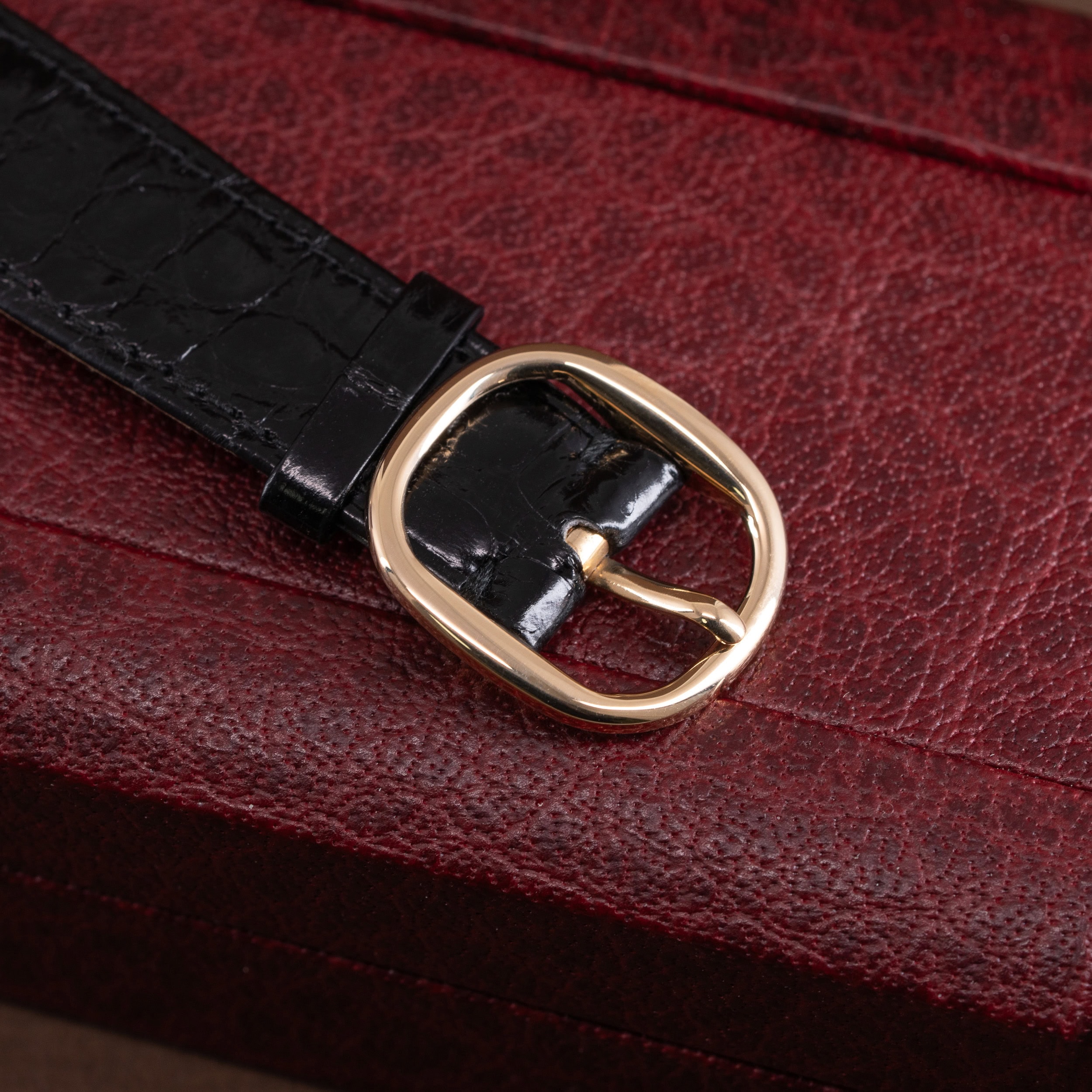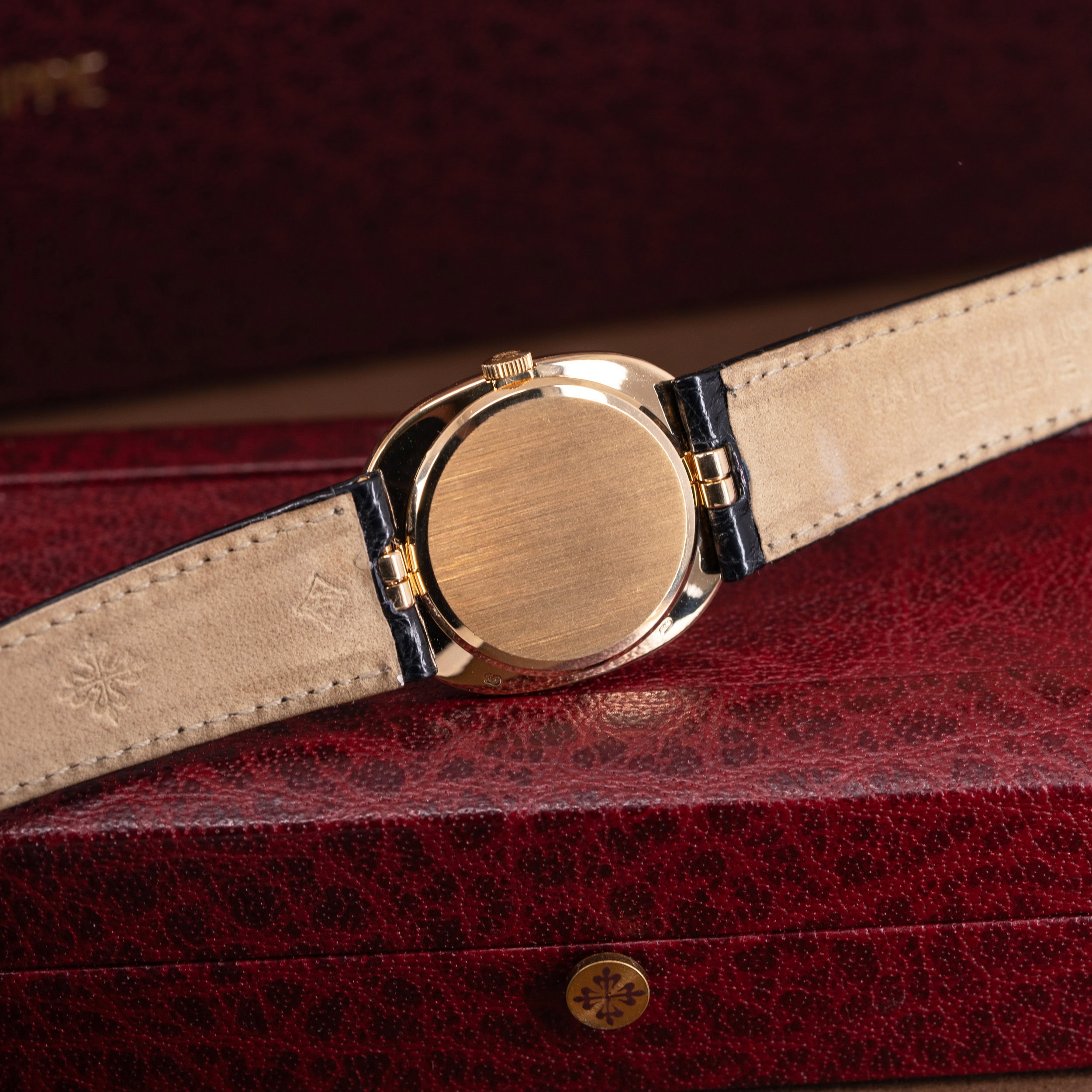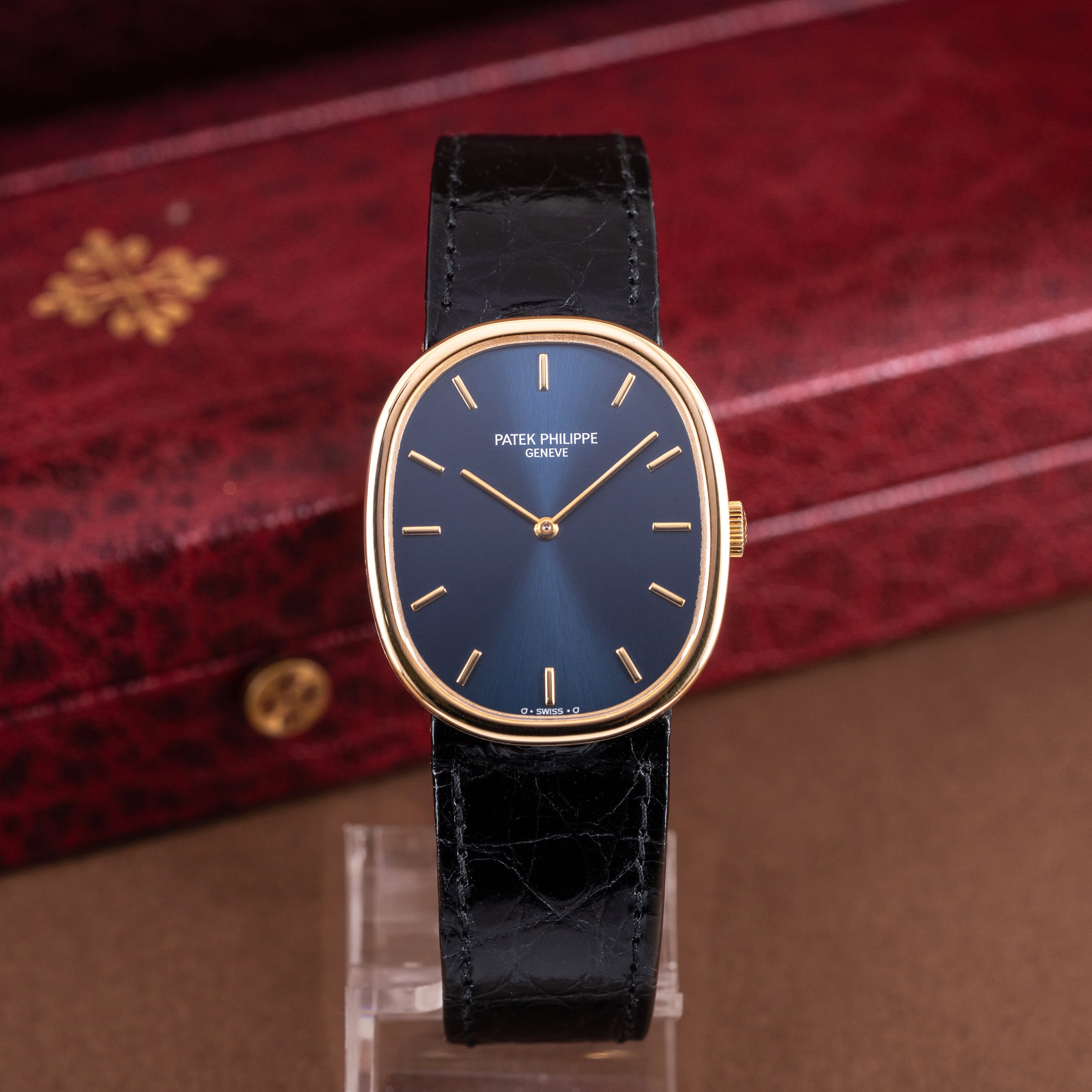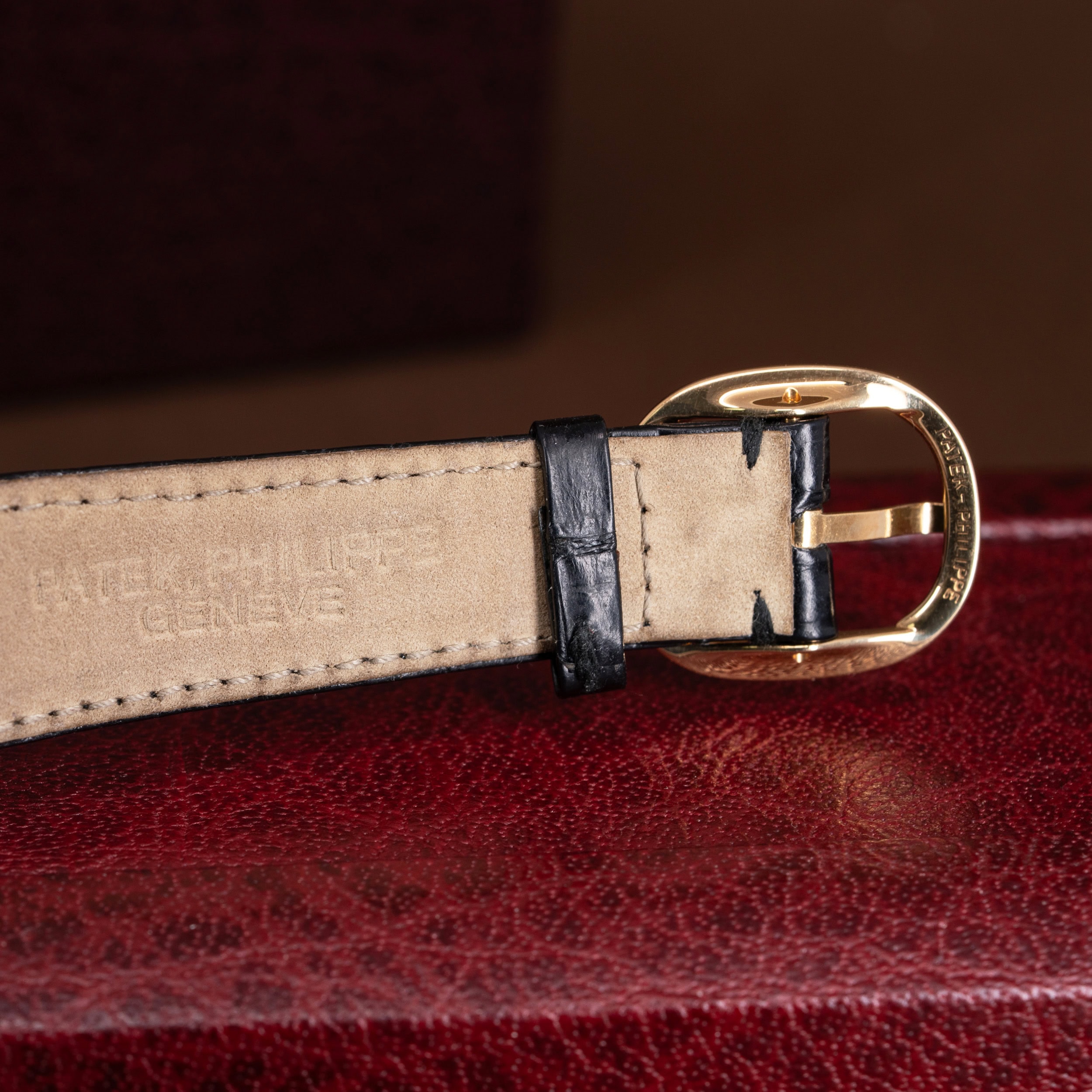 Kellossa on Patek Philippen alkuperäinen ohut krokotiilinahkainen ranneke. Ranteessa on Ellipse-mallin alkuperäinen 18k kultainen solki.