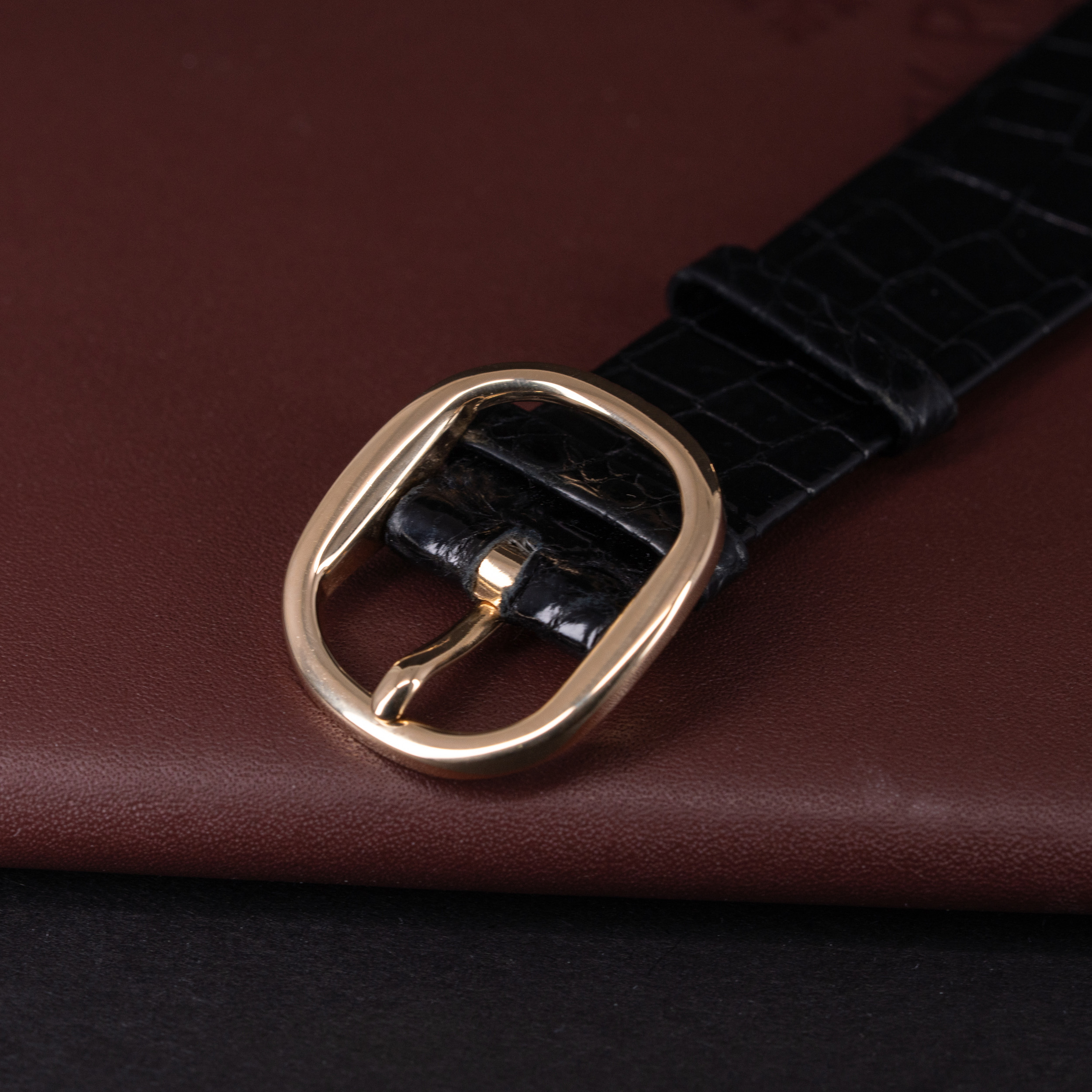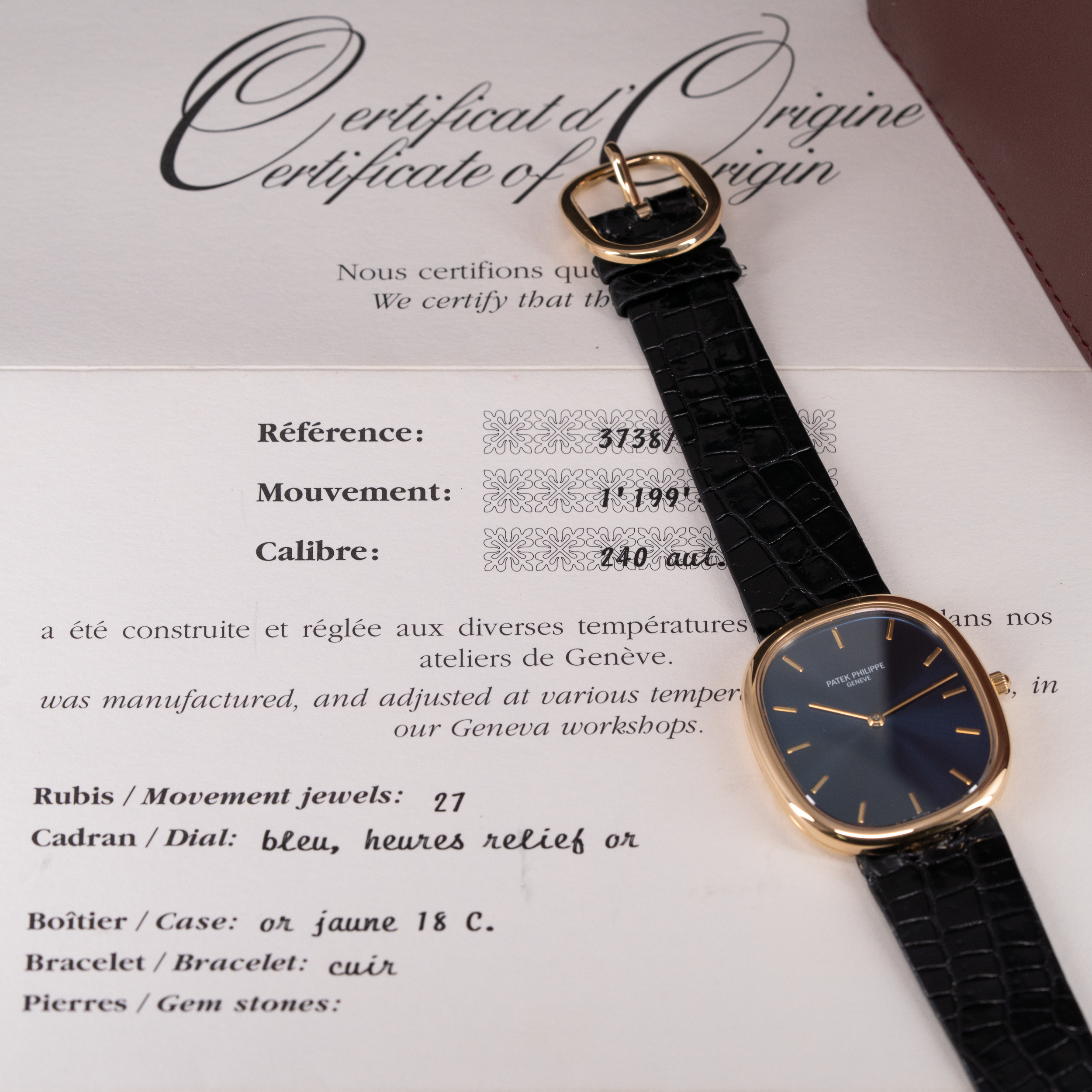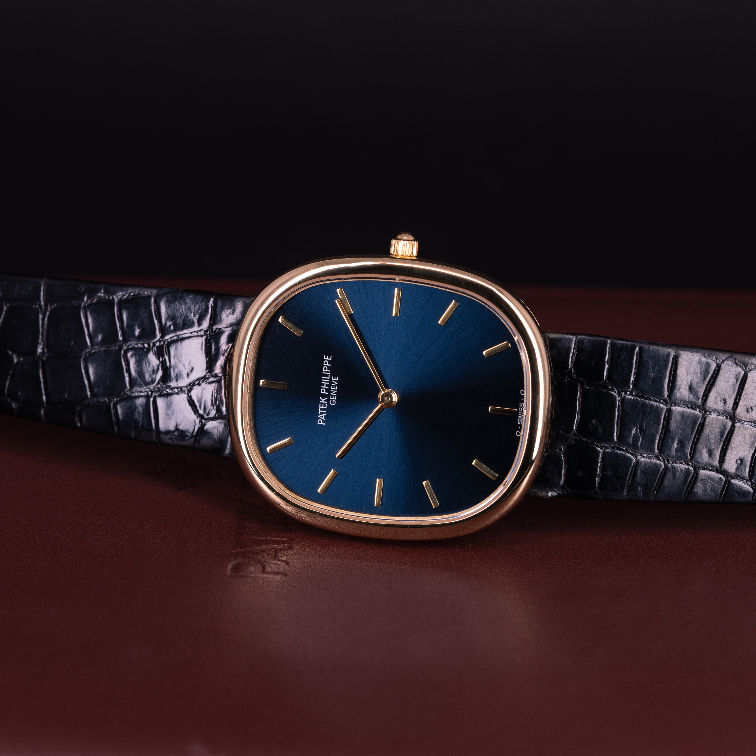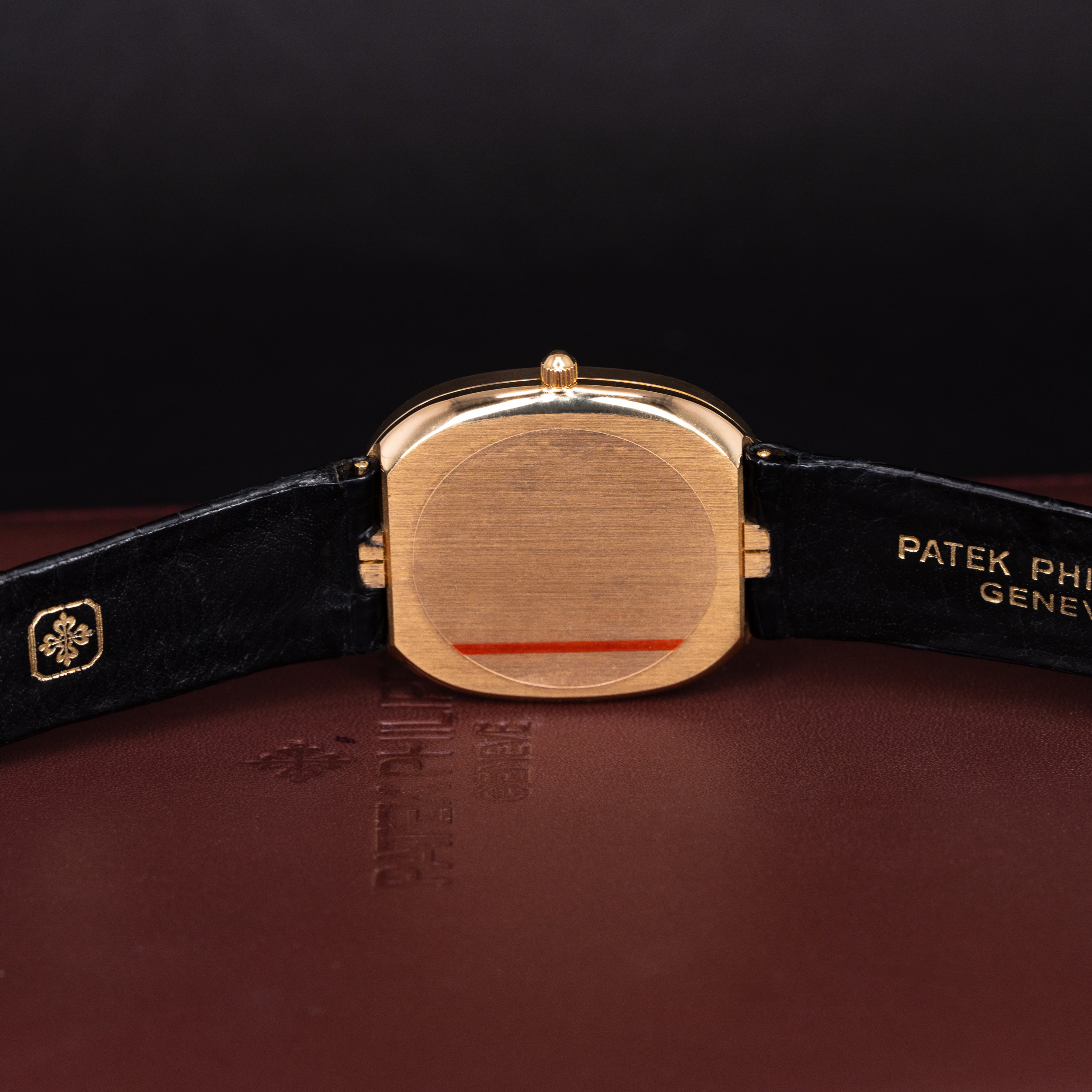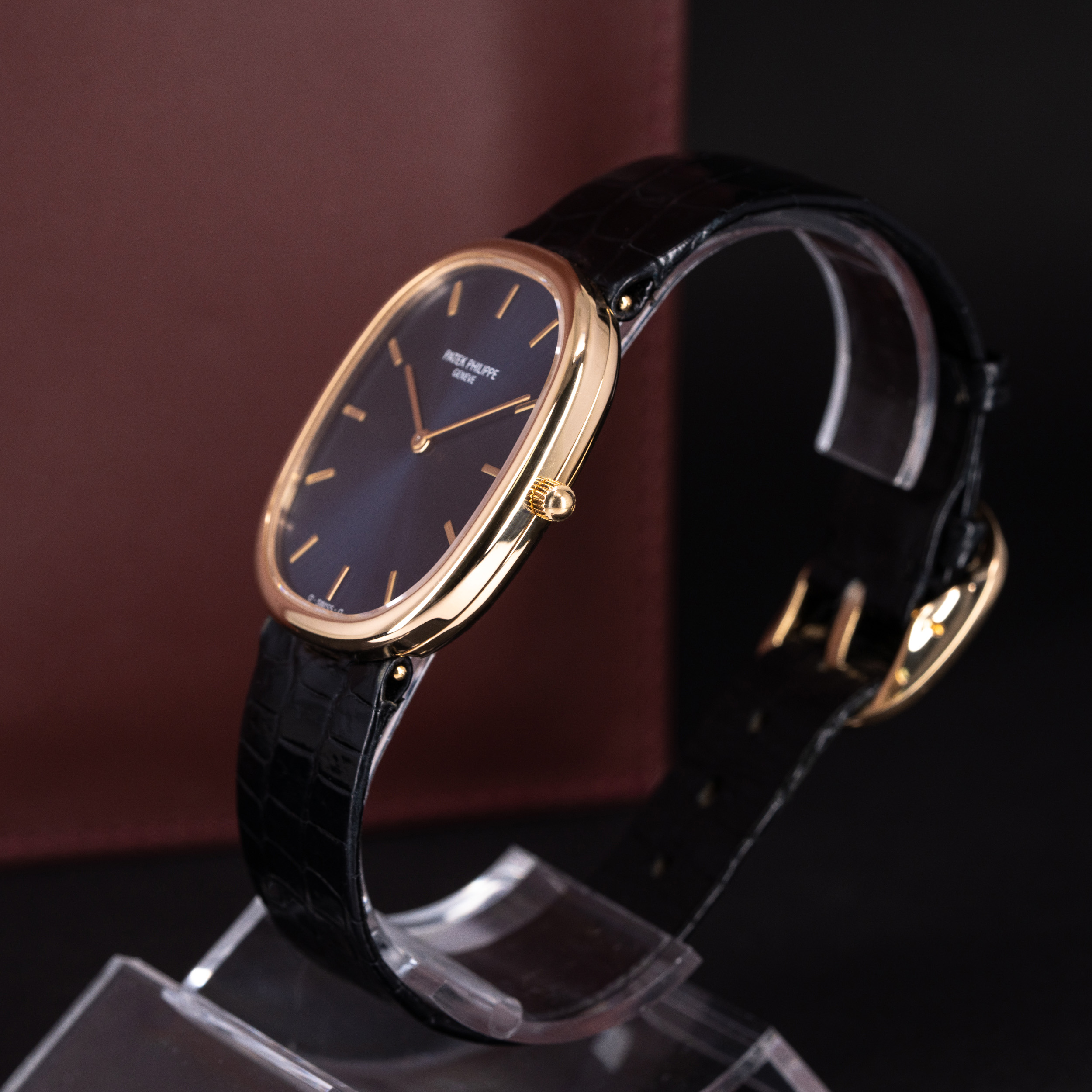 Kellossa on Patek Philippen alkuperäinen ohut alligaattori ranneke. Ranteessa on Ellipse-mallin alkuperäinen 18k kultainen solki.