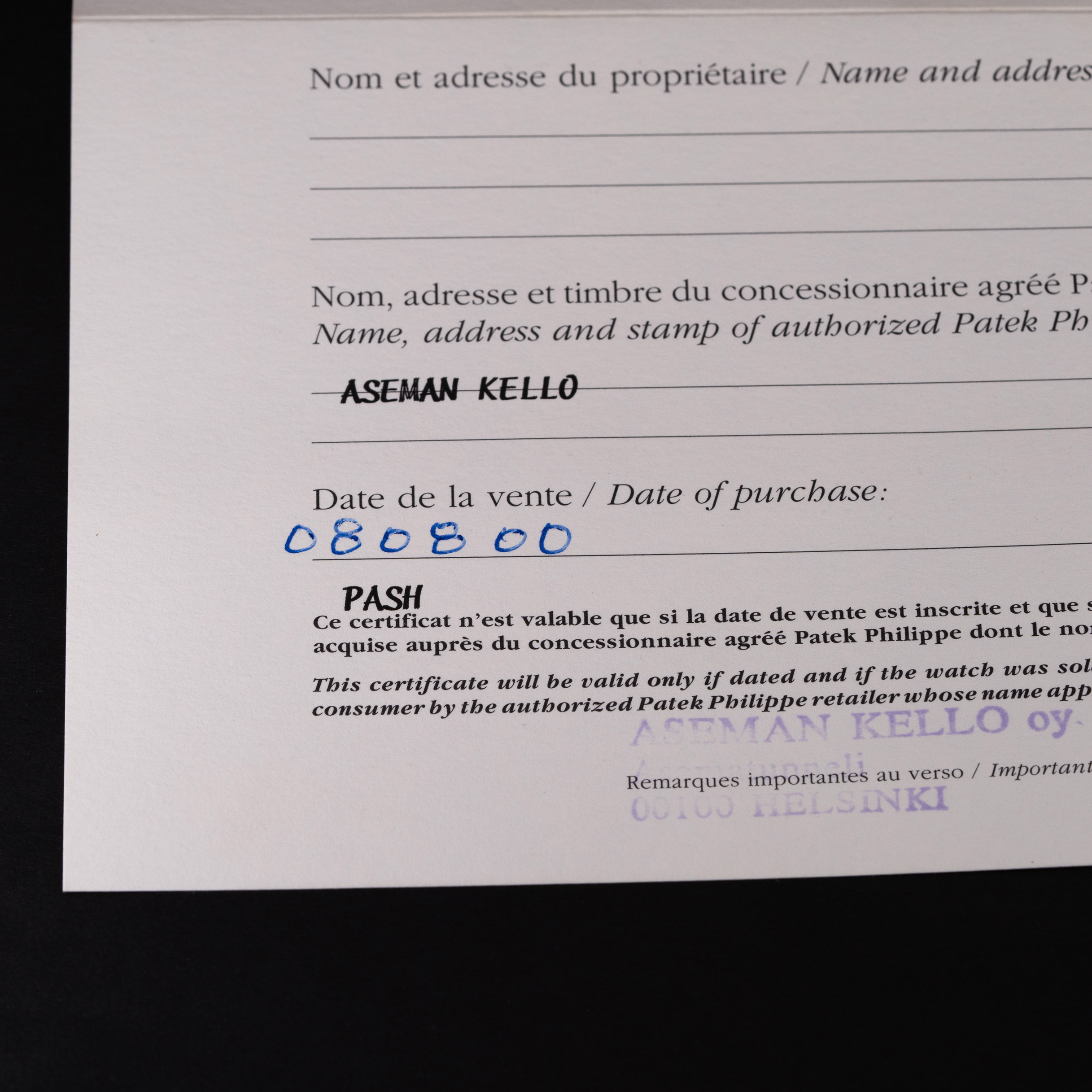 Kellon mukana tulee Patek Philippen suojapussi, nahkainen dokumenttivihko, Patekin Certificate-of-Origin -dokumentti, käyttöohjeet ja paljon muuta. Kello on alunperin ostettu Aseman Kello -liikkeestä Helsingistä 8.8.2000.