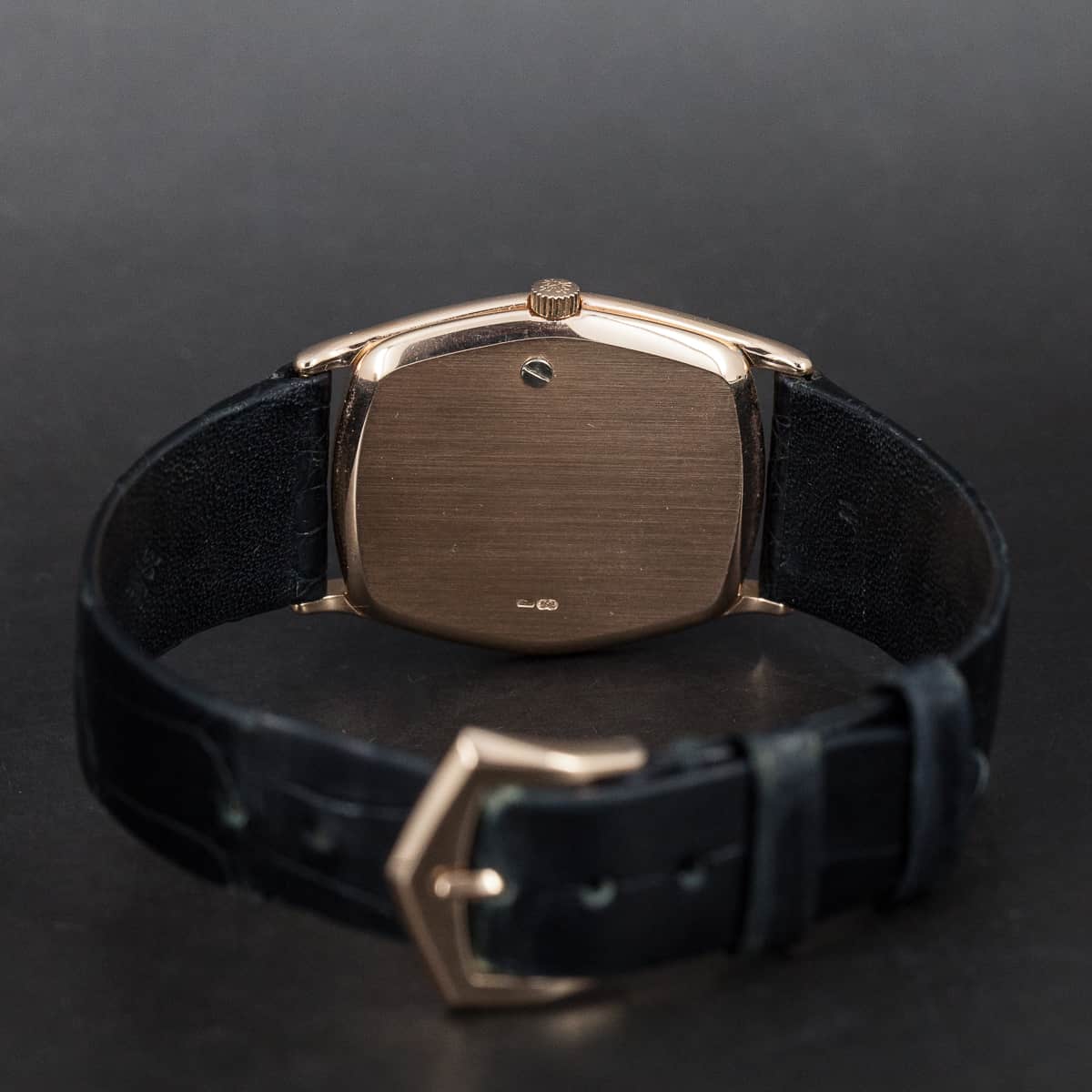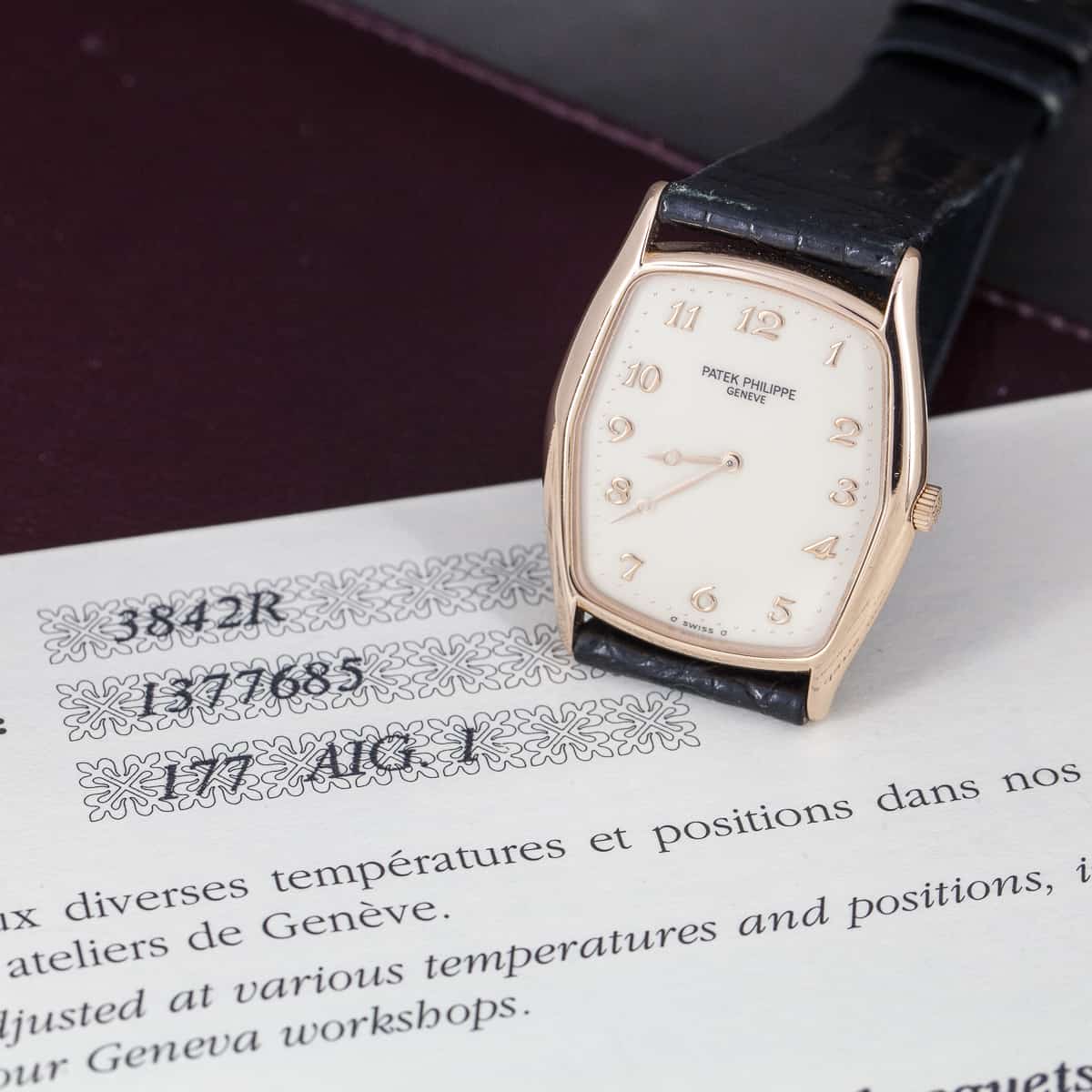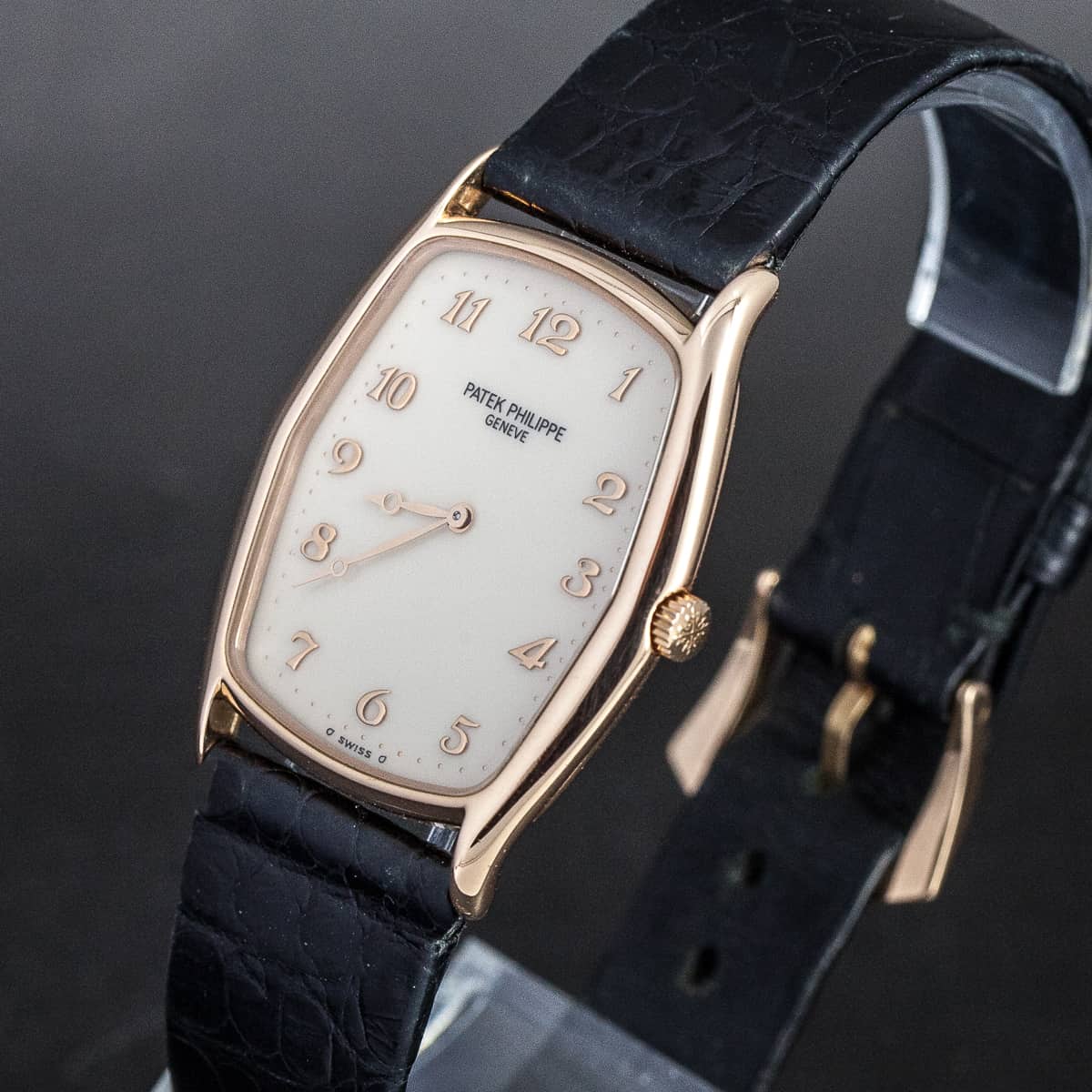 Ultraohut 18k ruusukultainen Patek Philippe Gondolo ref.3842R pukukello vuodelta 1998. Patek Philippen cal.177 AIG manuaalivetoinen koneisto,