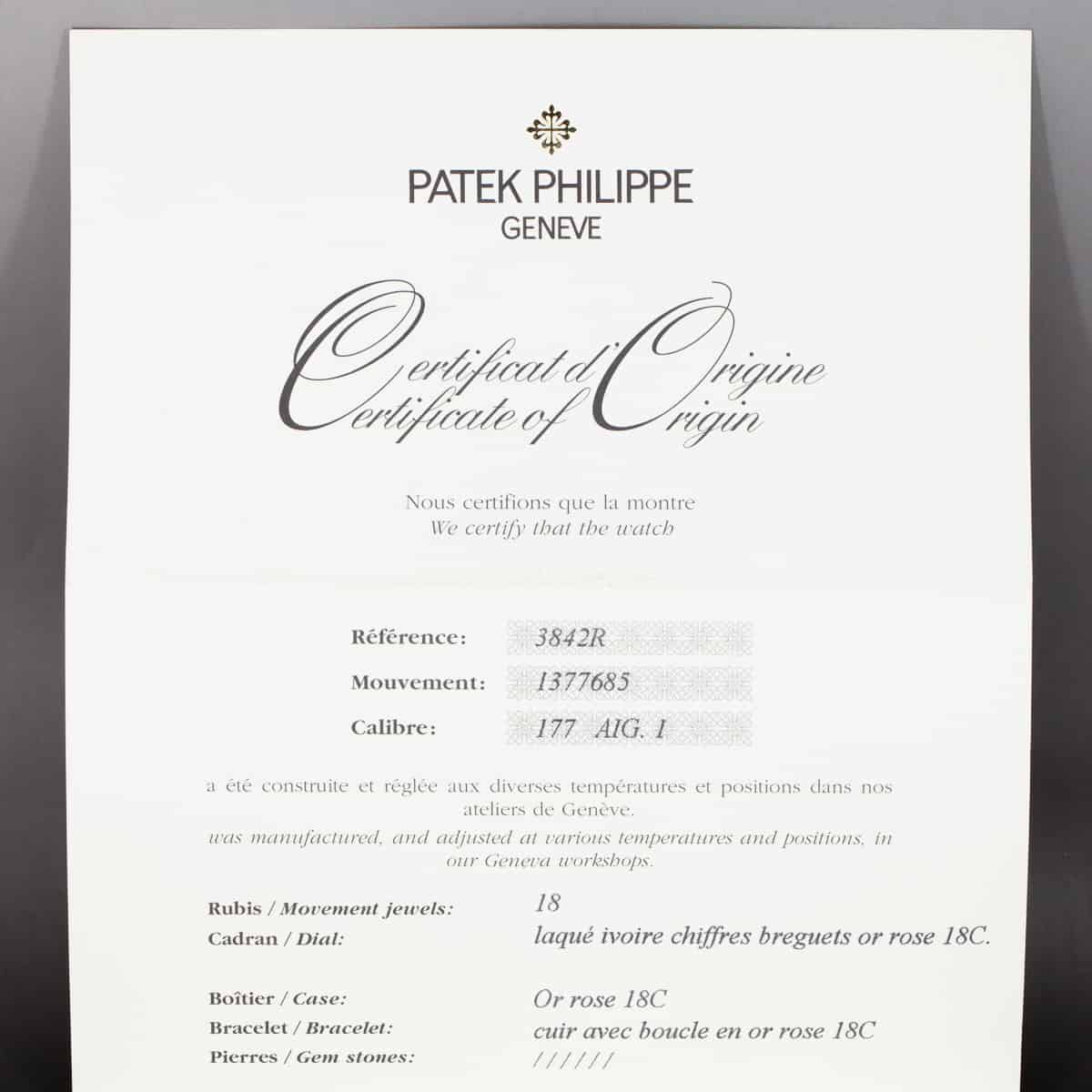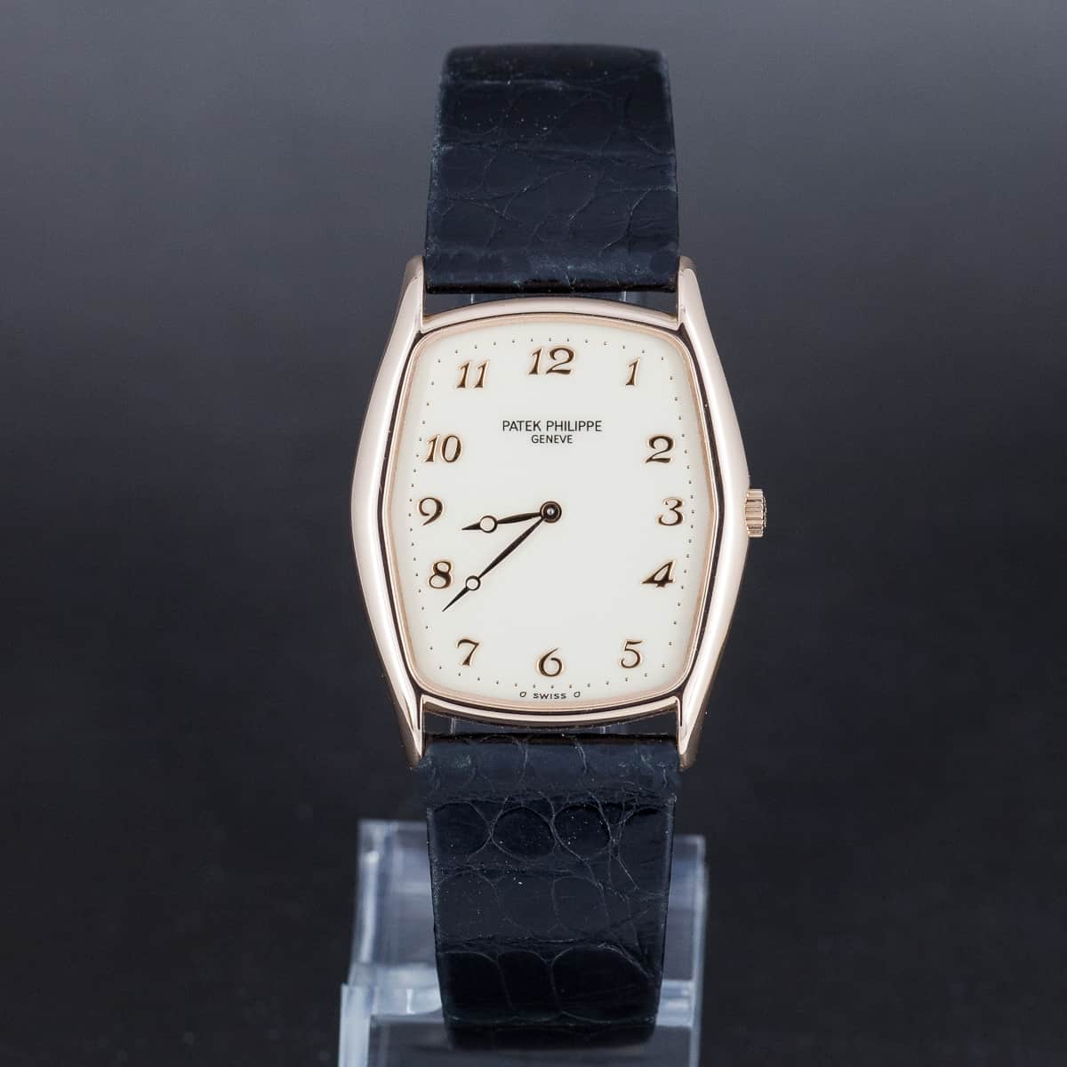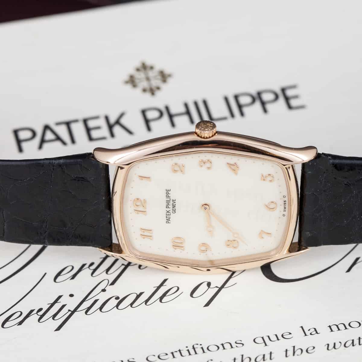 Ultraohut 18k ruusukultainen Patek Philippe Gondolo ref.3842R pukukello vuodelta 1998. Patek Philippen cal.177 AIG manuaalivetoinen koneisto,