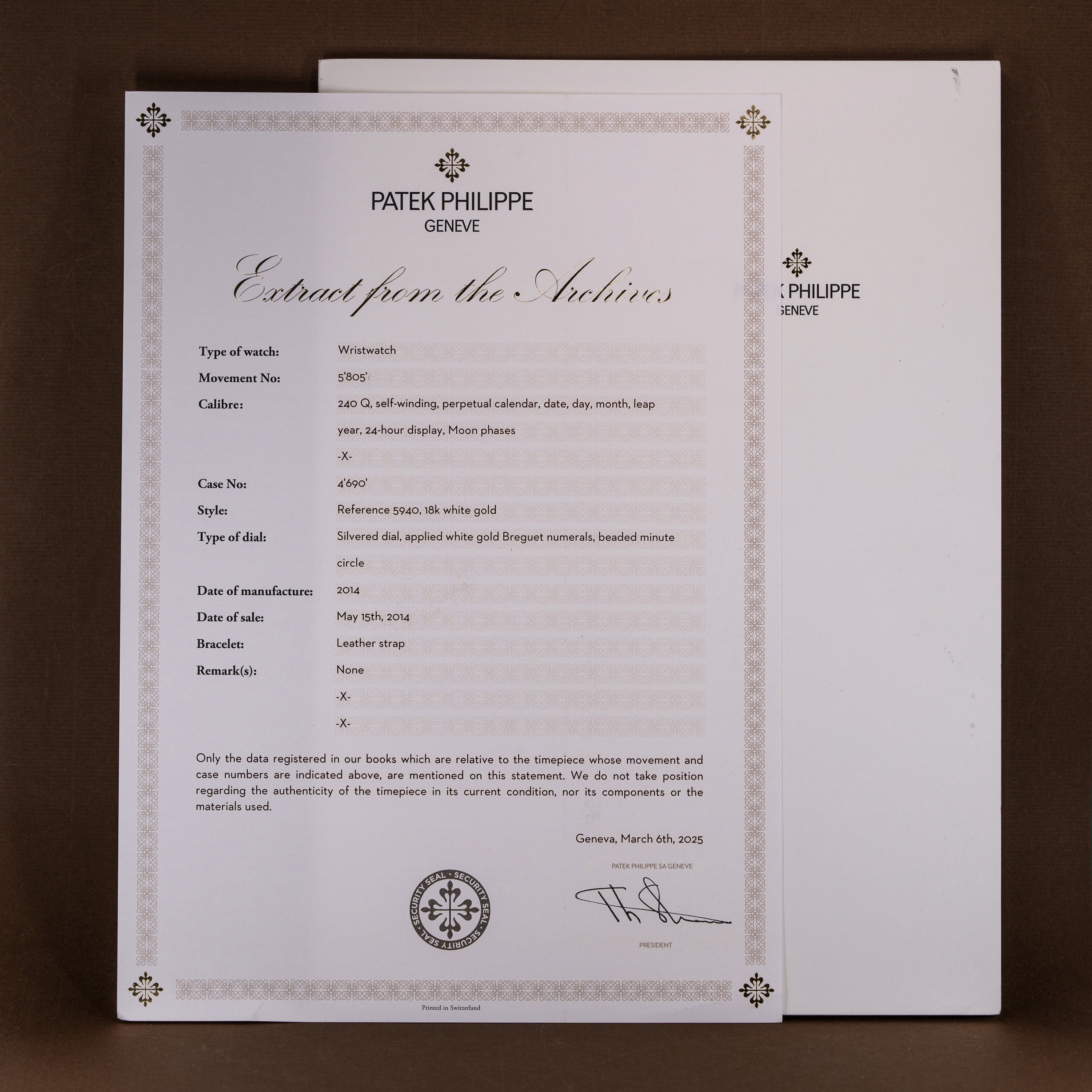 Kello toimitetaan Patek Philippen virheettömässä puulaatikossa (mukana sekä sisä että ulkolaatikot). Mukana on myös kellon alkuperäinen kalenterimekanismien korjauspainin. Tämän lisäksi kellon mukana tulee uudenveroinen Patek Philippen automaattivetäjä nahkakotelossa ja Patek Philippen museon Extract-from-Archives -todistus. Todistuksen mukaan kello on alunperin myyty 5/2014.