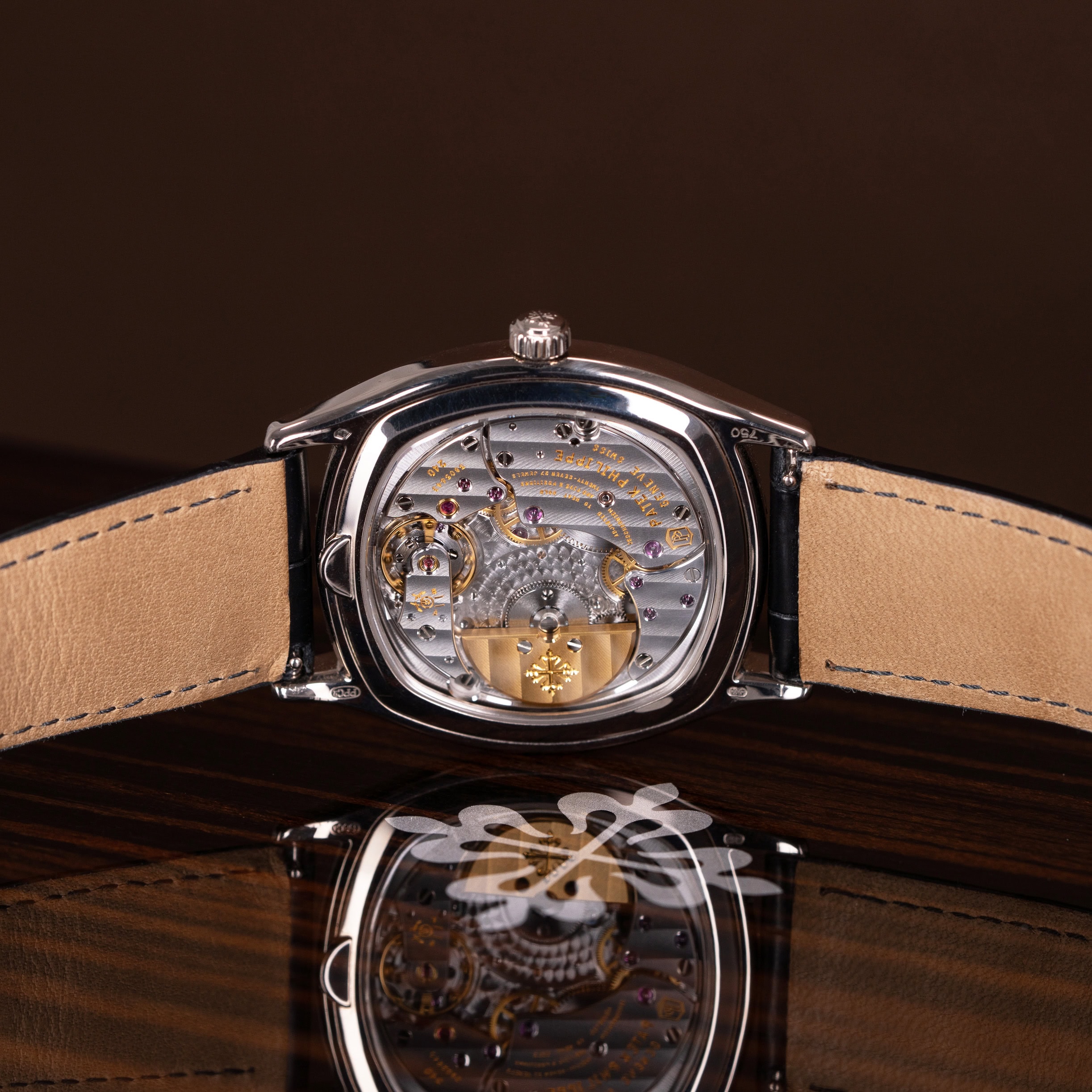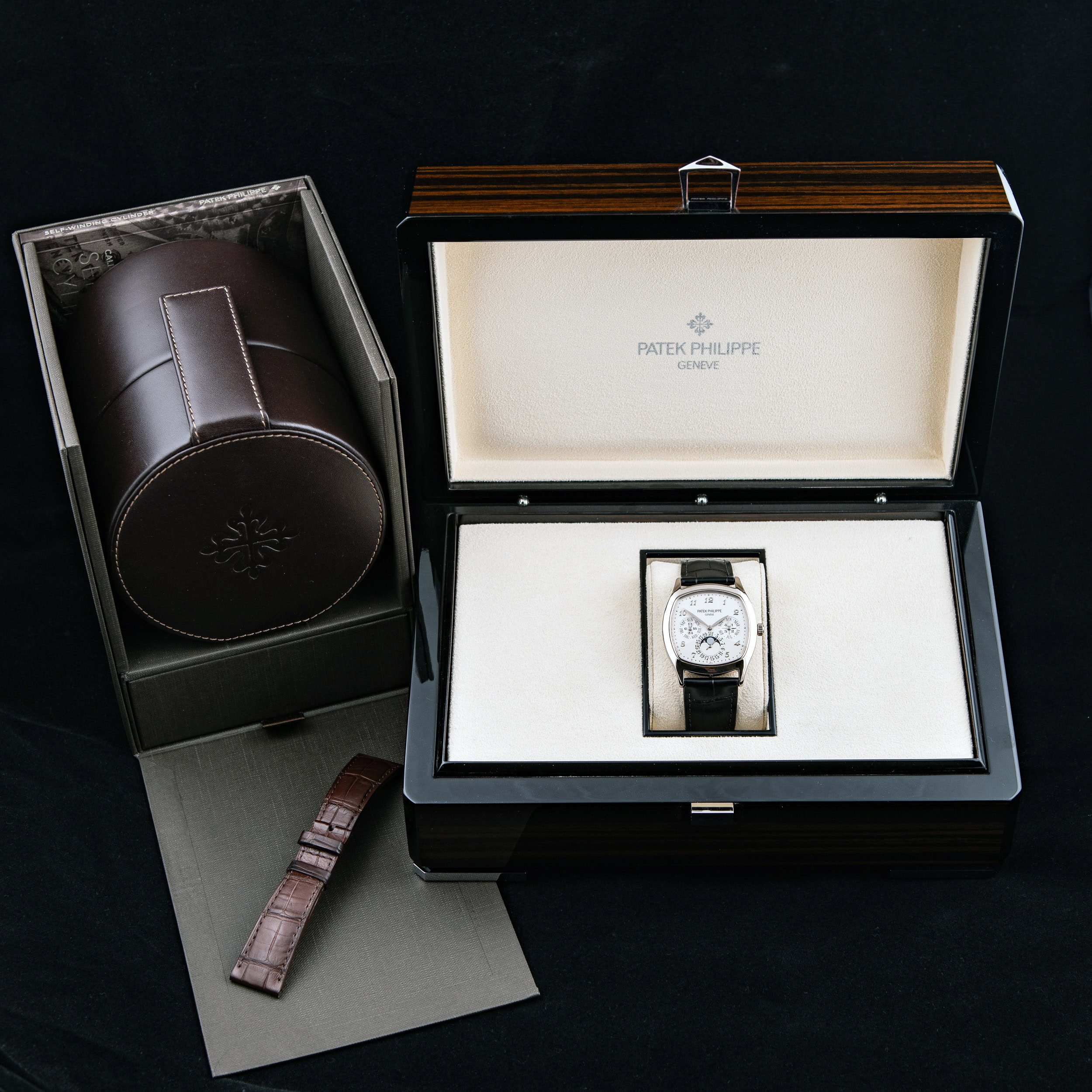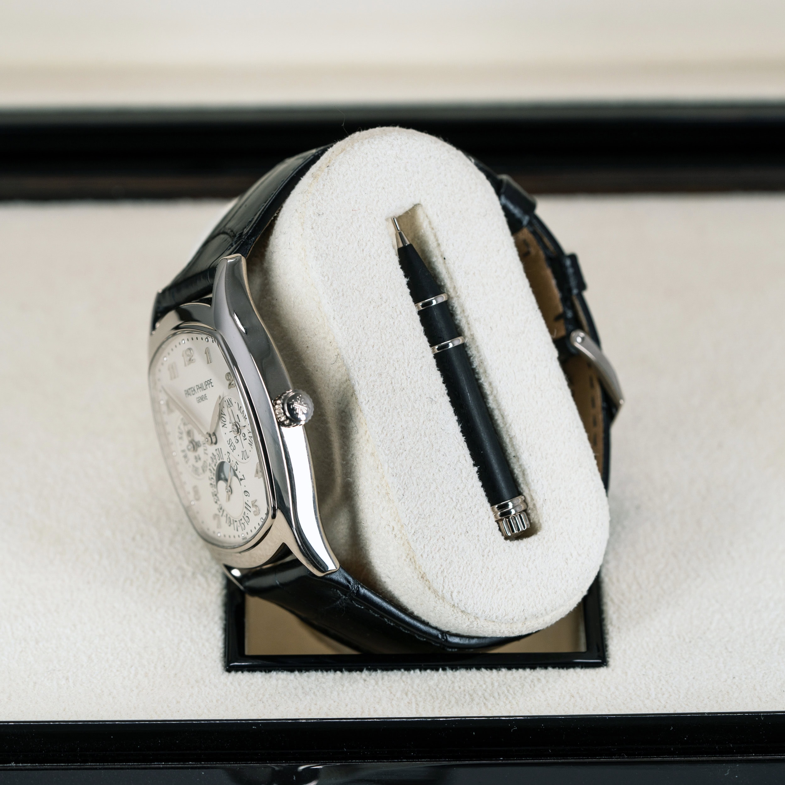 Kellon ranneke on mittatilauksena tätä kelloa varten tehty musta London Alligator malli ja ranteessa on PP.n alkuperäinen 18k valkokultainen solki. Mukana tulee myös lähes käyttämätön Patek Philippen oma ruskea alligaattori nahkaranneke.