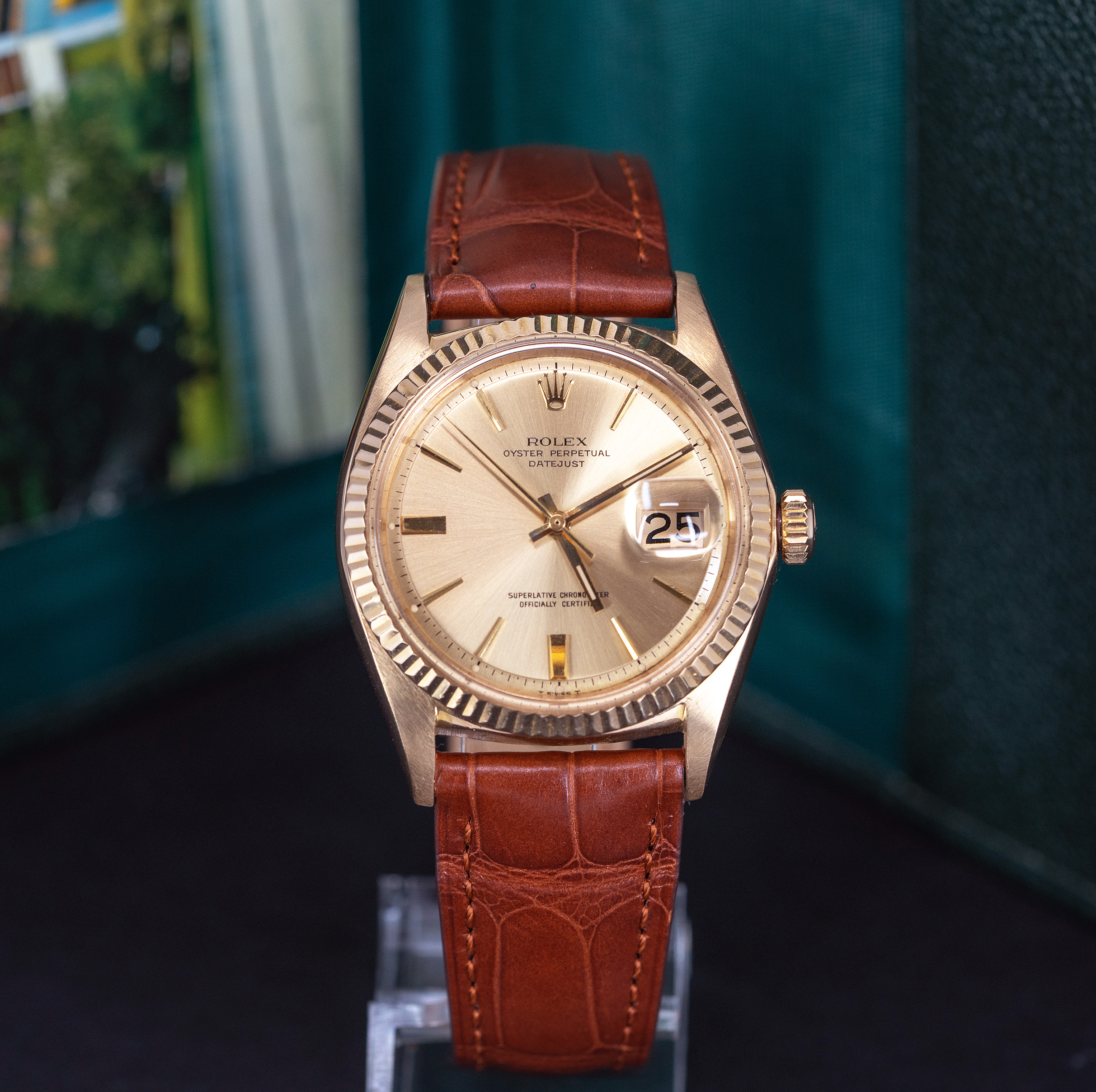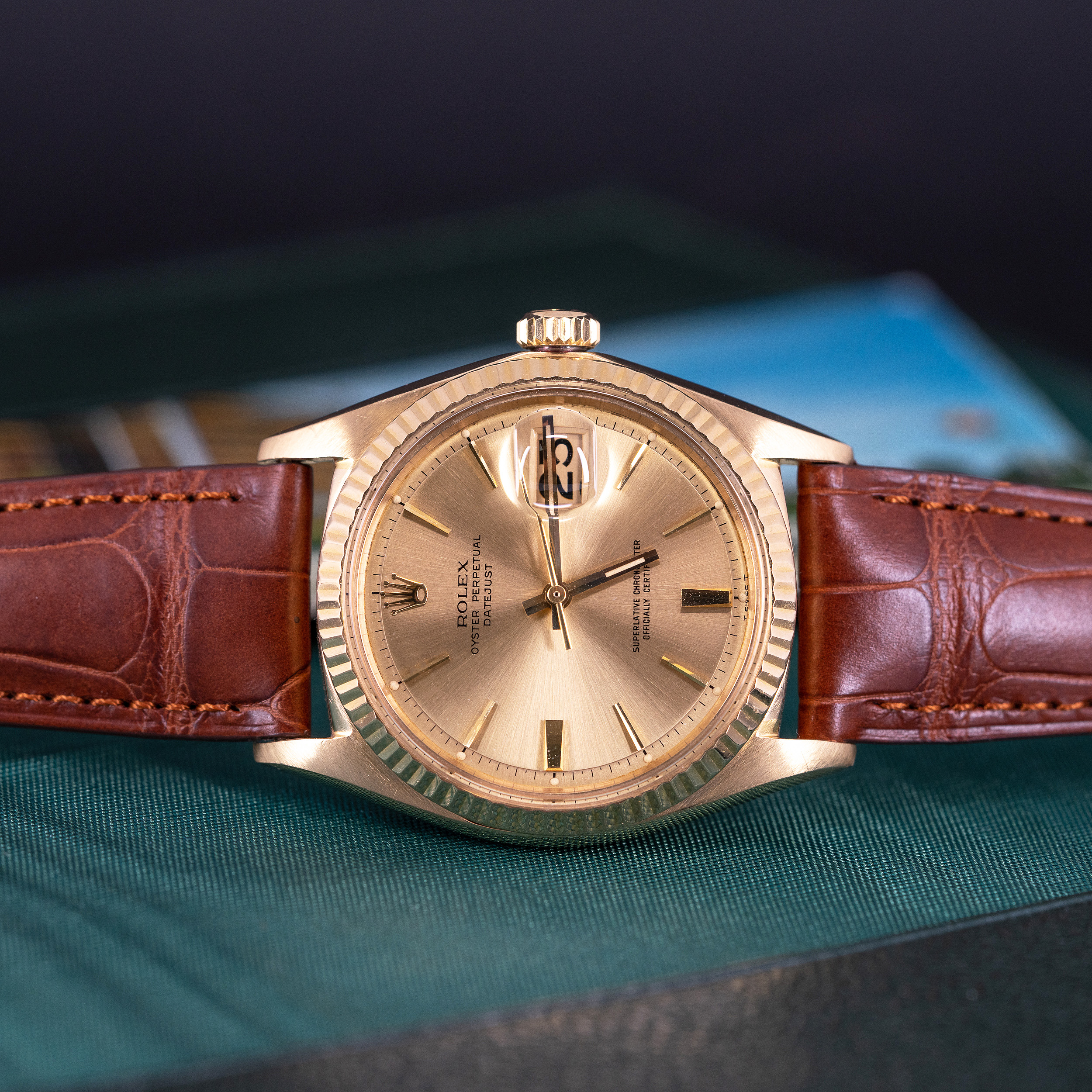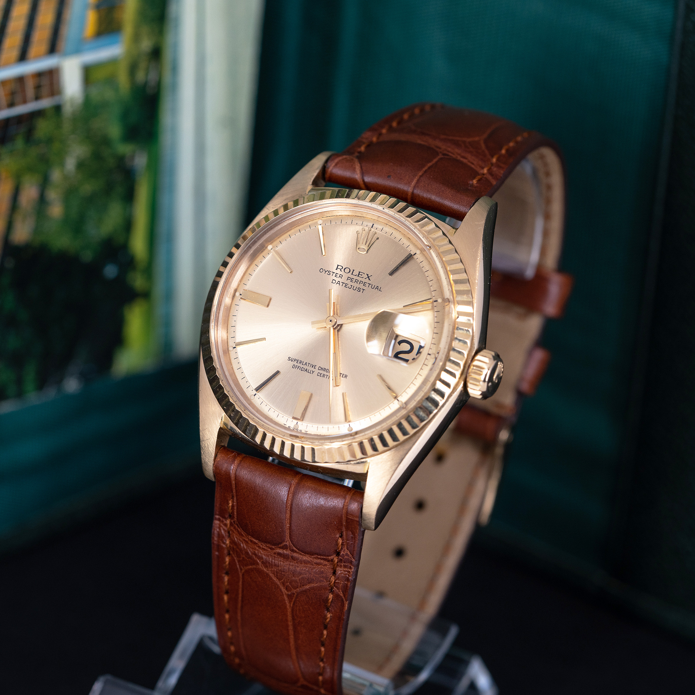 Huippukuntoinen Rolex Oyster Perpetual Datejust 1601 vuodelta 1968. Kellossa on virheetön kullanvärinen tritium-kellotaulu ja -osoittimet. 18k kultainen bezel ja 18k kultakuori on hyvässä kunnossa. Kuori on yhä vesitiivis, testattu +3.0/-0,7bar. Kuoren koko on 36mm.