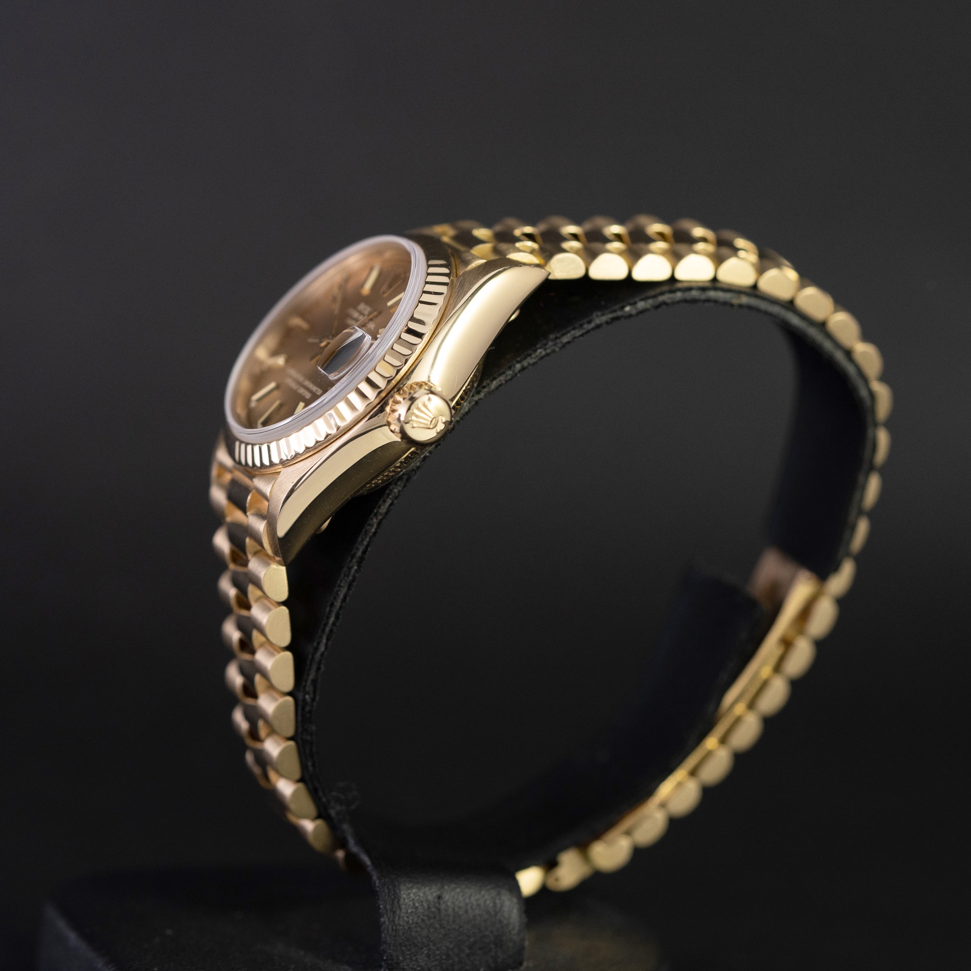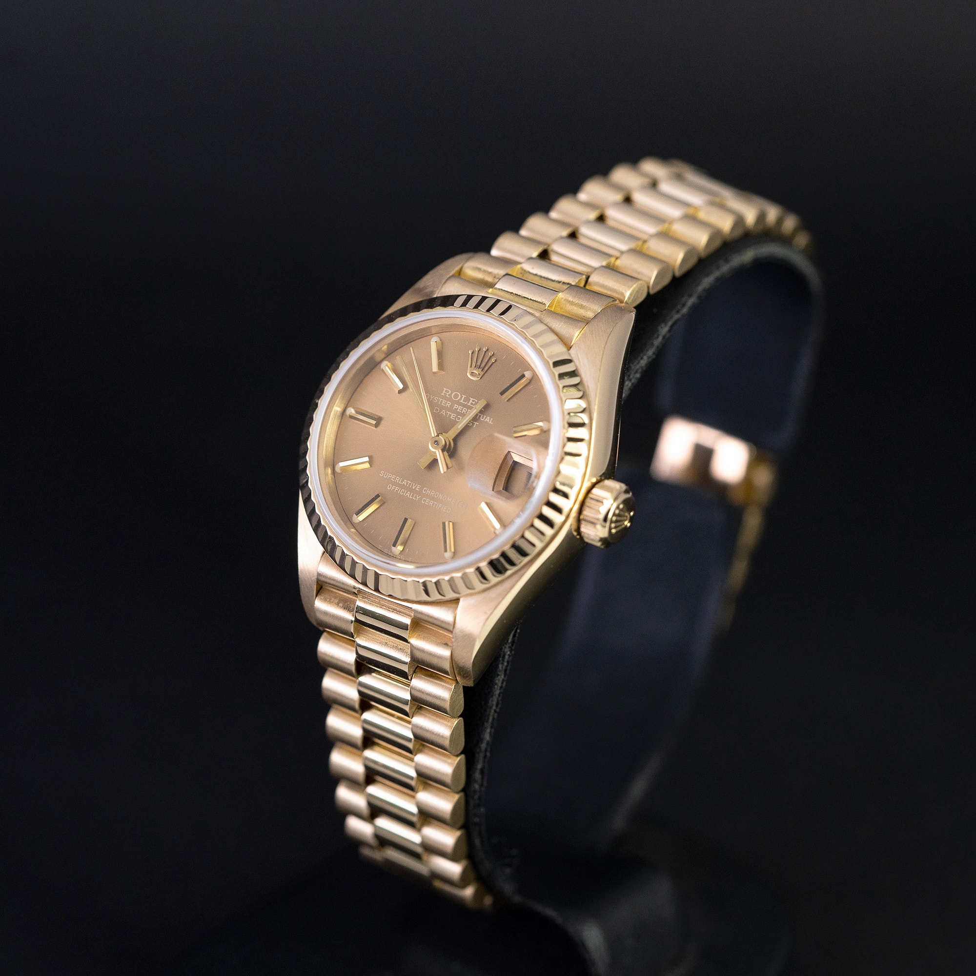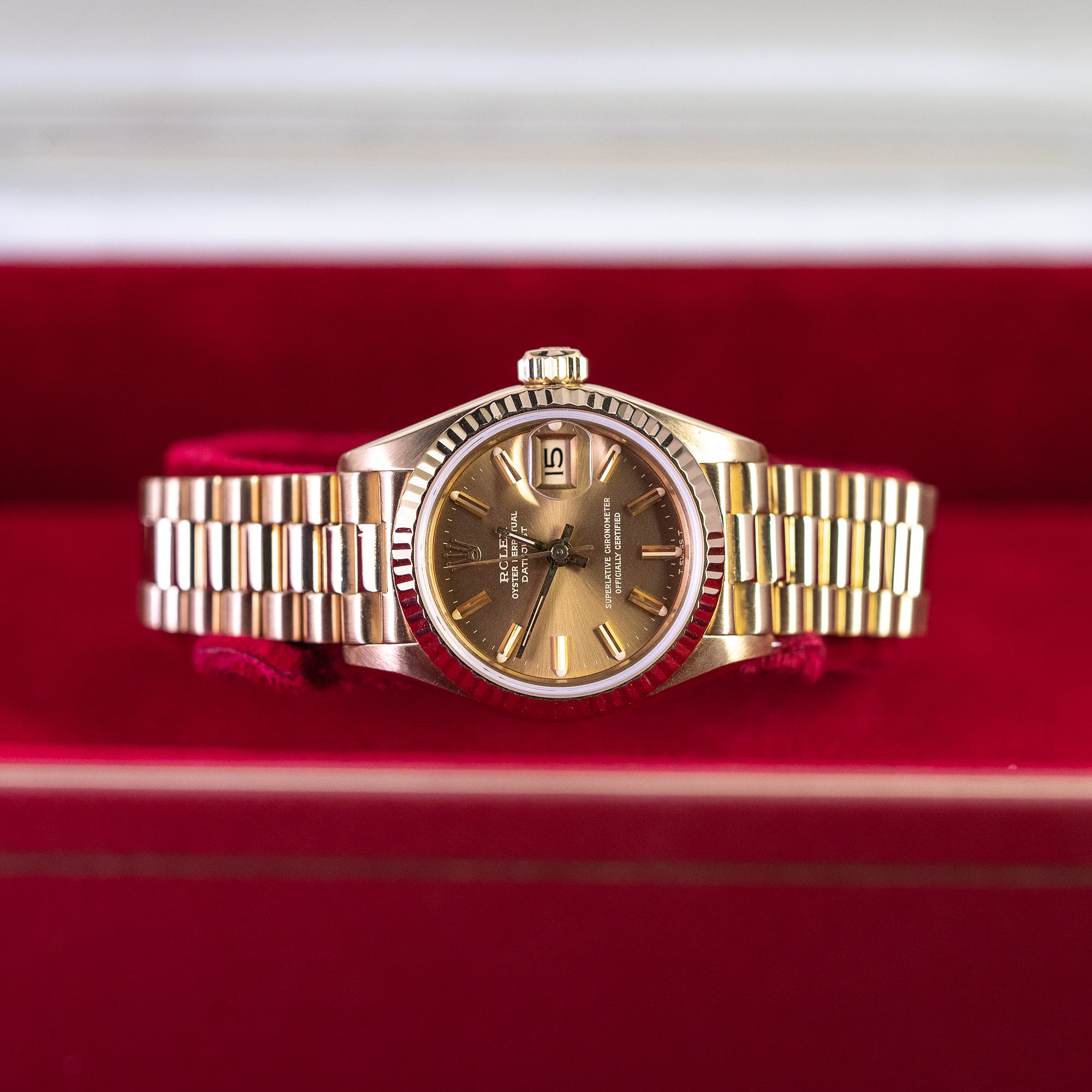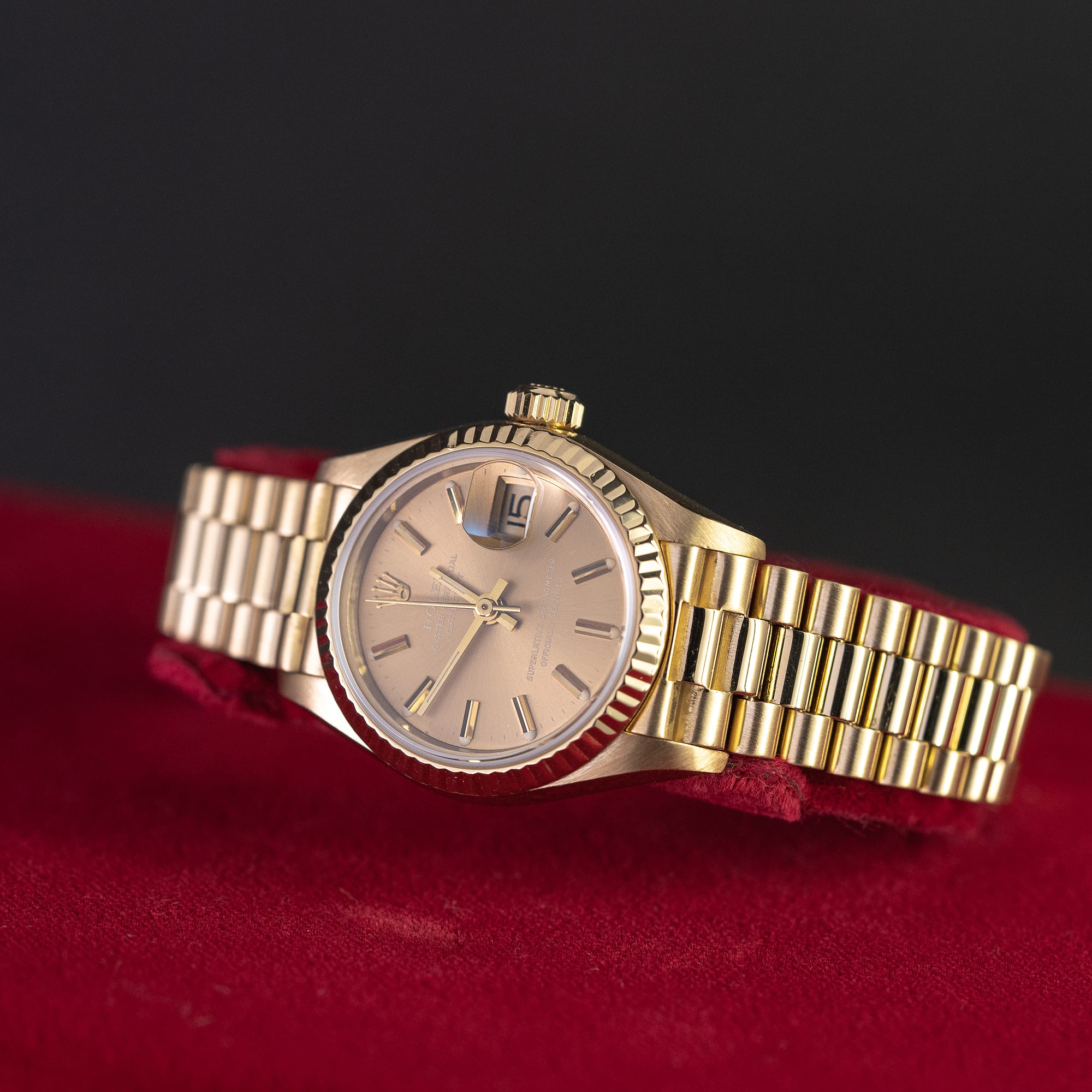 Kaunis ja siro 18k kultainen Rolex Oyster Perpetual Datejust Lady ref. 69178 vuodelta 1984. Kellossa on alkuperäinen shamppanjanvärinen kellotaulu ja kullanväriset osoittimet. 18k kultakuori on huippukunnossa. Rolexin 18k President ref. 8570/688 ranneke on lähes uudenveroinen. Kellossa on juuri tarkistettu ja säädetty cal.2135 automaattikoneisto. Kello on vesitiivis. Kuoren koko on 26mm.