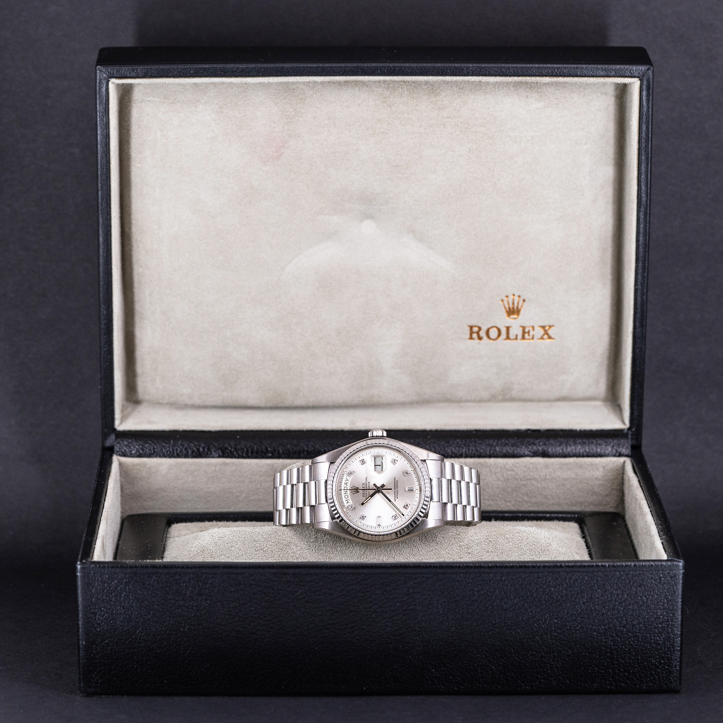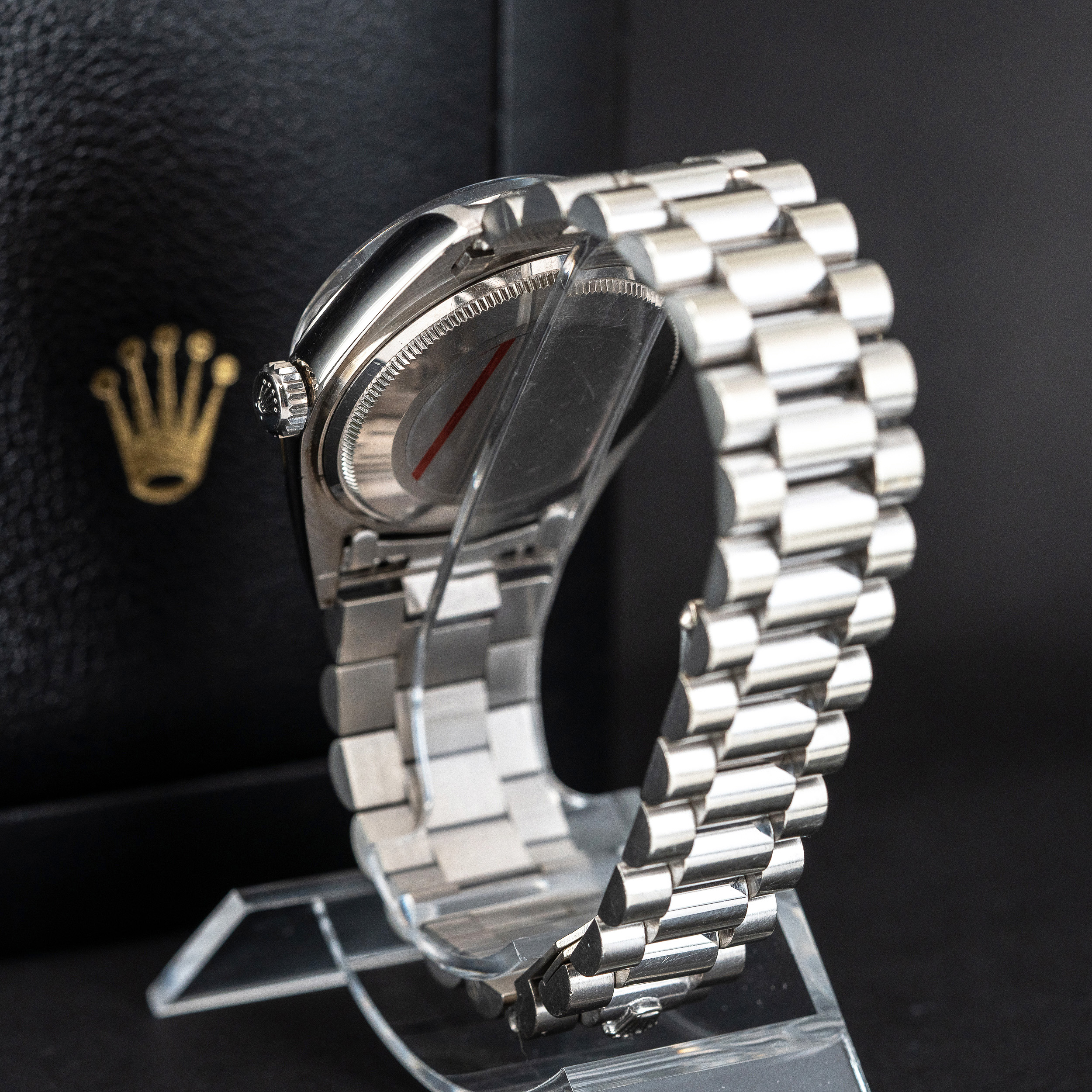 Kellon mukana tulee harvinainen musta Rolex Day-Date nahkalaatikko + suojalaatikko, jossa on malliin kuuluva harmaa sisusta.