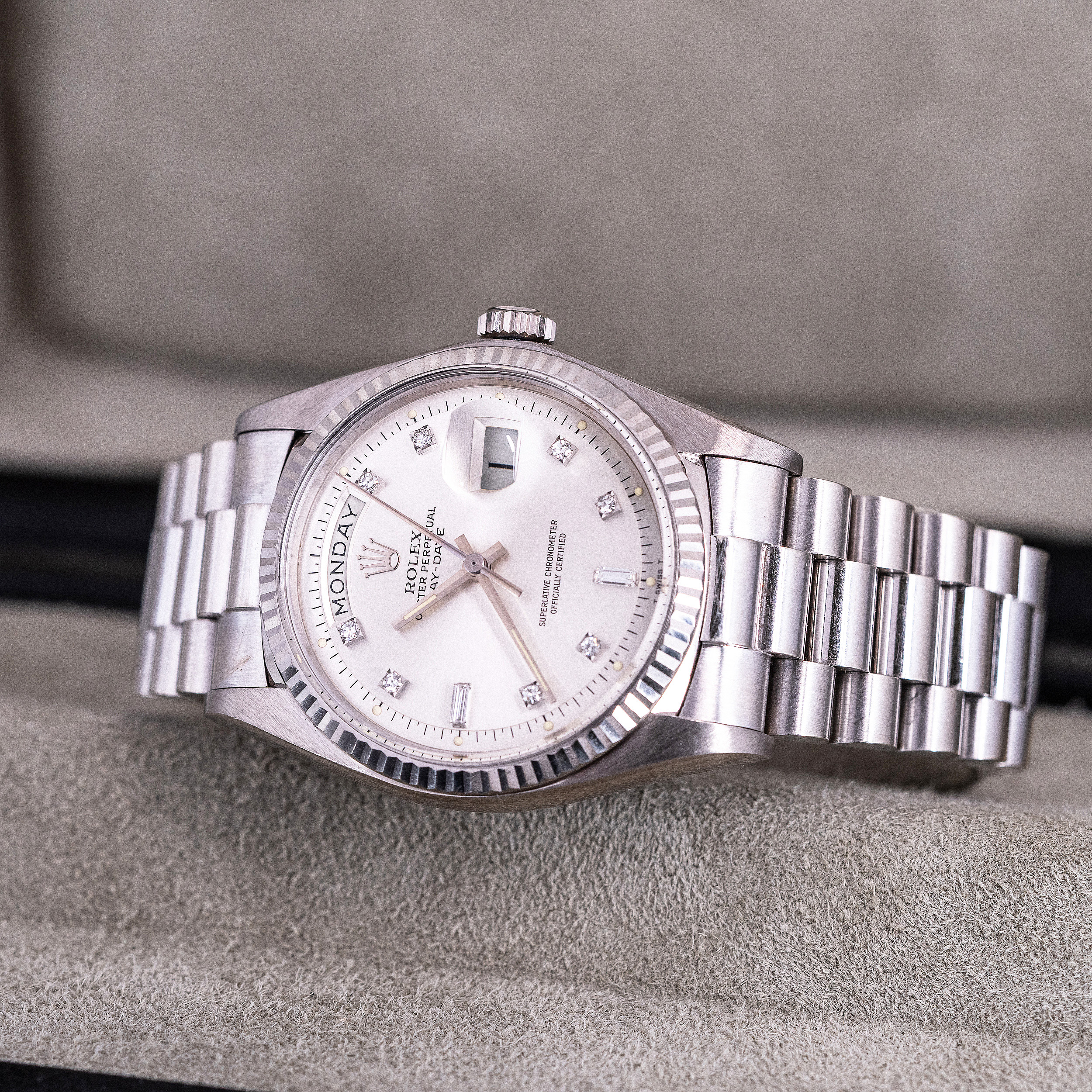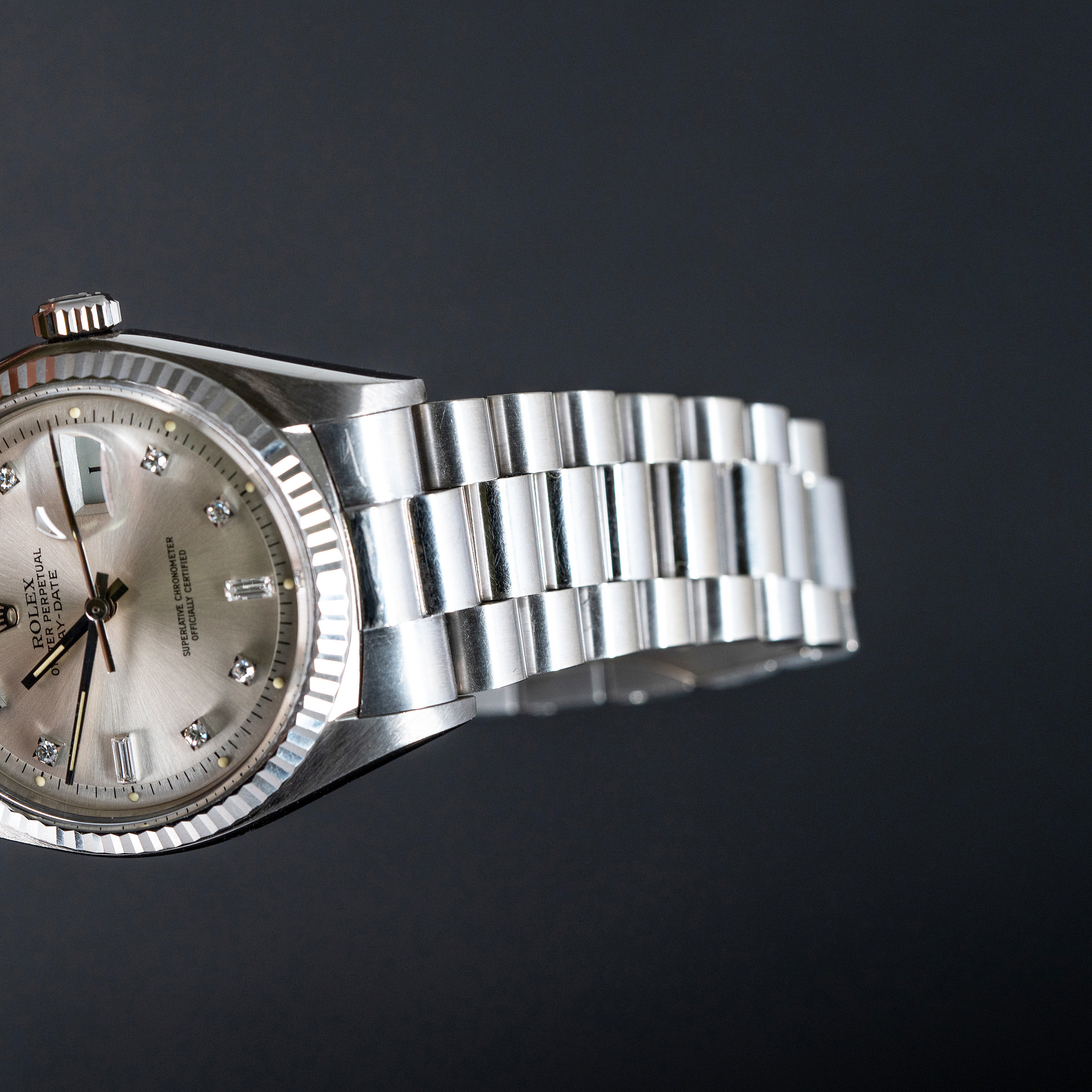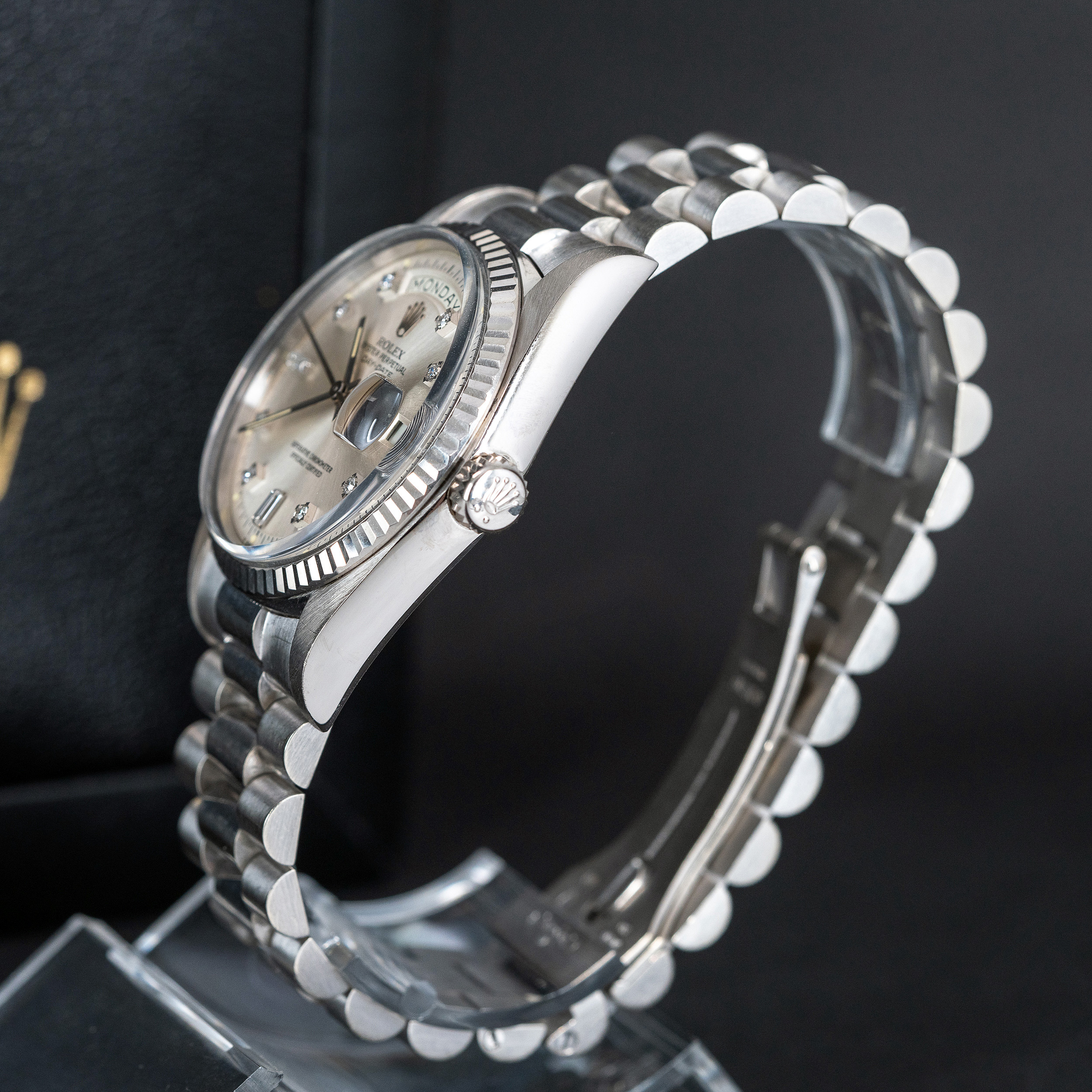 Rolexin 18k valkokultaiset Day-Date mallit ovat aina olleet harvinaisia verrattuna keltakultaisiin malleihin. 1970-luvun akryylilasisissa, ilmeeltään pehmeissä 1803 malleissa tämä ero on vielä selvempi. Näistä harvoista yksilöistä hyväkuntoisia ovat vielä harvinaisimpia. Näihin kelloihin Rolexin timattitaulu sopi täydellisesti. Hopeoitu/valkokultainen kellotaulu pienillä timantti indekseillä viimeistelee kellon harmaan eri sävyjen kokonaisuuden.