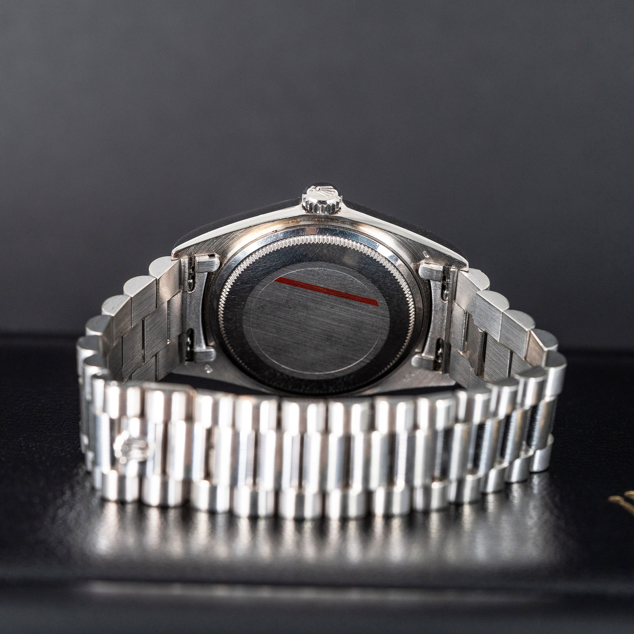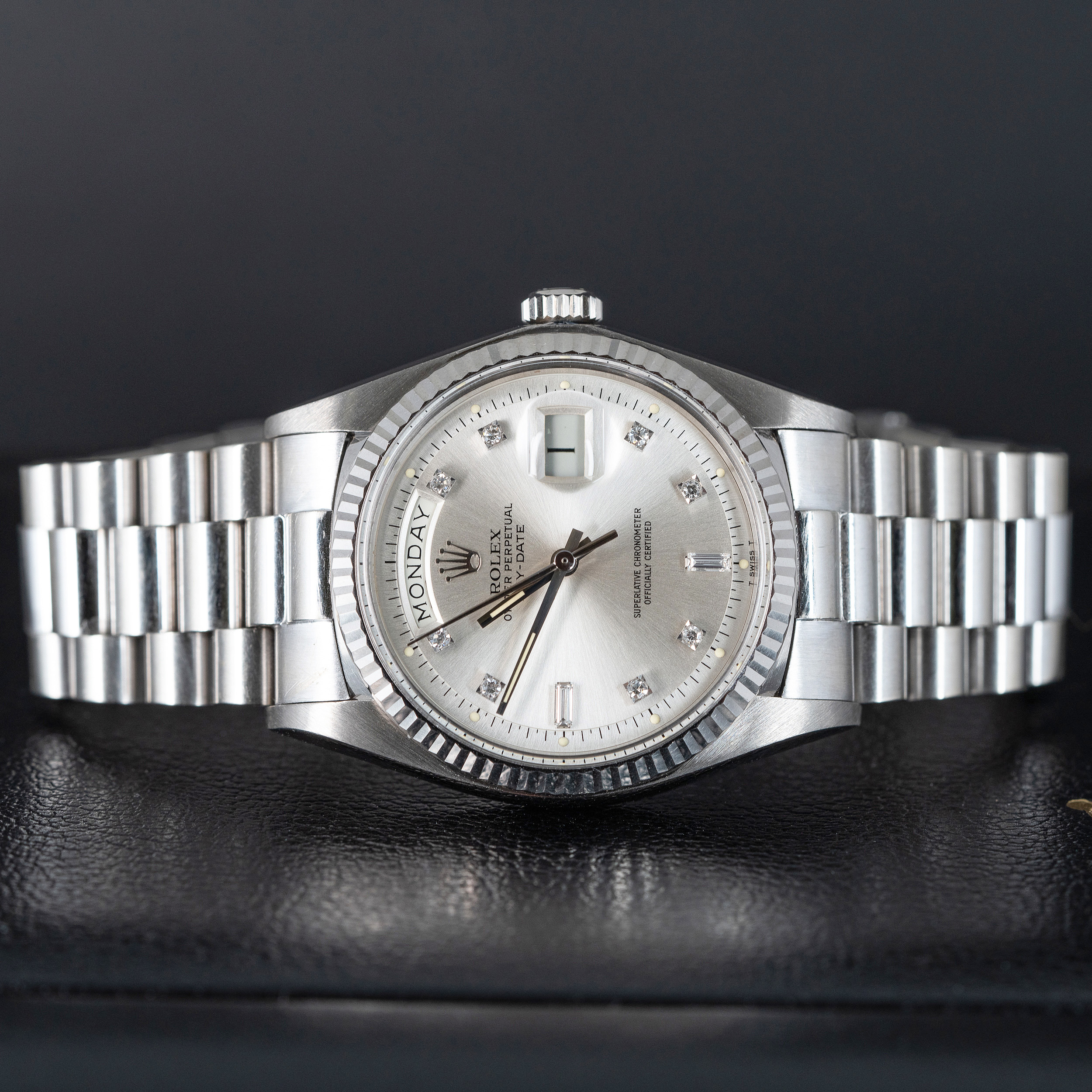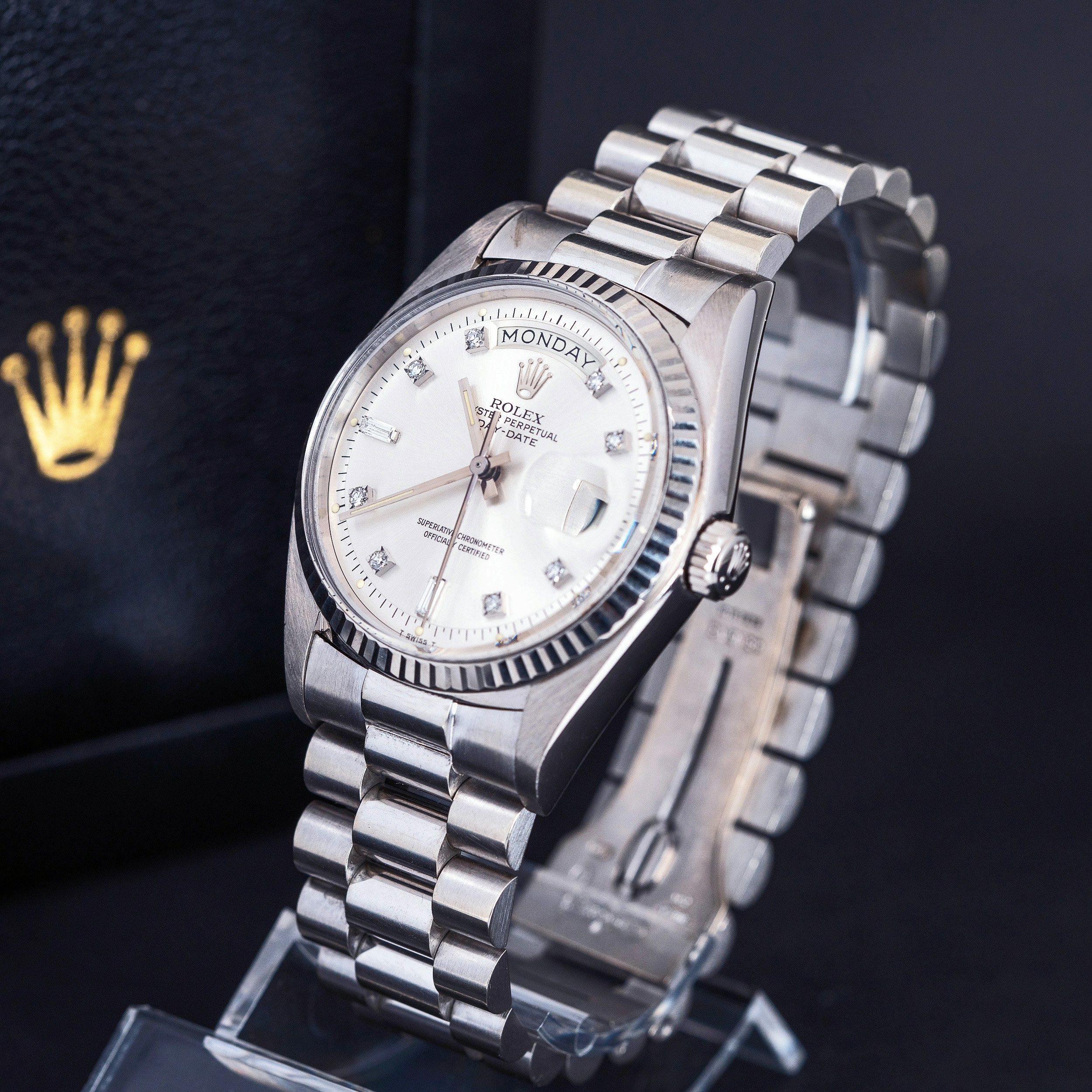 Rolexin 18k valkokultaiset Day-Date mallit ovat aina olleet harvinaisia verrattuna keltakultaisiin malleihin. 1970-luvun akryylilasisissa, ilmeeltään pehmeissä 1803 malleissa tämä ero on vielä selvempi. Näistä harvoista yksilöistä hyväkuntoisia ovat vielä harvinaisimpia. Näihin kelloihin Rolexin timattitaulu sopi täydellisesti. Hopeoitu/valkokultainen kellotaulu pienillä timantti indekseillä viimeistelee kellon harmaan eri sävyjen kokonaisuuden.