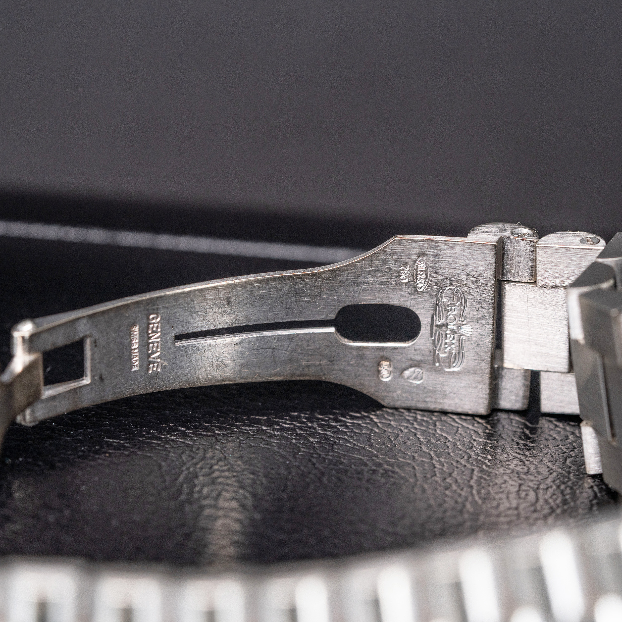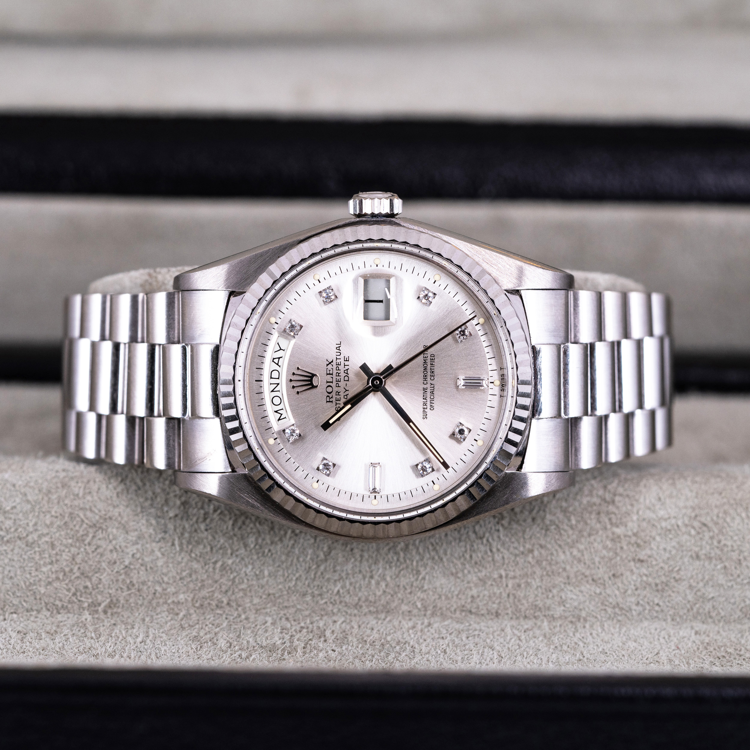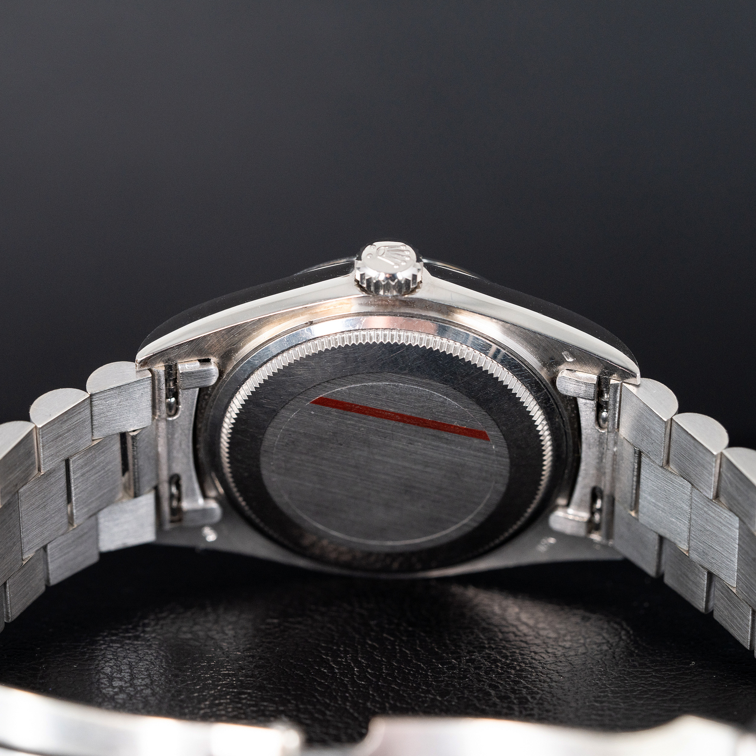 Päätimme tämän kohdalla muutenkin, että kuoria ei kiilloteta/hiota lainkaan, jotta ilme olisi mahdollisimman alkuperäinen. Pyynnöstä voimme kunnostaa kuoret hyvinkin kiiltäväksi, mutta nyt sitä ei ole tehty. Kellon mukana tuleva musta-harmaa Day-Date nahkalaatikko on myös harvinainen. Tätä mallia käytettiin vain valkokultaisten kellojen kanssa.