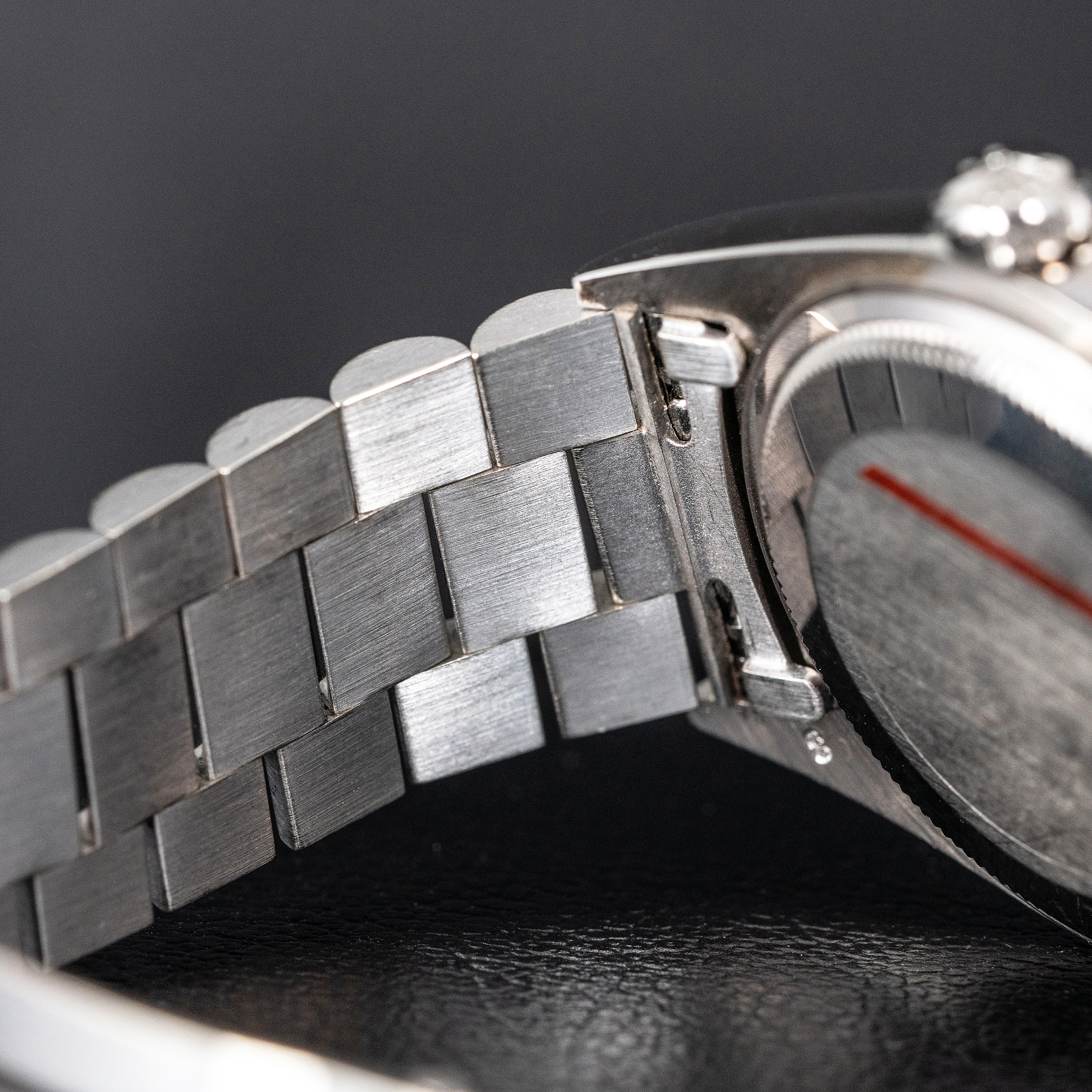 Tämä meidän 1803 Day-Date on erittäin hyvin säilynyt yksilö. Sitä on selvästi käytetty, mutta siitä on myös pidetty hyvää huolta. Day-Date malleissa rannekkeen kunto on selvin merkki siitä miten kelloa on pidetty. Tässä yksilössä kuluma ranteessa on hyvin pientä tai ei juuri lainkaan havaittavaa.