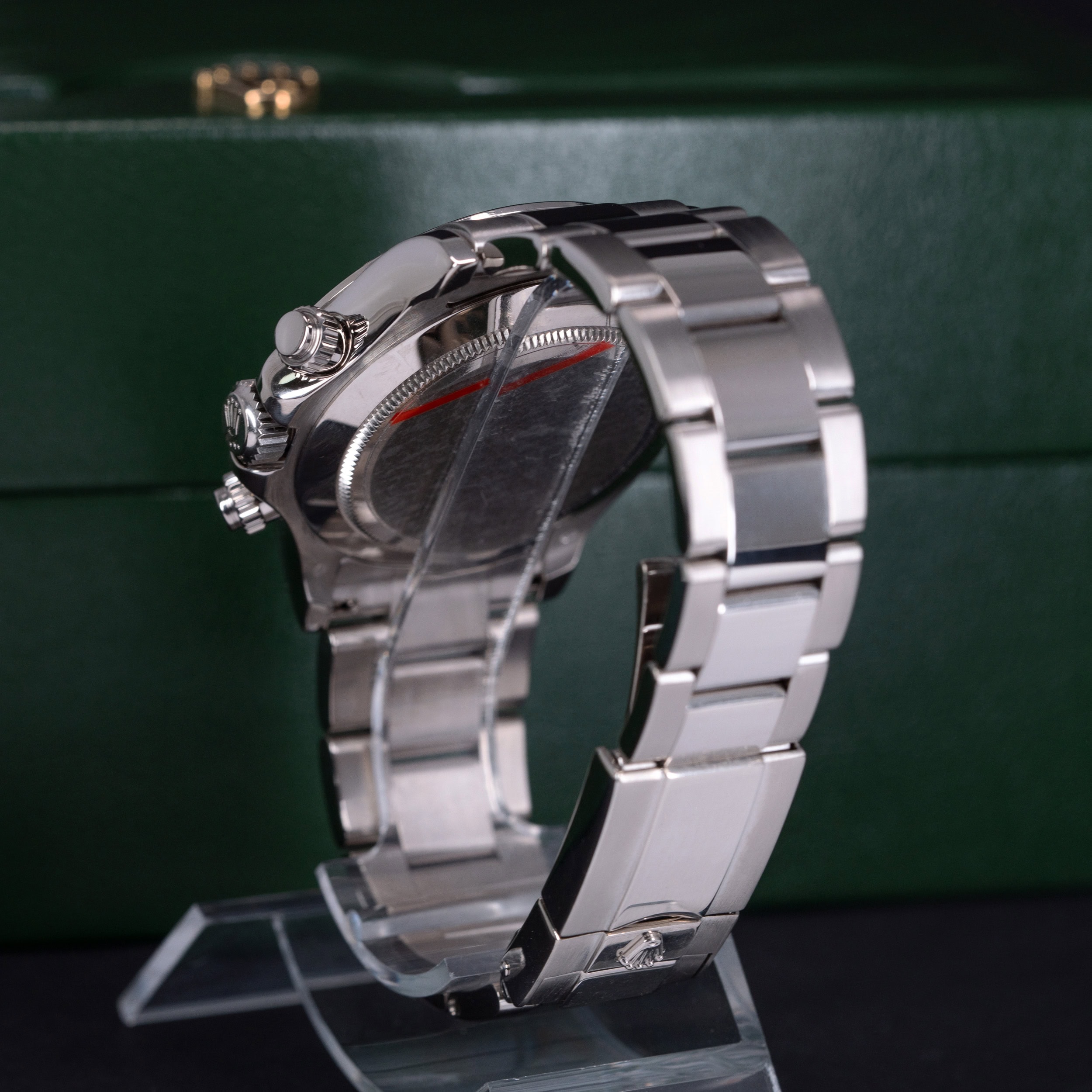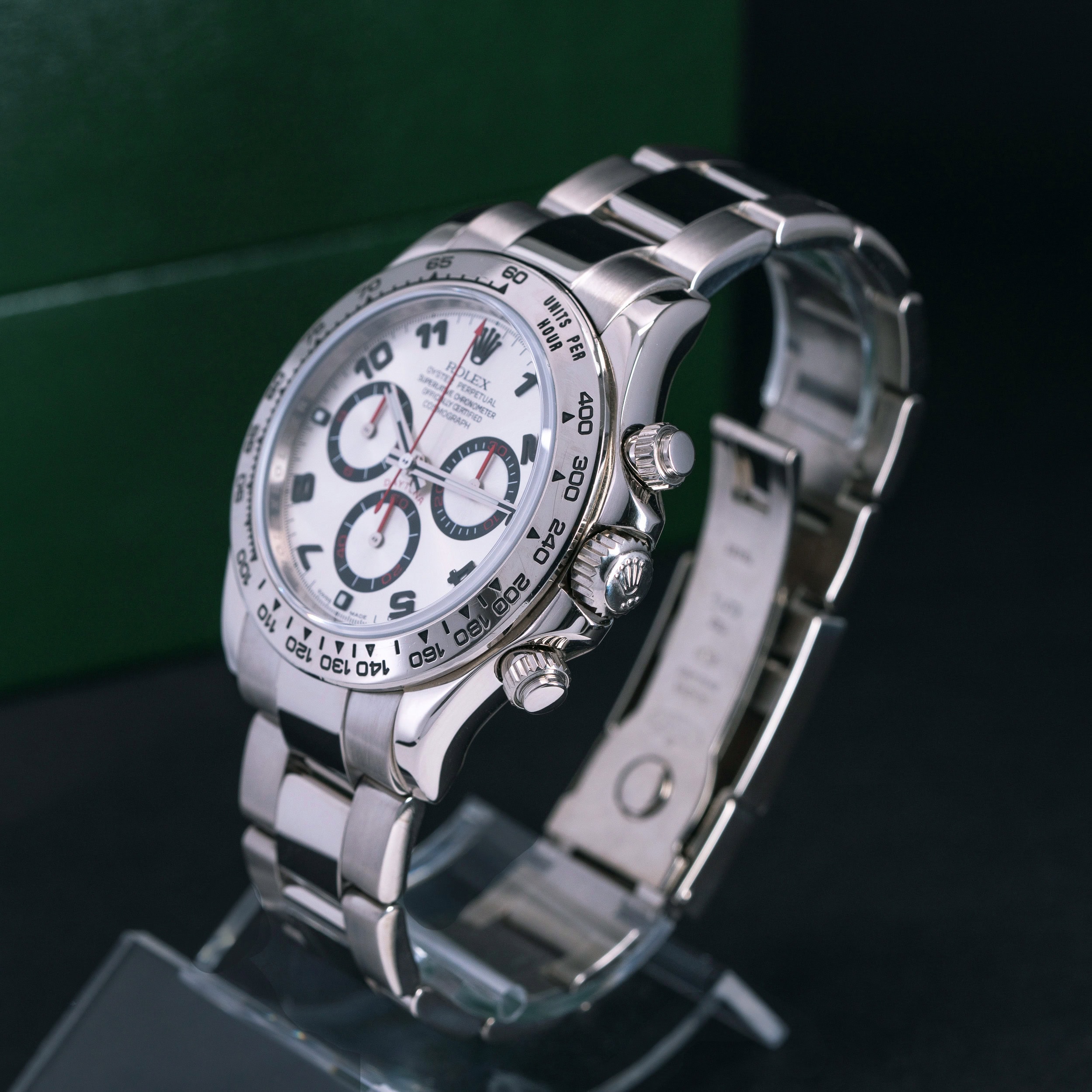 Kellossa on virheetön harmaa-punainen racing kellotaulu ja valkokultaiset osoittimet. 18k valkokultainen bezel ja -oyster kuori ovat hienossa kunnossa. Kello on sukellustiivis, testattu +10/-0,7 bar. Kuoren koko on 40 mm.