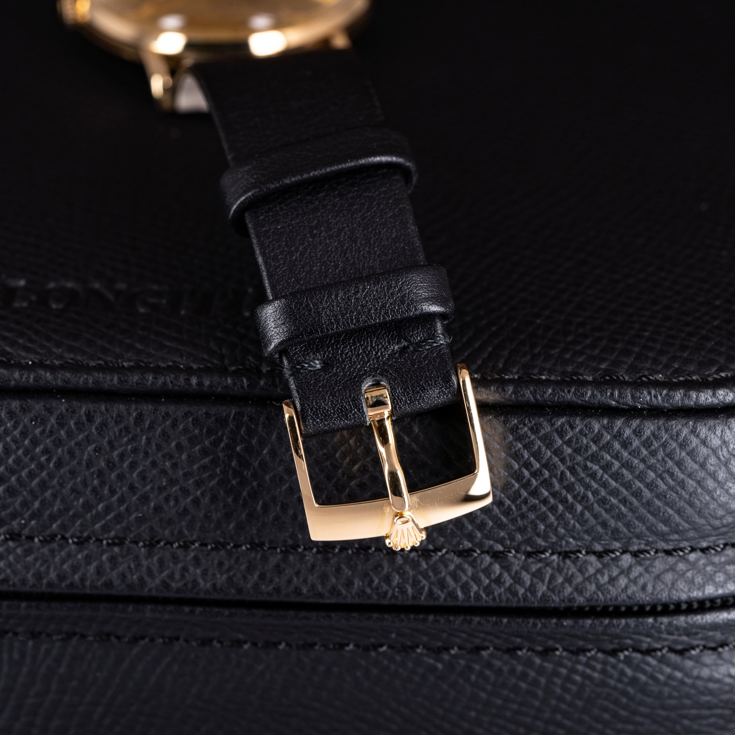 Kellon vasikannahkainen musta nahkaranneke on Rolexin alkuperäinen malli ja siinä on Rolexin kullattu solki.