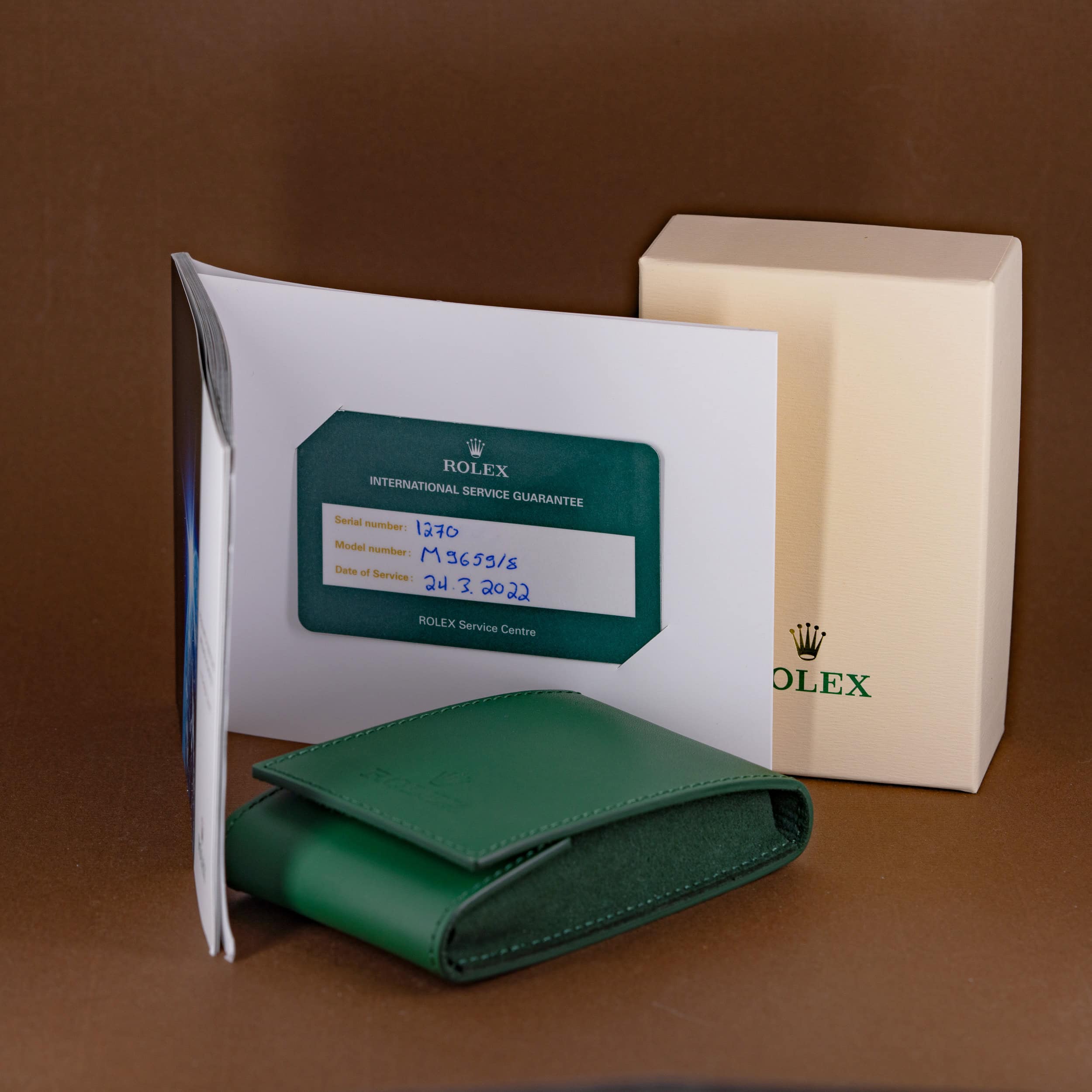 Mukana tulee Rolexin vihreä huoltokotelo ja tehdashuollon todistukset.
