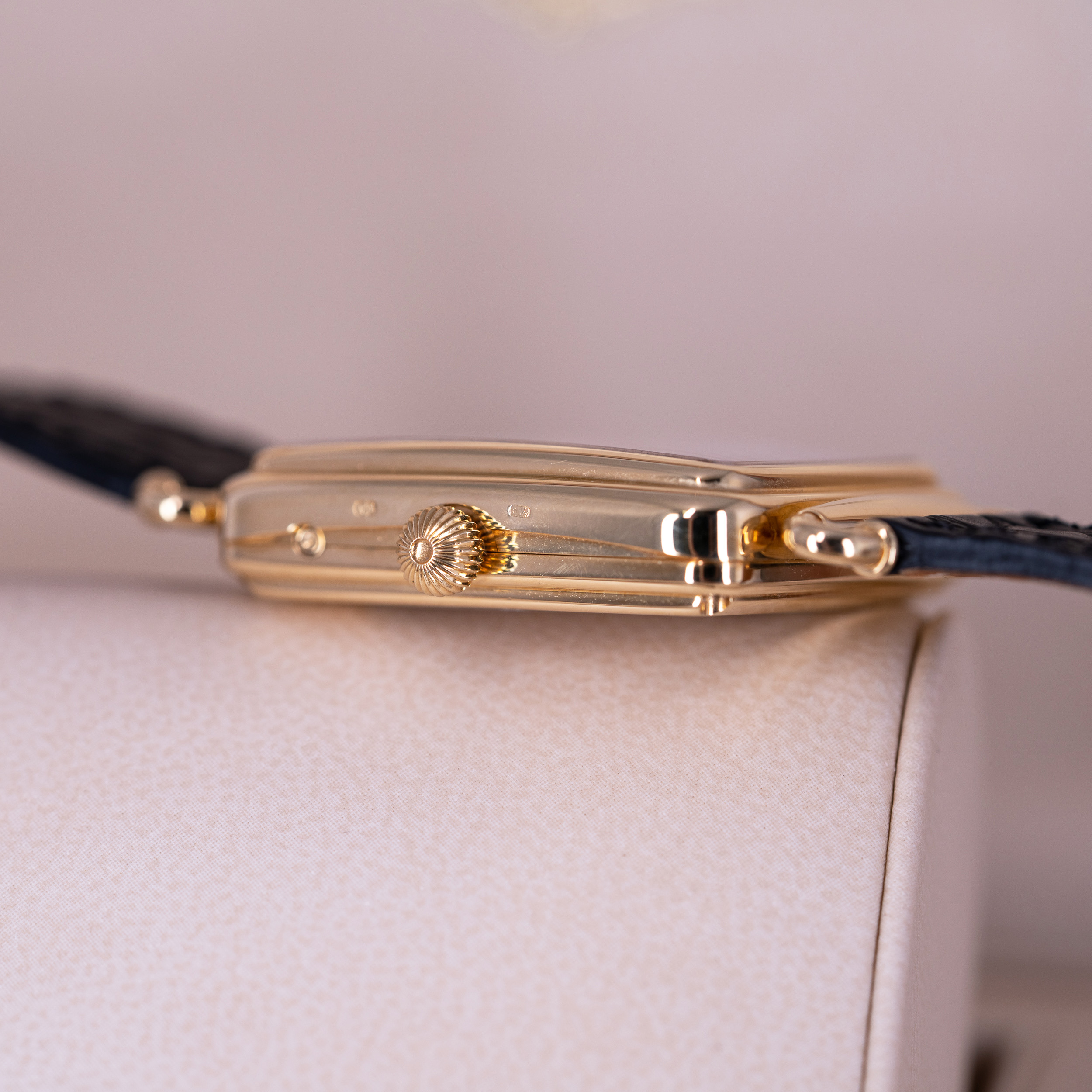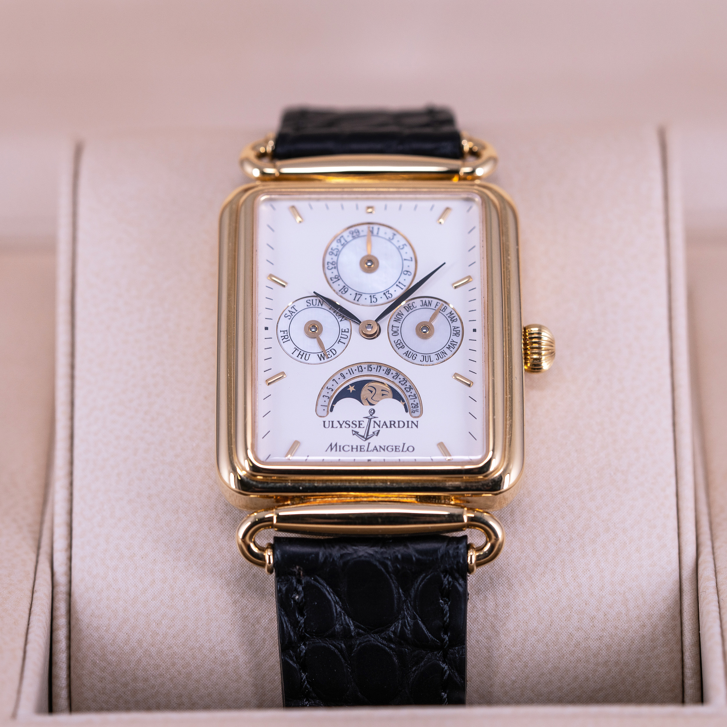 18k Ulysse Nardin Michelangelo triple-date rannekello n. vuodelta 1990. Ref. 161.42. Tässä kellossa on virheetön valkoinen kellotaulu, jossa on kalenterinäyttöjen pohjana on Mother of Pearl -koristelu. Tunti- ja minuuttiosoittimen lisäksi kellotaulussa on kuukauden, kuukaudenpäivän, viikonpäivän ja kuunkierron näytöt. 18k kultakuori on uudenveroisessa kunnossa. Kuoren koko on 29mm x 33,4 mm. 47 mm lug-to-lug.