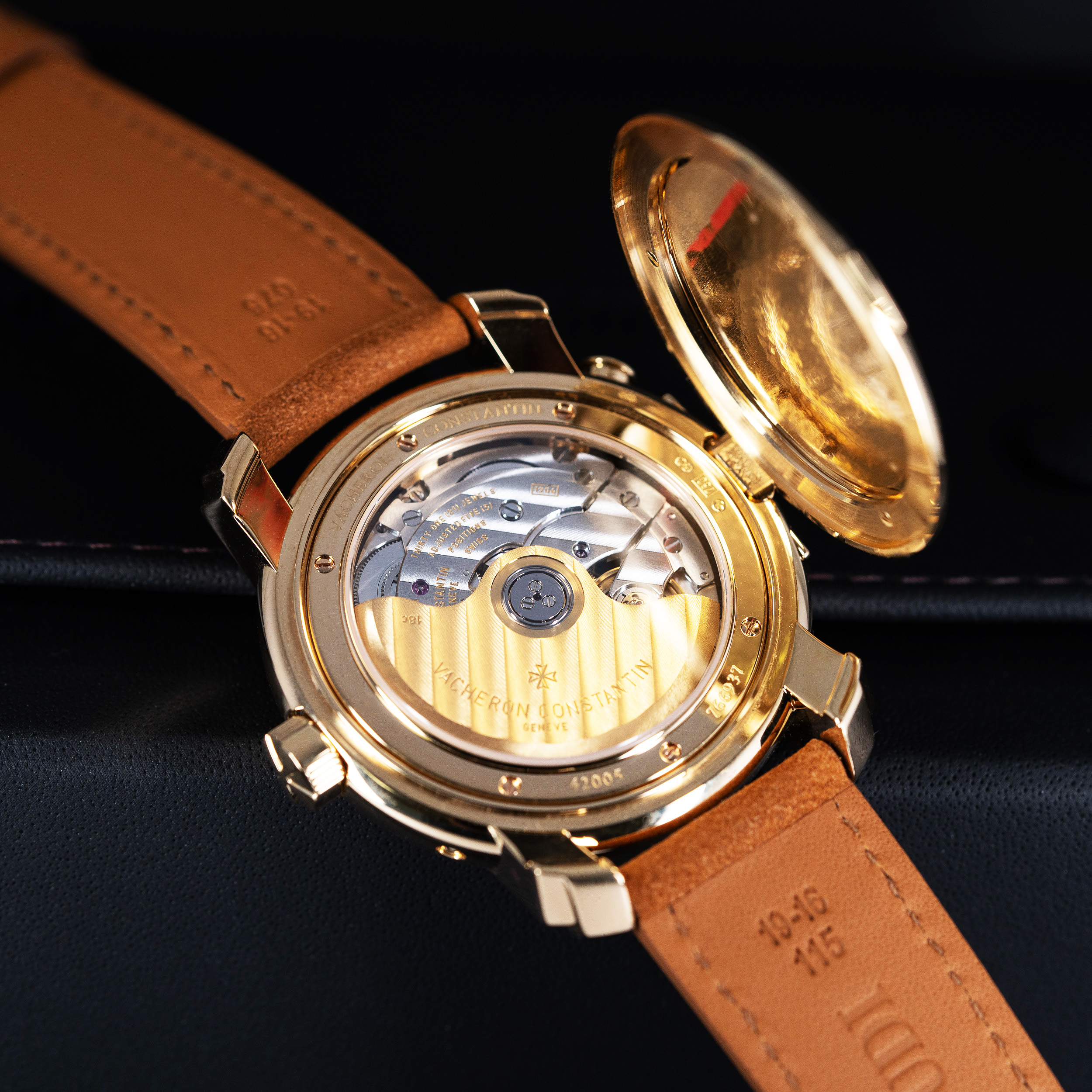 18k kultakuori on huippukunnossa. Kuoren koko on 39mm. Takapohja on saranoitu ja sen alla on safiirilasilla suojattu Vacheron Constantin cal.1206 kronometri automaattikoneisto. Koneisto on juuri täysin kunnostettu.