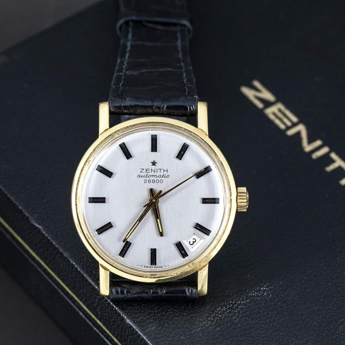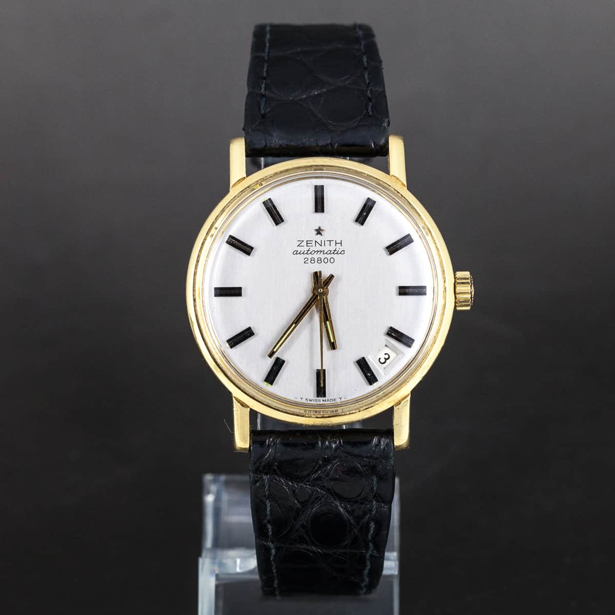18k Zenith Automatic 28800 pukukello 1970-luvun alusta. Erittäin hyvä Zenith cal. 2562PC automaattikoneisto. Erikoistilauksena Hirschillä teetetty 18-14 Alligaattori ranneke jossa alkuperäinen Zenith solki. Alkuperäinen kellolaatikko.