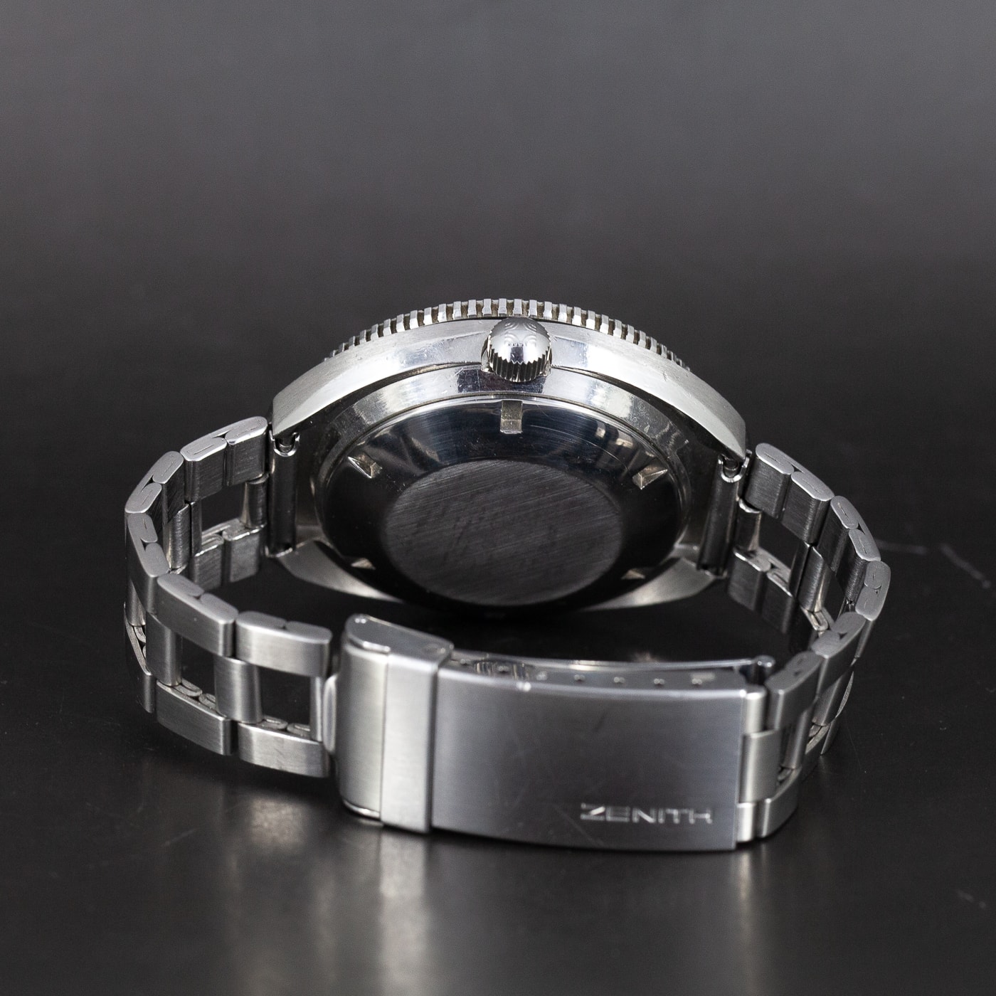 Harvinainen ja suurikokoinen Zenith Super Subsea Ref: A3637 1000m sukeltajankello 1970-luvun alusta. Zenith cal. 2542PC automaattikoneisto. Kellon on huollettu muutama vuosi sitten ja on yhä sukellustiivis. Alkuperäinen Zenithin lukkonuppi. Alkuperäinen Guy Frersin valmistama Zenith tikapuu teräsranneke. Kuoren halkaisija on 43mm.
