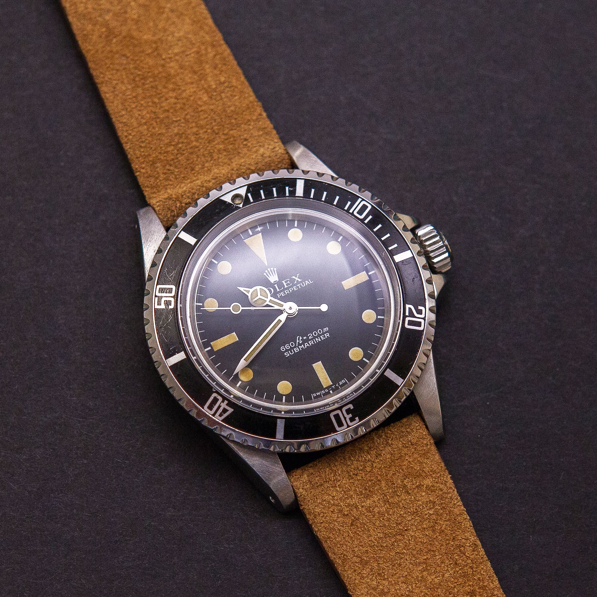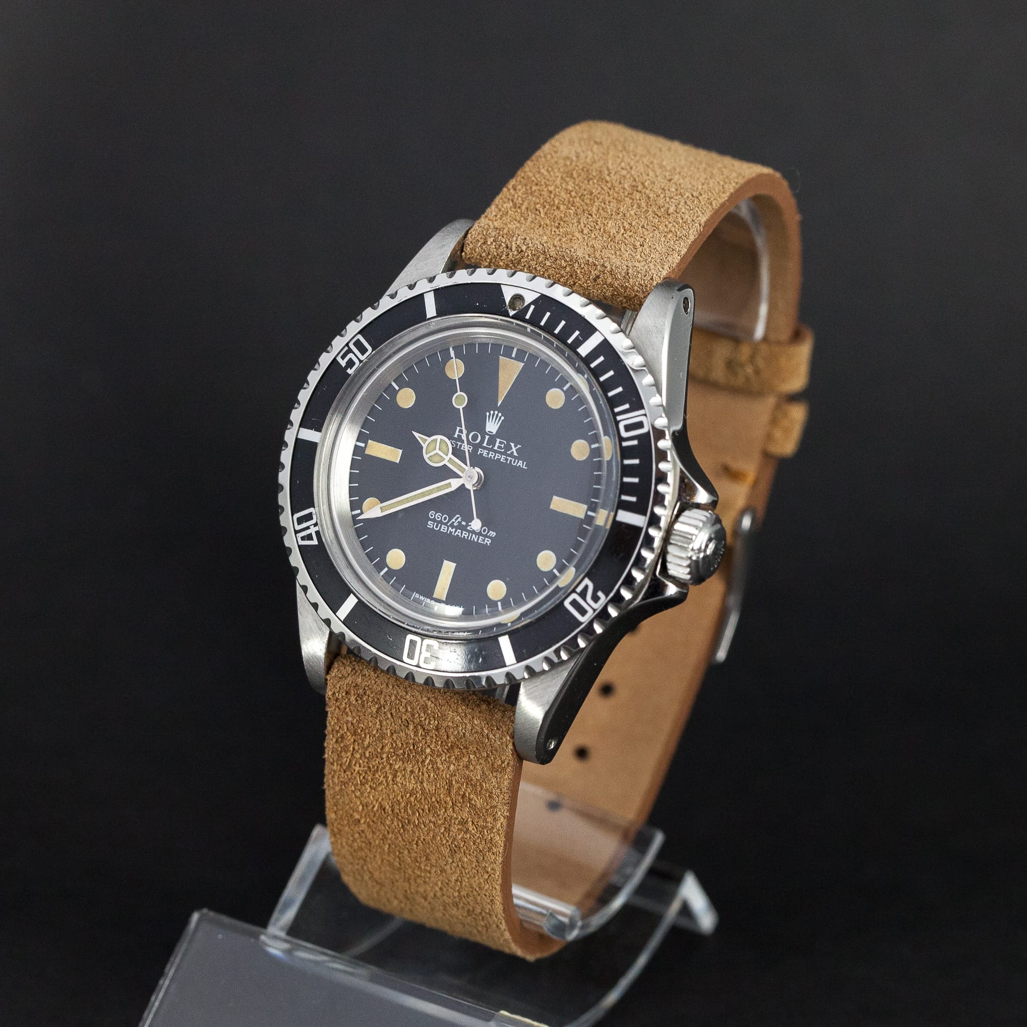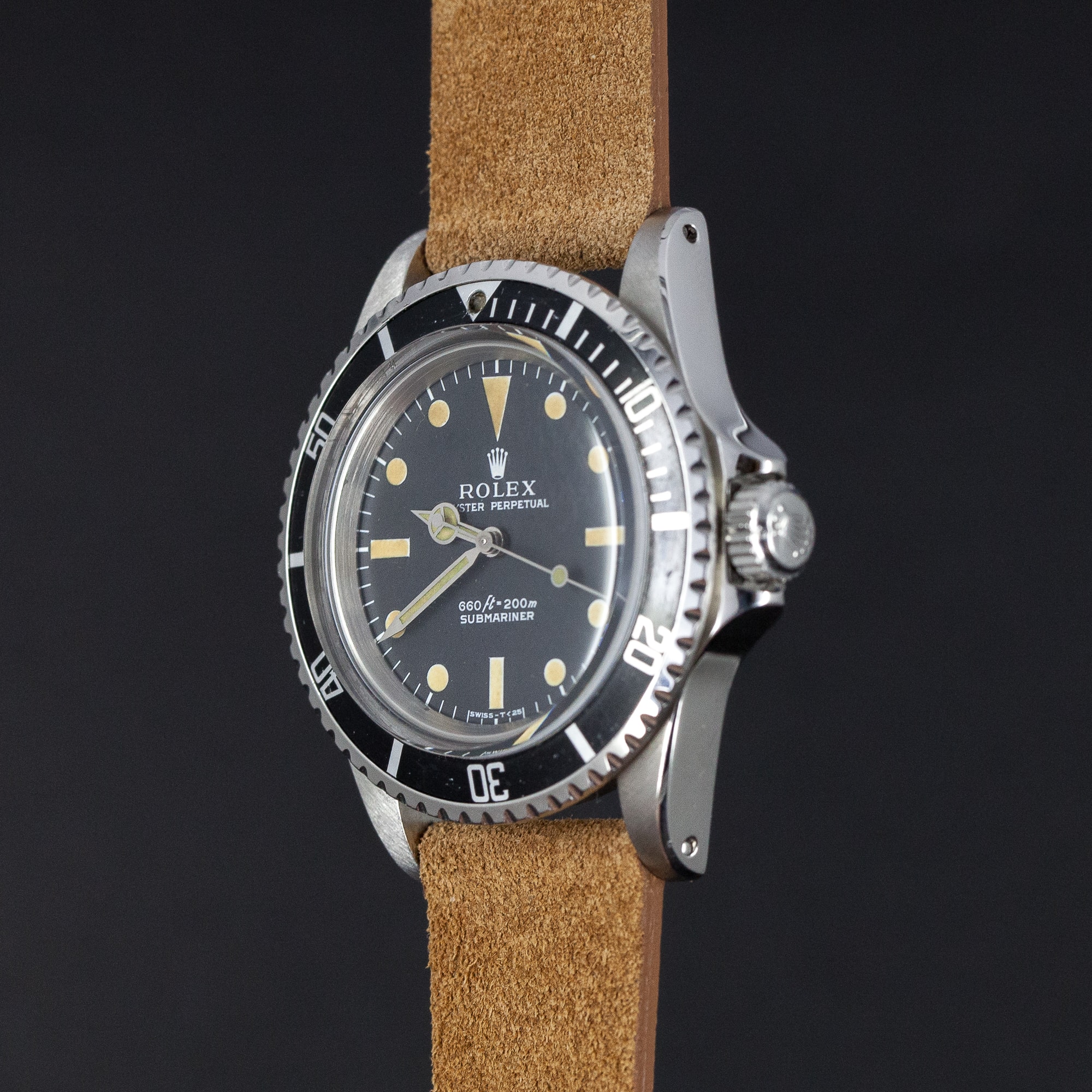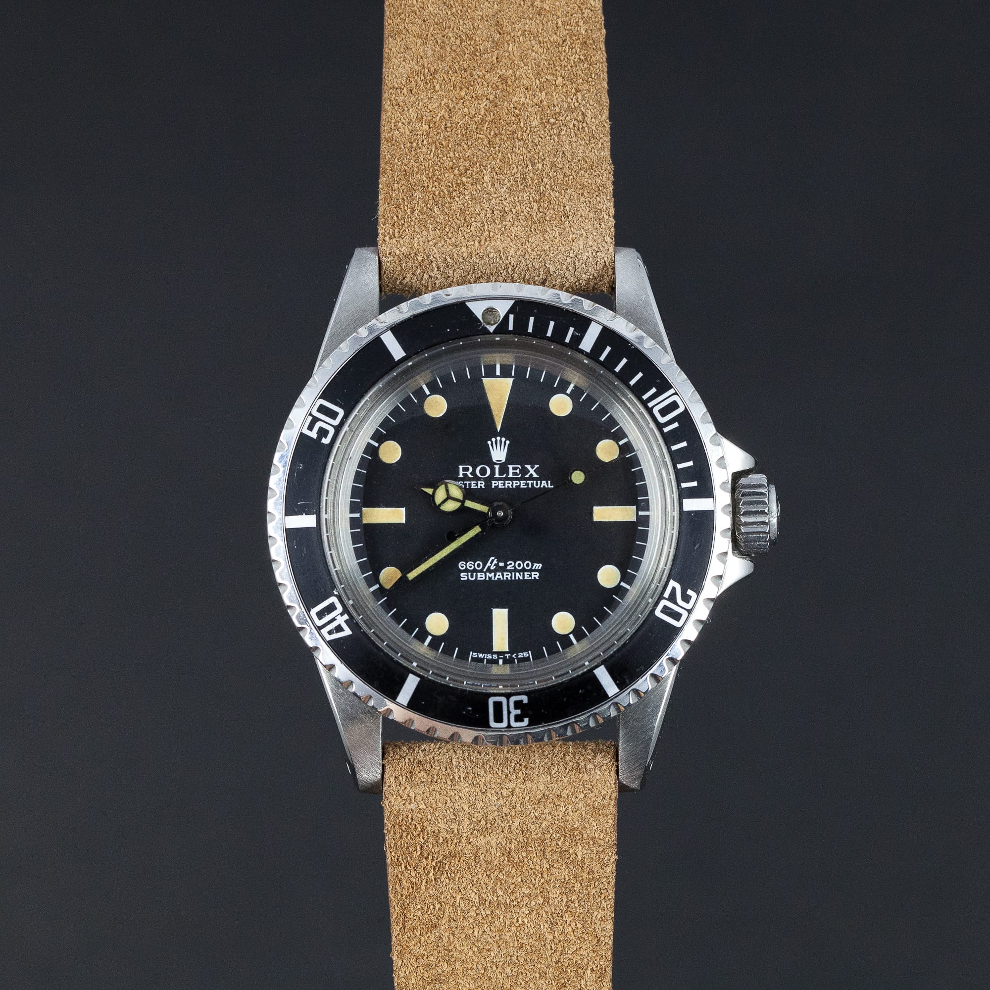 Rolex Oyster Submariner ref.5513. Sarjanumeron mukaan kello on vuodelta 1973. Takapohjan sisäpuolella leimat: 5513, I/72. Kauniisti ikääntynyt tritium taulu ja osoittimet. Huollettu cal.1520 automaattikoneisto toimii hienosti.