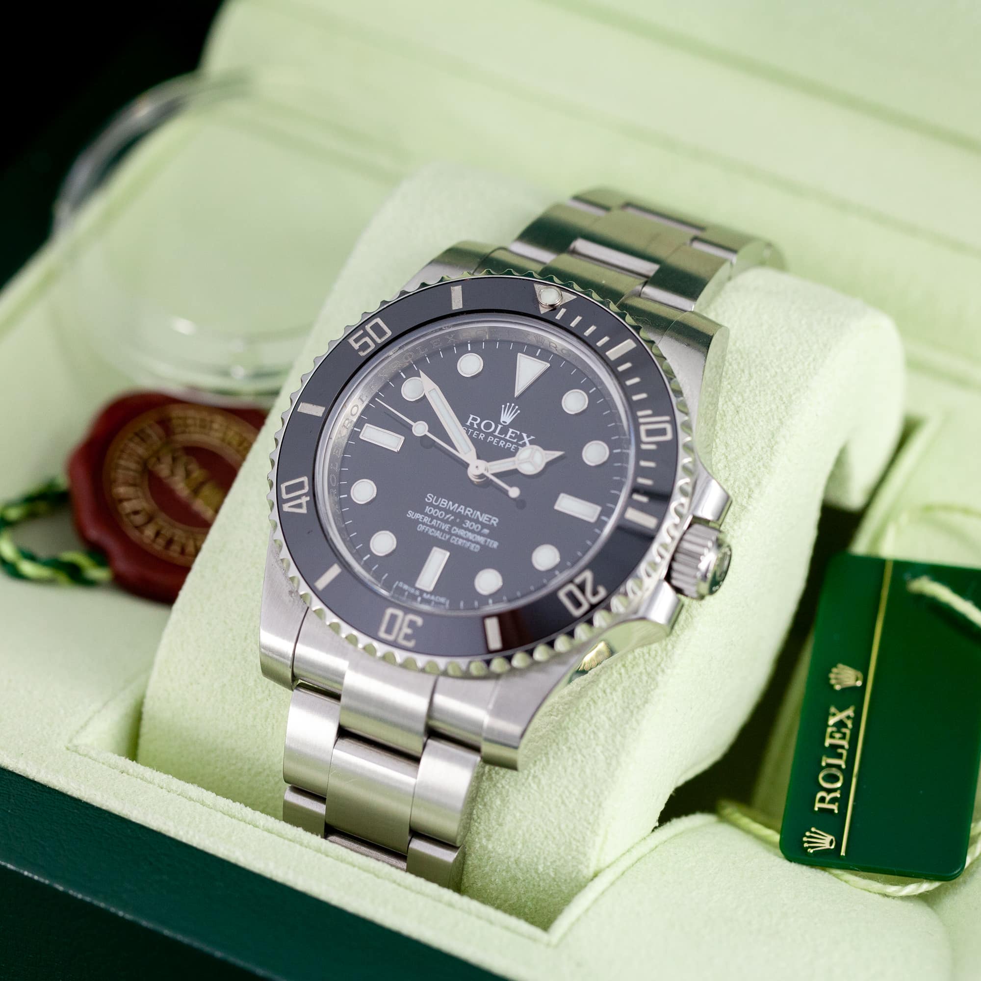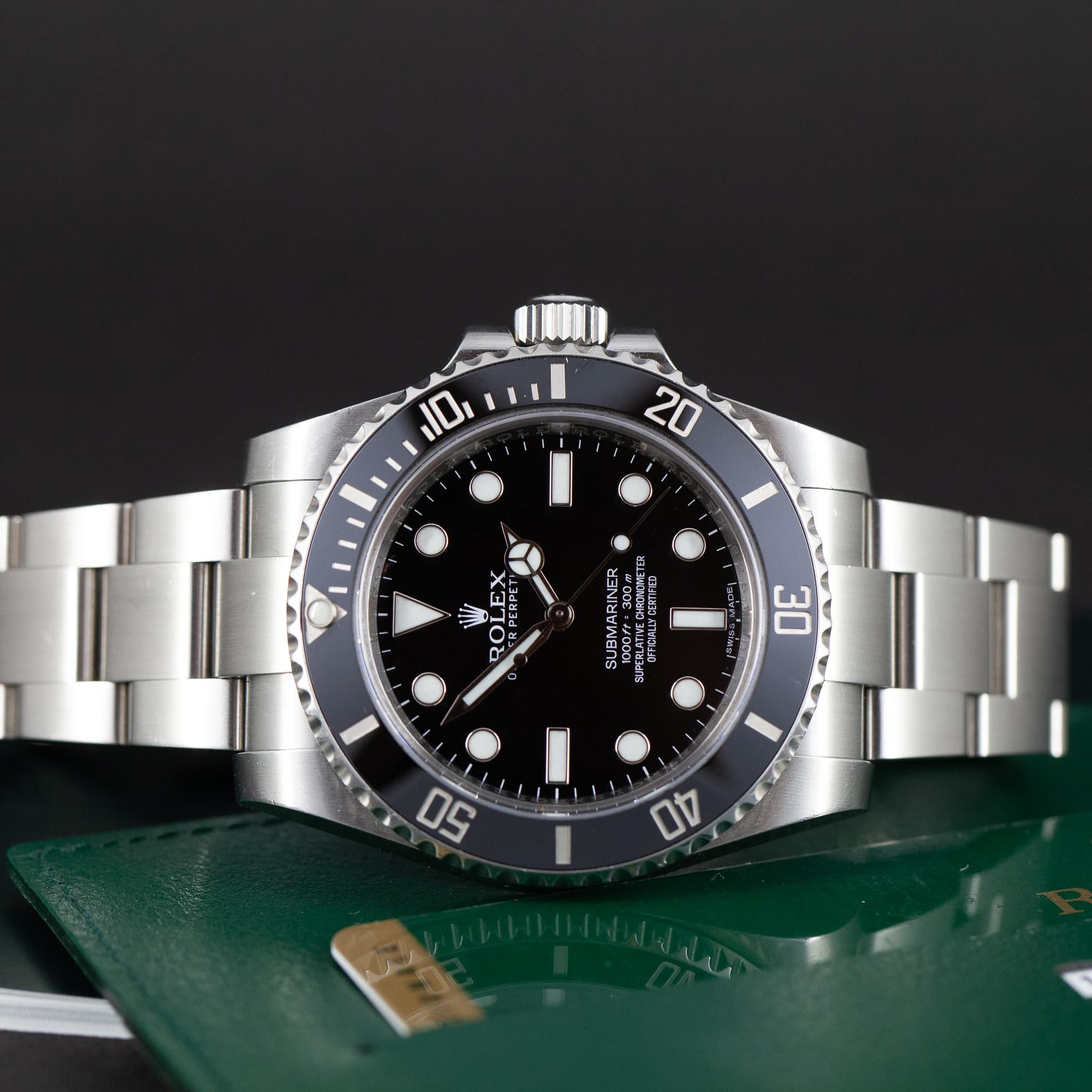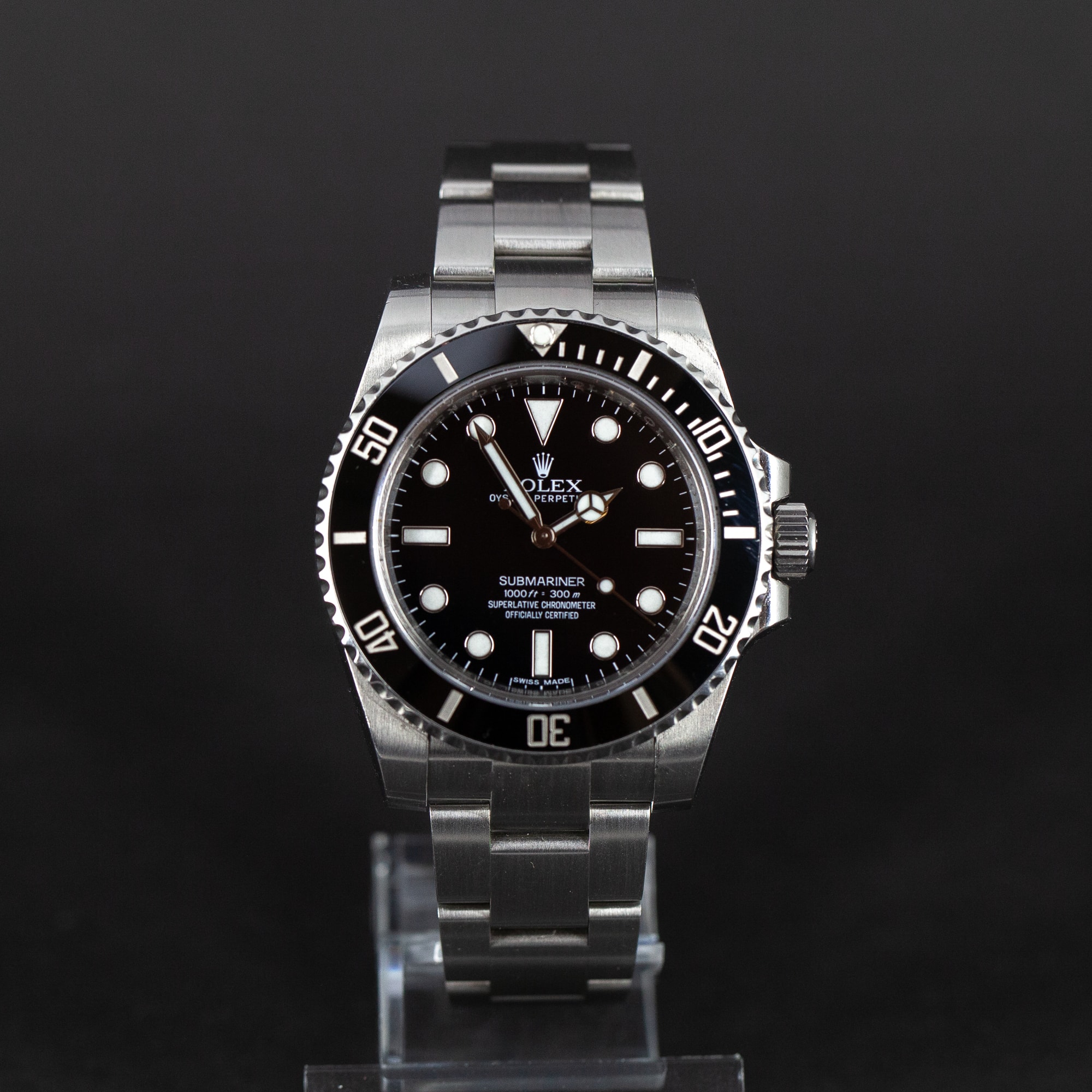 Rolex Submariner Ref.114060 ”no-date” vuodelta 2014. Full set, kaikki boksit ja paperit. Virheetön kuori, safiifilasi ja keraaminen lasisarja. Hankittu Lahden Kellokeskuksesta 2014. Rolexin Oyster teräsranneke jossa Glide-lock lukko. Kuoren koko 40mm.