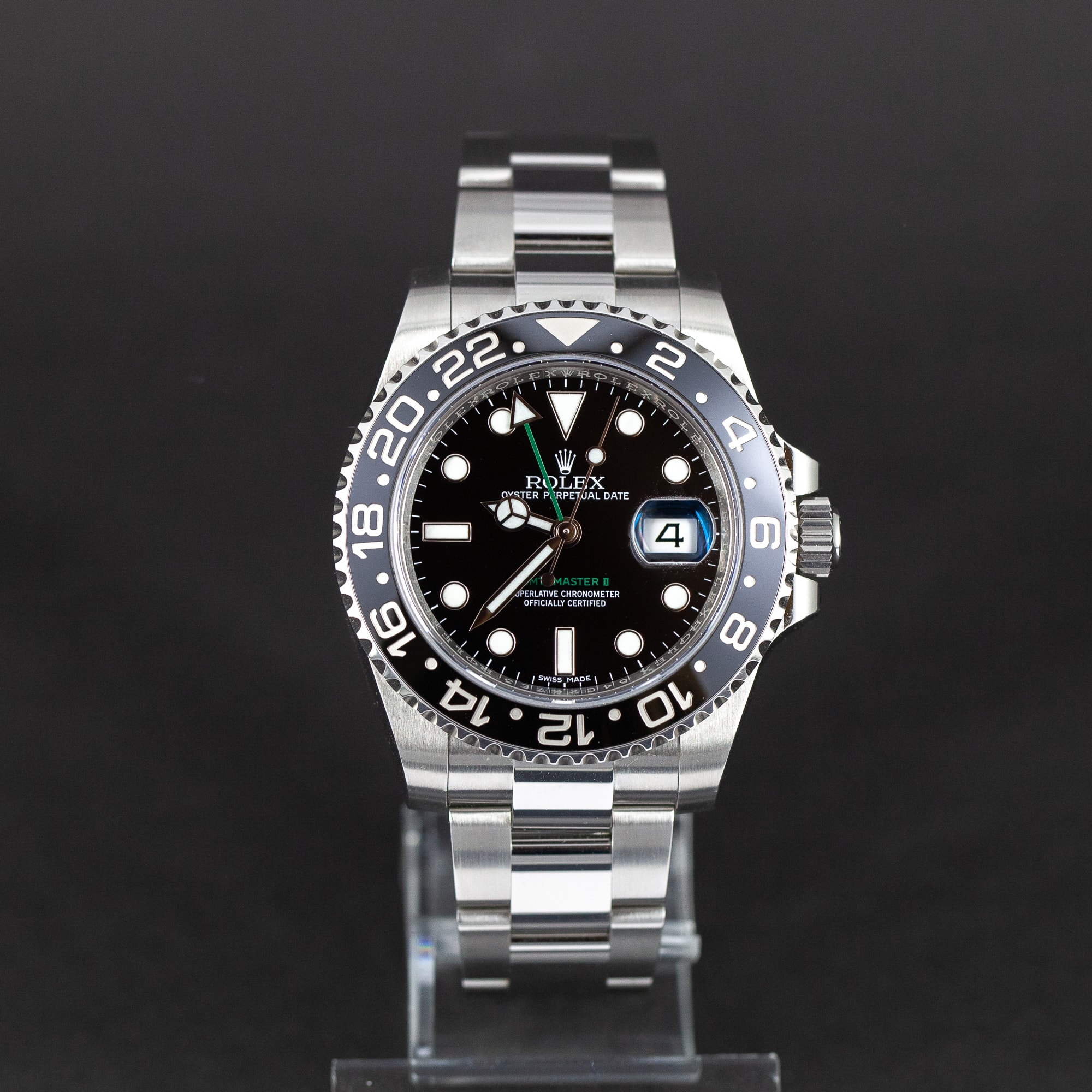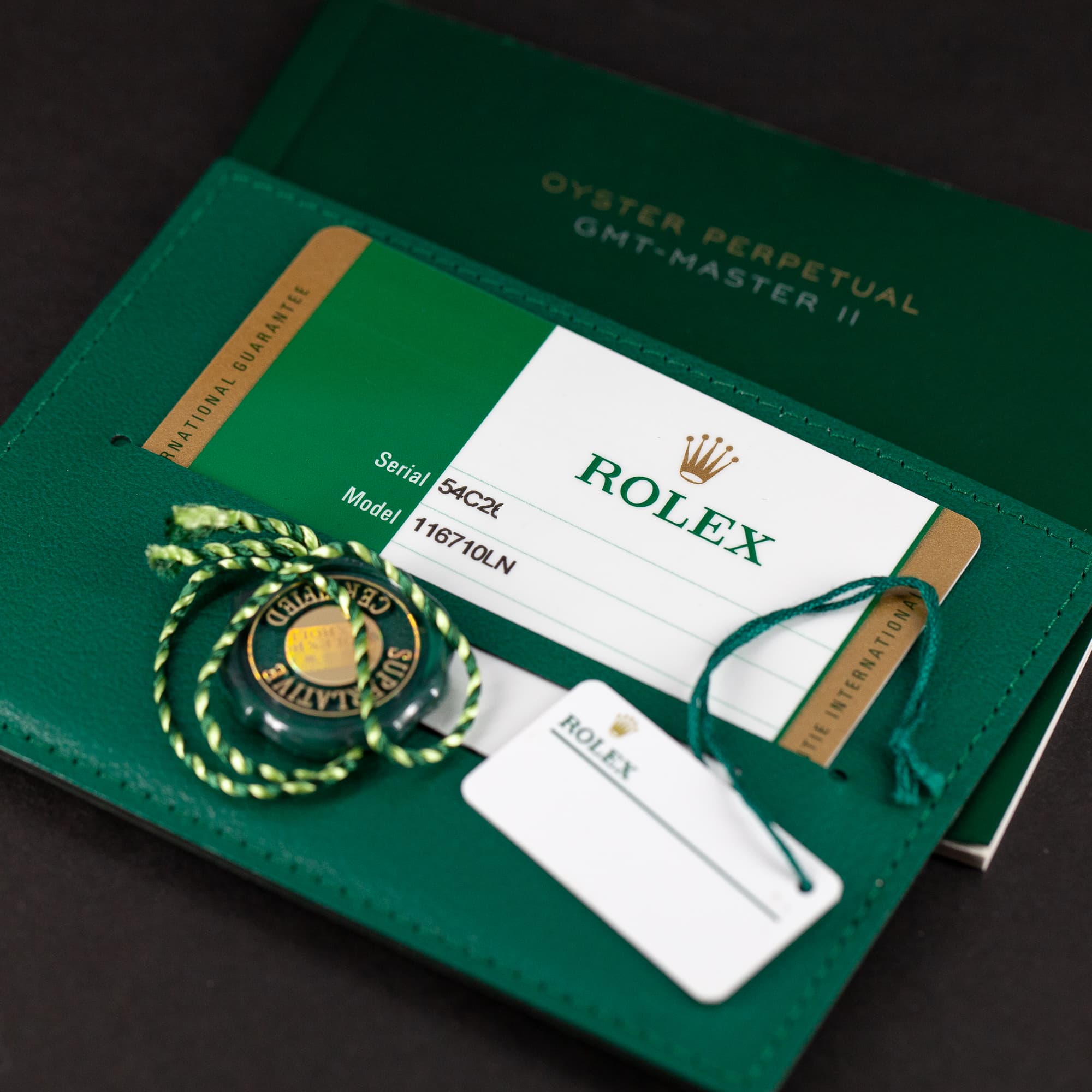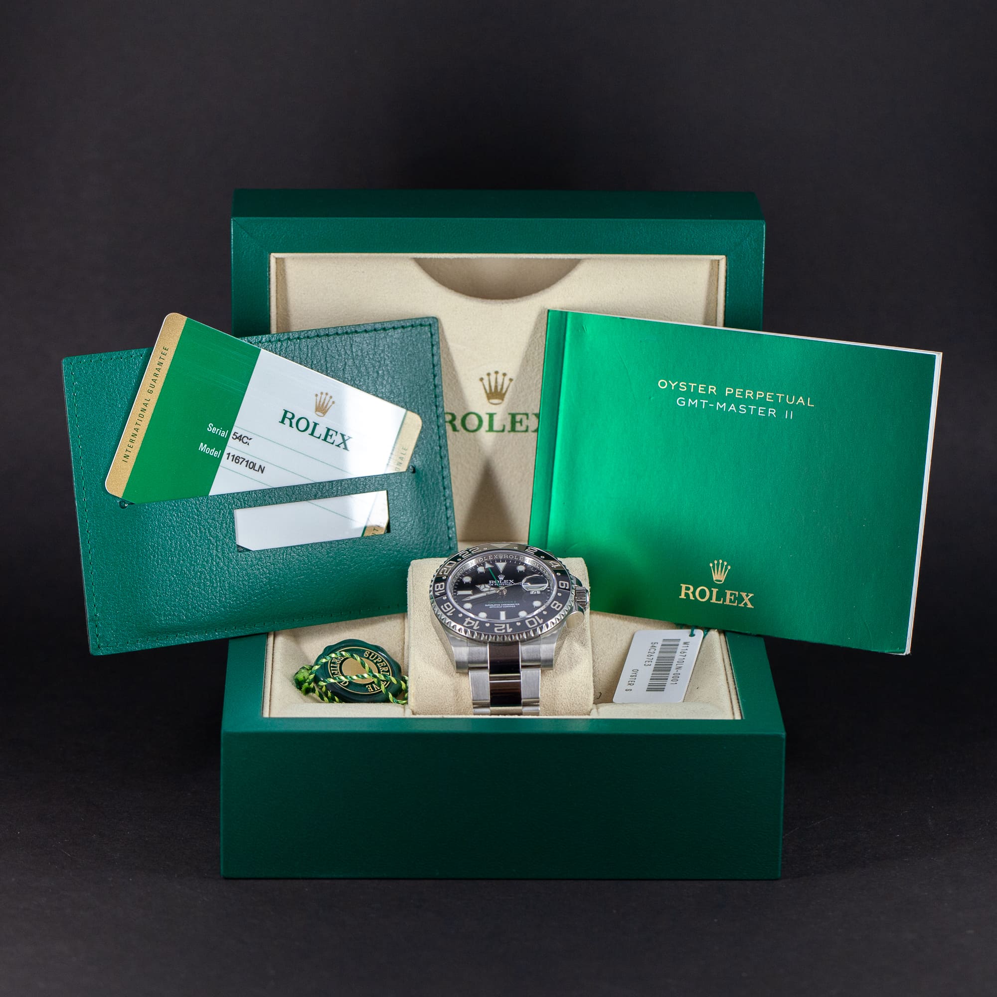Rolex GMT-Master II ref.116710LN vuodelta 2017. Tuotannosta poistunut malli keraamisella lasisarjalla. Full-set, kaikki laatikot ja paperit. Rolexin cal.3186 automaatti-GMT koneisto. Alkuperäinen Rolexin teräsranneke on uudenveroinen. Sukellustiivis kuori on halkaisijaltaan 40mm.