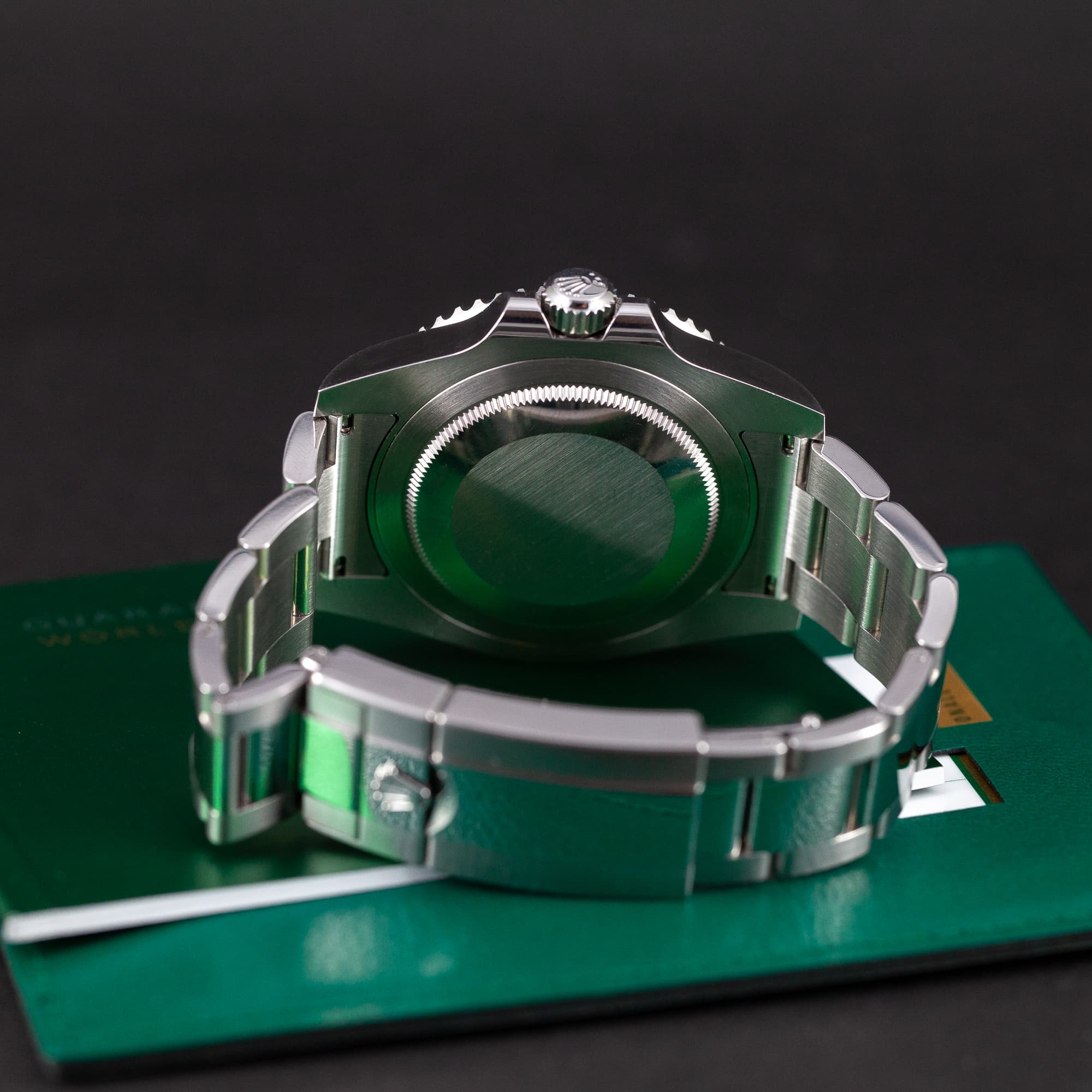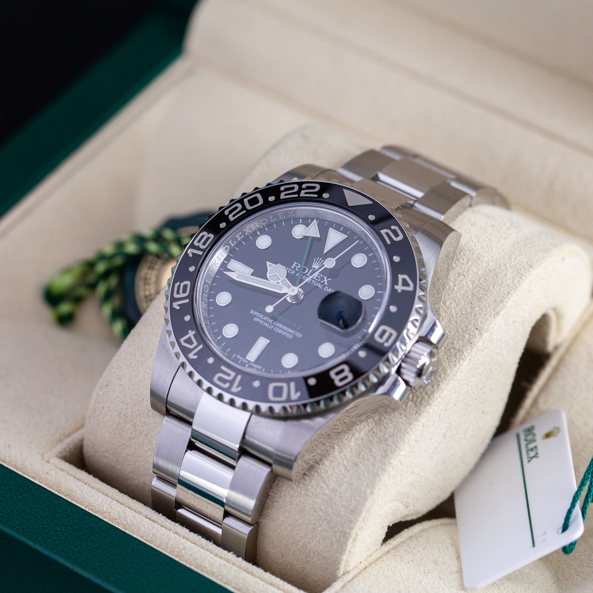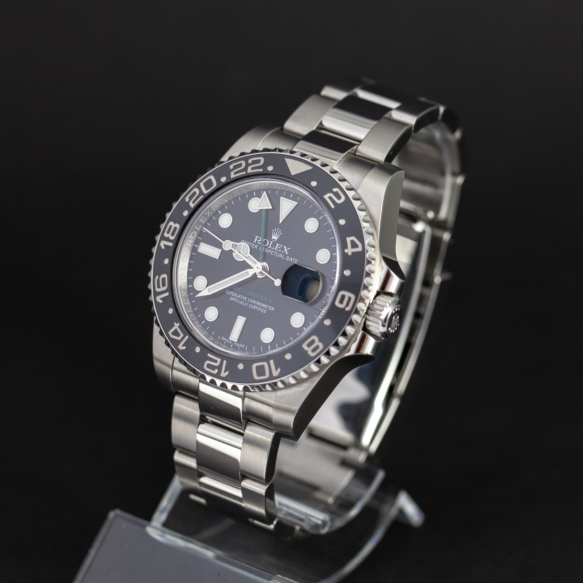 Rolex GMT-Master II ref.116710LN vuodelta 2017. Tuotannosta poistunut malli keraamisella lasisarjalla. Full-set, kaikki laatikot ja paperit. Rolexin cal.3186 automaatti-GMT koneisto. Alkuperäinen Rolexin teräsranneke on uudenveroinen. Sukellustiivis kuori on halkaisijaltaan 40mm.