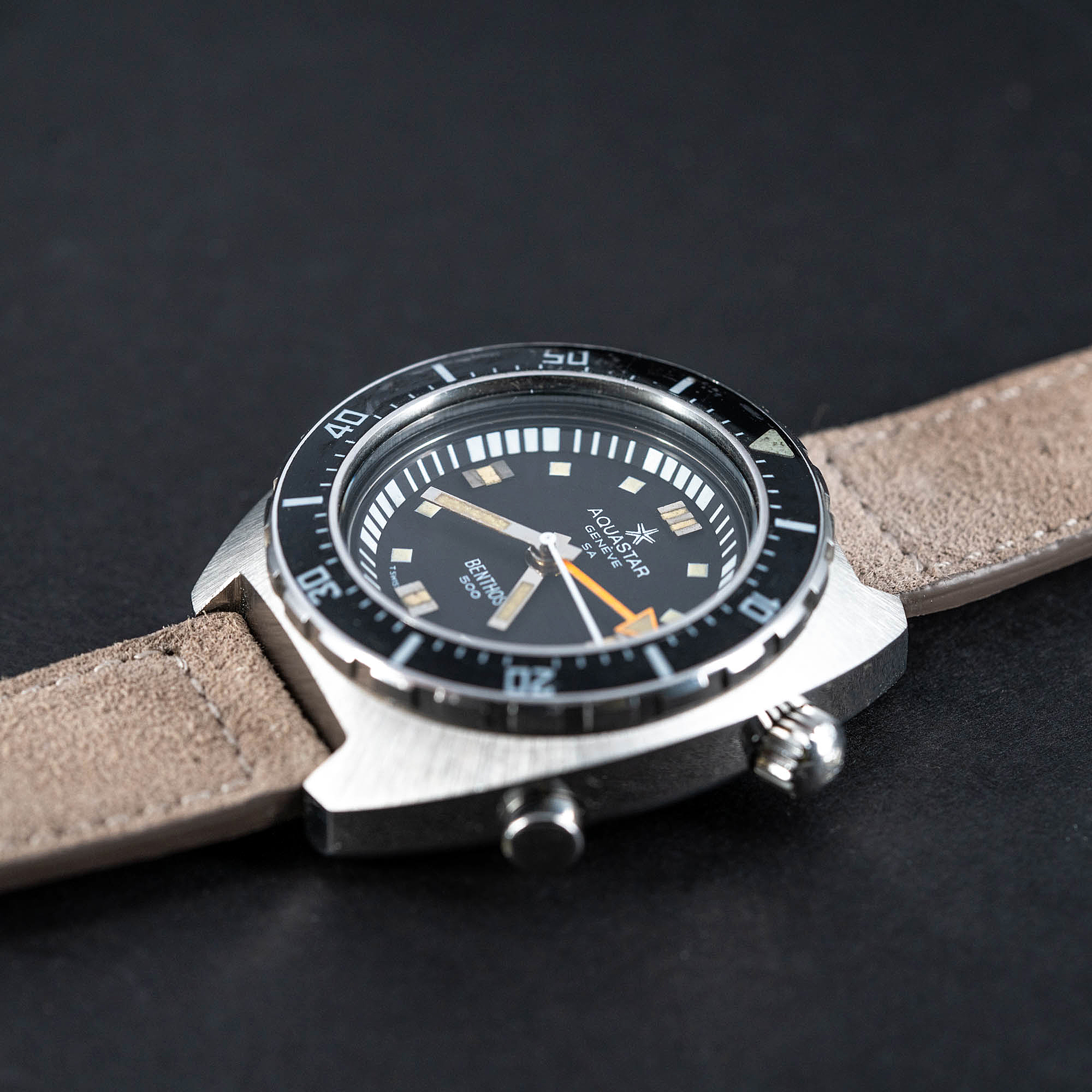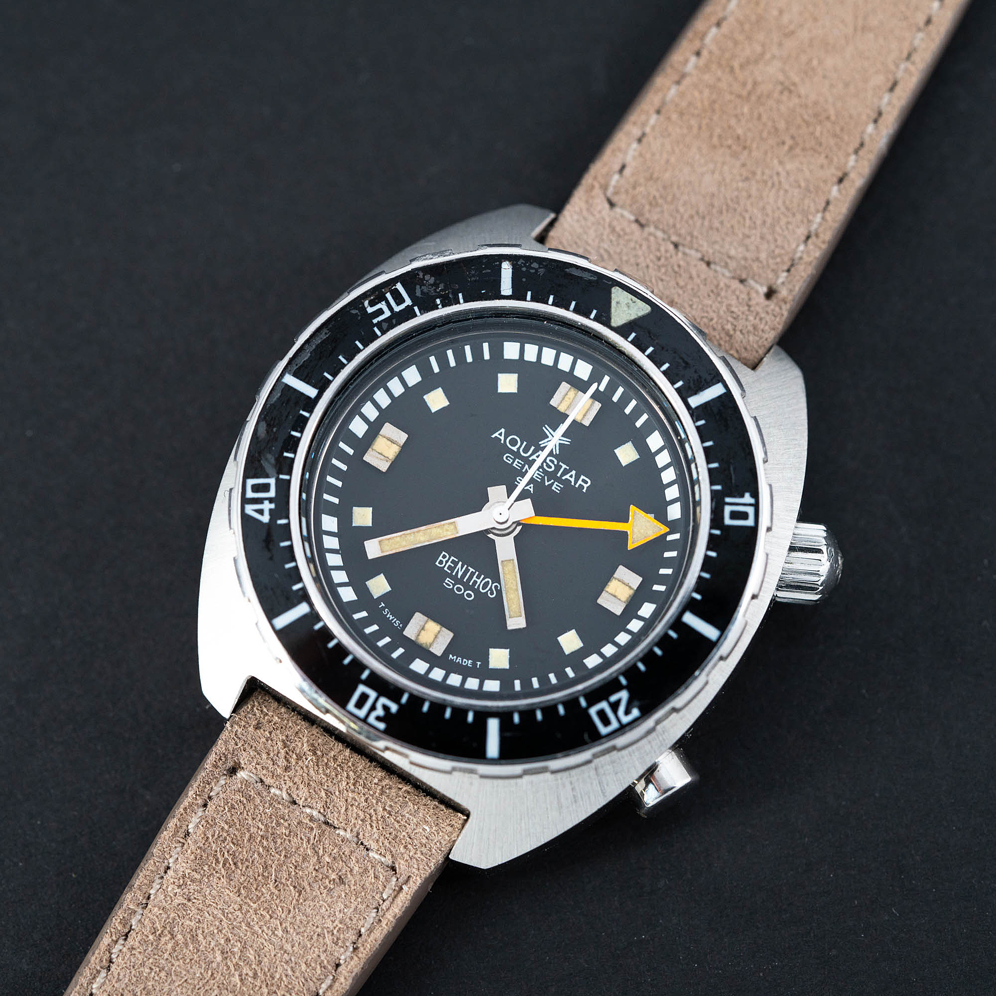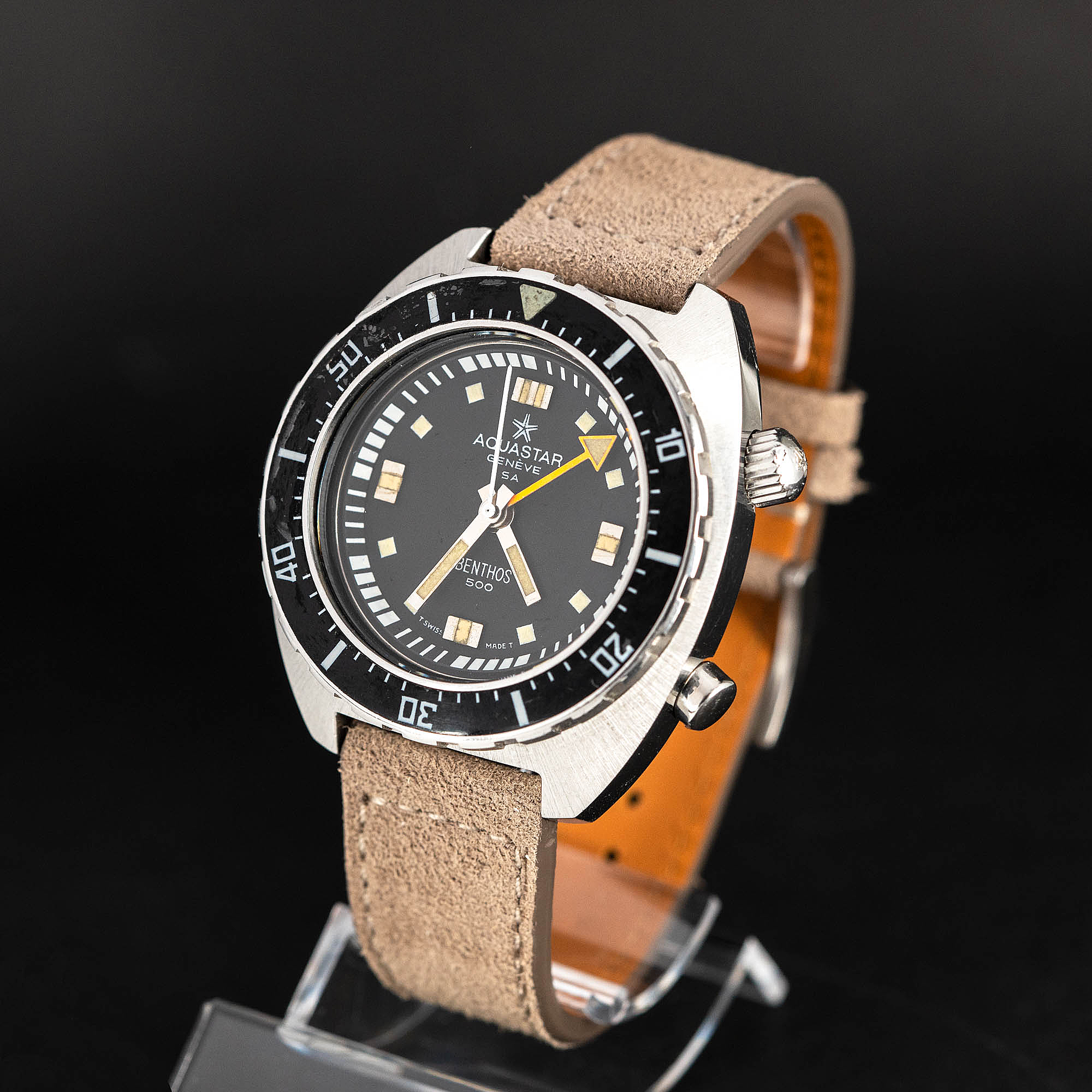 Harvinainen Aquaster Geneve SA Benthos 500 sukeltajankello 1960-luvulta. Ref. 1002. Alkuperäinen musta bakeliitti bezel tritium lumella. Huippukuntoinen musta tritium-lume kellotaulu ja tritium osoittimet. Teräskuori on erittäin hyvässä kunnossa. Kellossa on juuri huollettu ajanottotoiminnolla varustettu modifioitu AS2162 automaattikoneisto. Kello on yhä sukellustiivis, testattu +10/-0,7bar. Kuoren koko on 42mm.