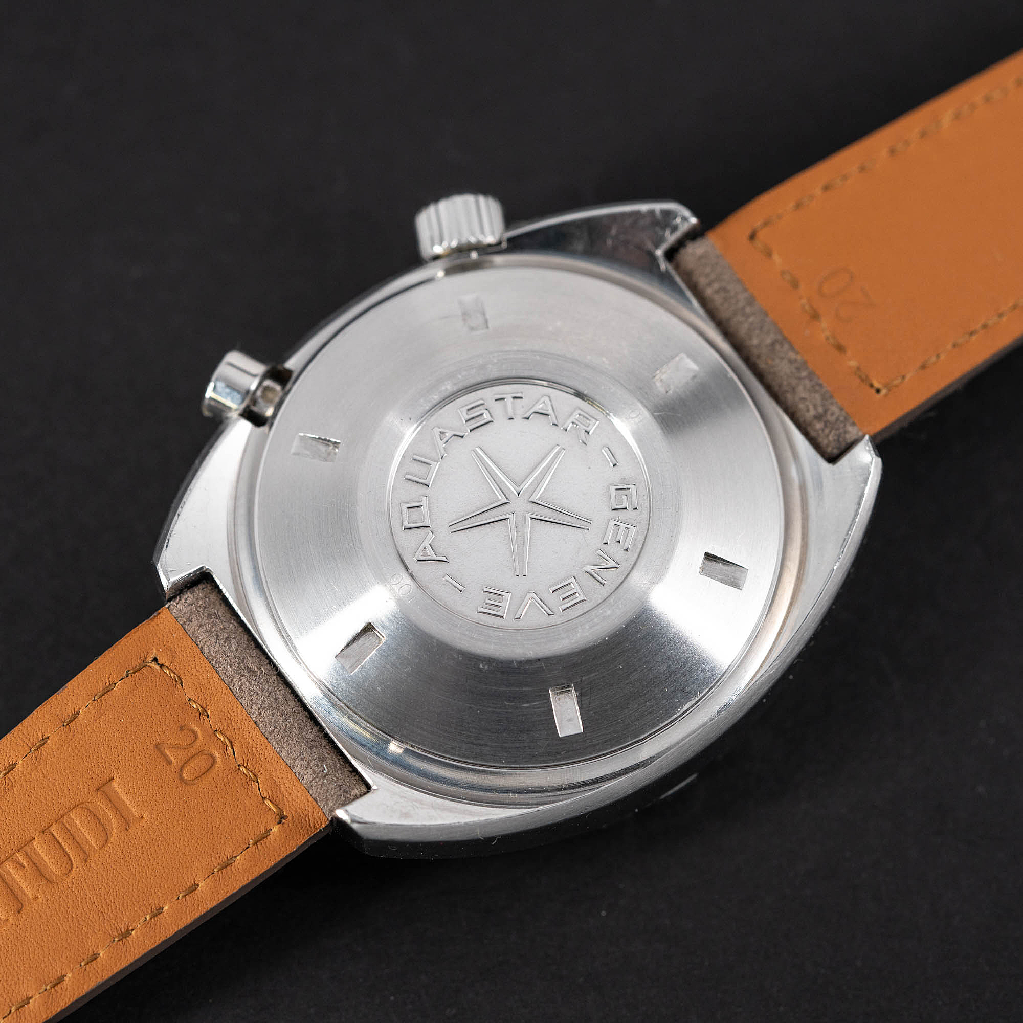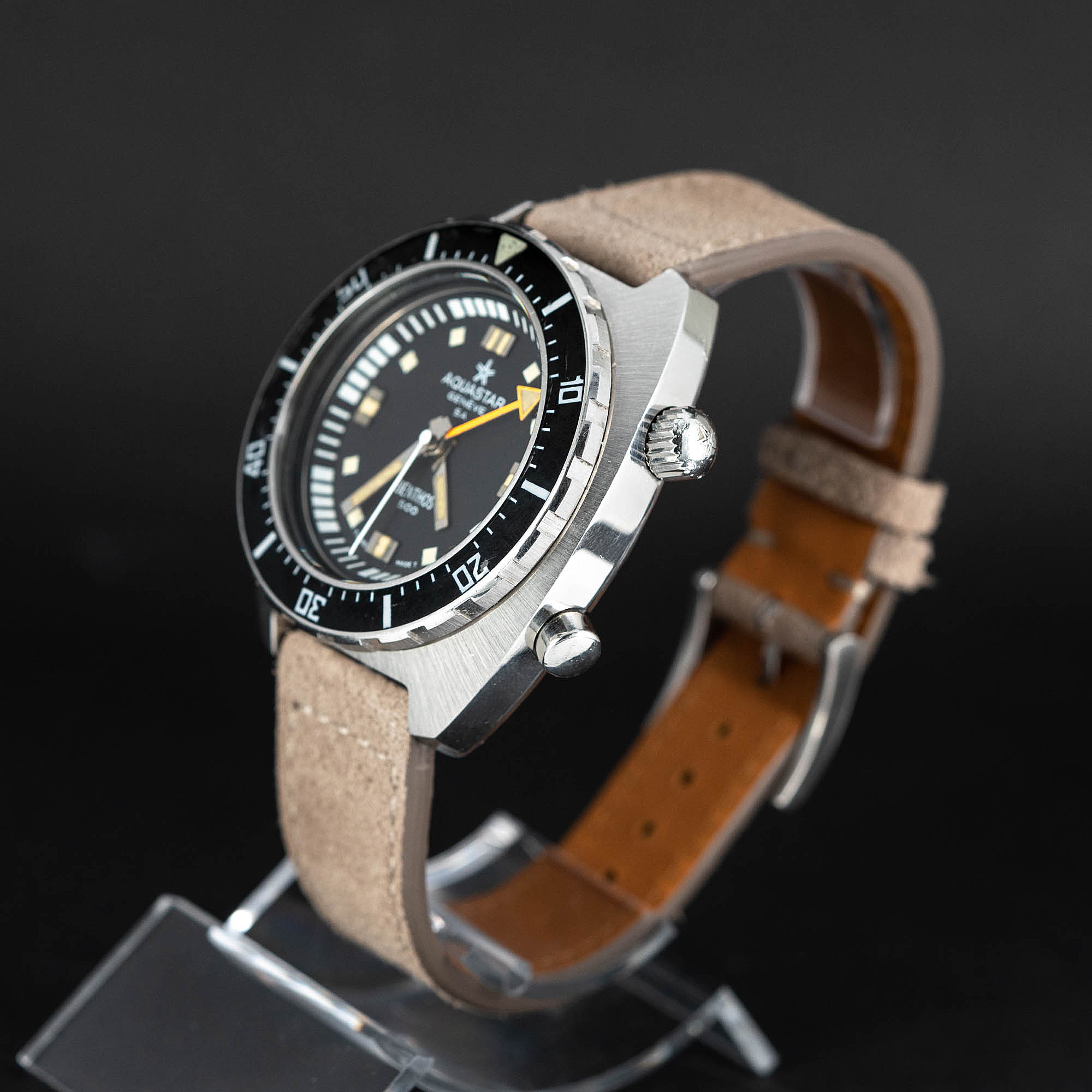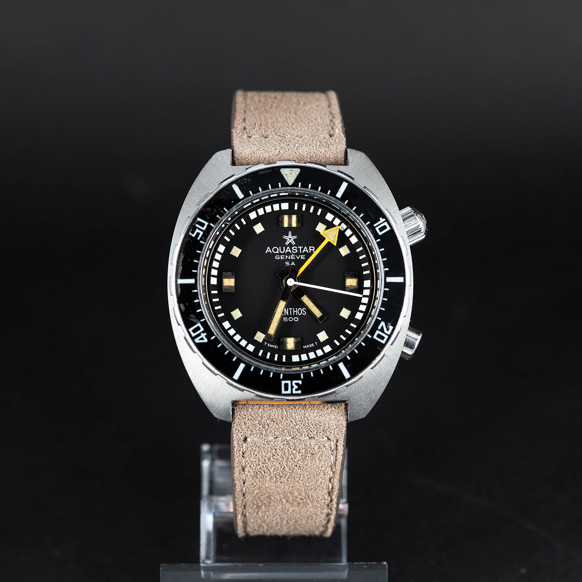 Harvinainen Aquaster Geneve SA Benthos 500 sukeltajankello 1960-luvulta. Ref. 1002. Alkuperäinen musta bakeliitti bezel tritium lumella. Huippukuntoinen musta tritium-lume kellotaulu ja tritium osoittimet. Teräskuori on erittäin hyvässä kunnossa. Kellossa on juuri huollettu ajanottotoiminnolla varustettu modifioitu AS2162 automaattikoneisto. Kello on yhä sukellustiivis, testattu +10/-0,7bar. Kuoren koko on 42mm.