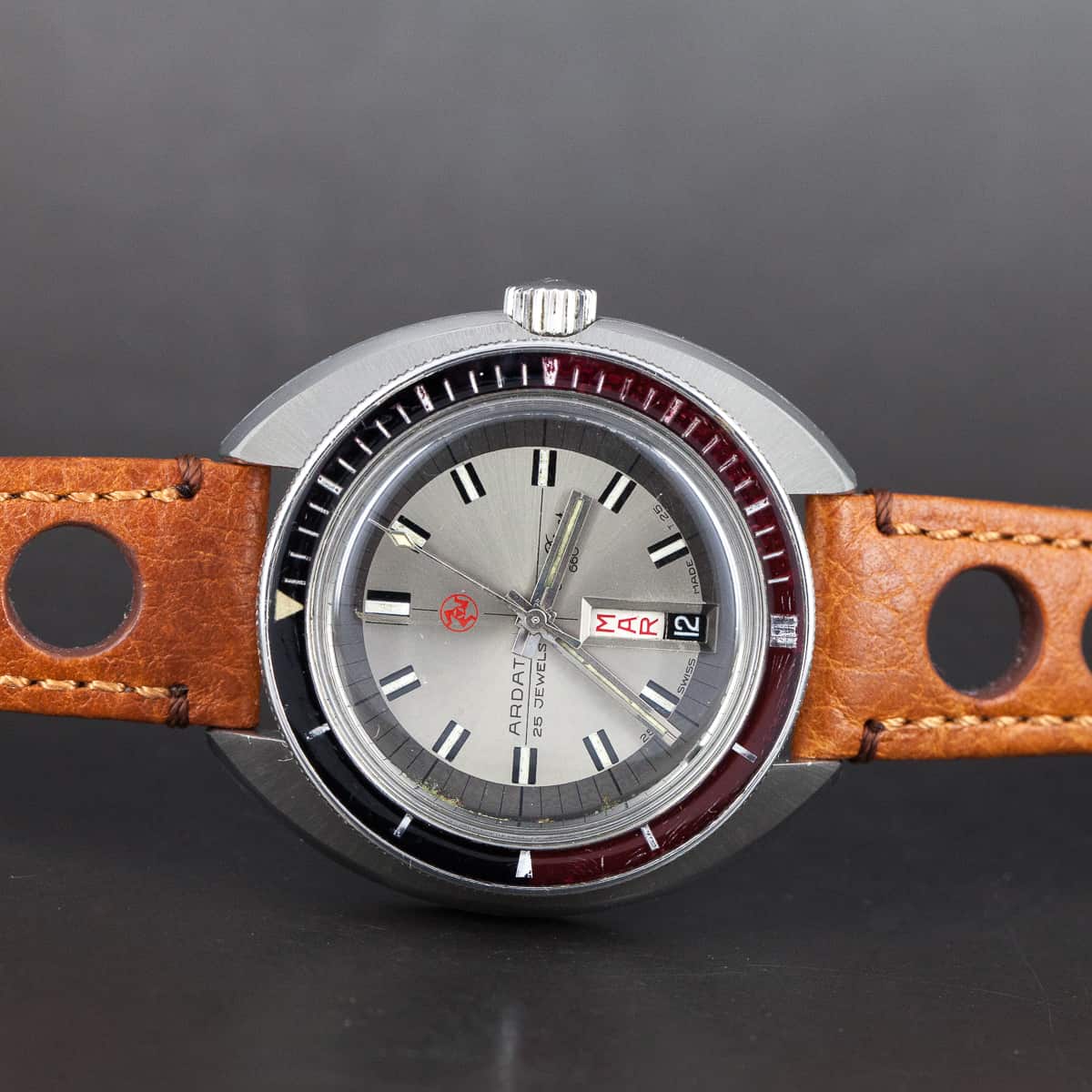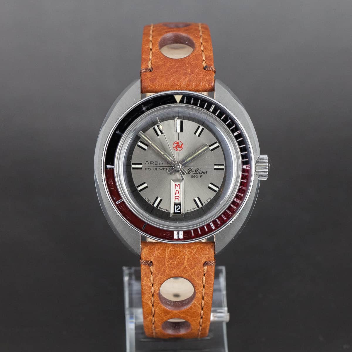 Ardath D-Diver 660F sukeltajankello 1960-luvulta. Harvinainen bakeliitti lasisarja. Alkuperäinen tritium kellotaulu ja osoittimet. AS1906 day-date automaattikoneisto on testattu ja toimii hyvin. Kuoren koko n.40mm. Ranneke on 18mm Hirsch Rally-mallia.