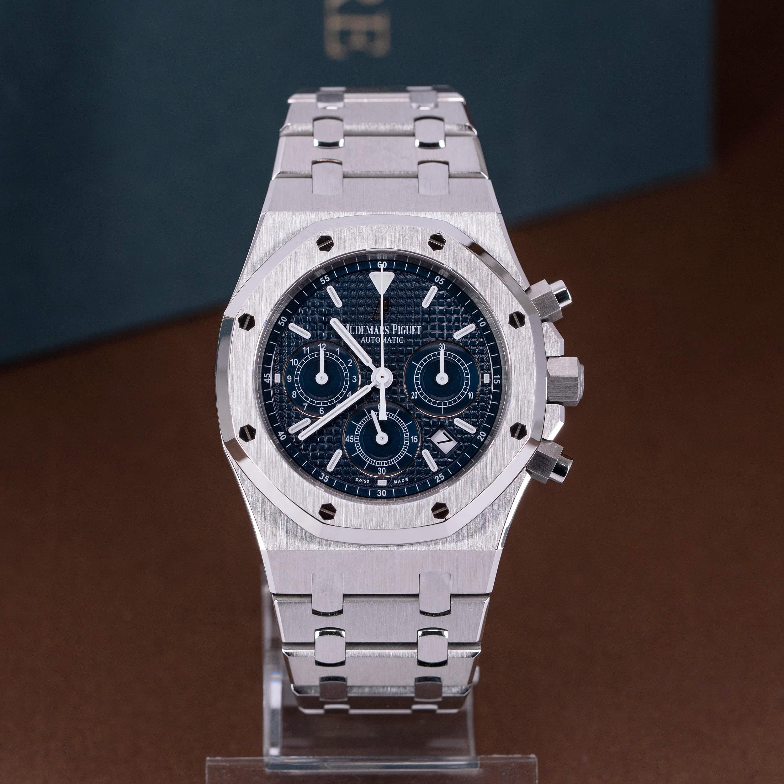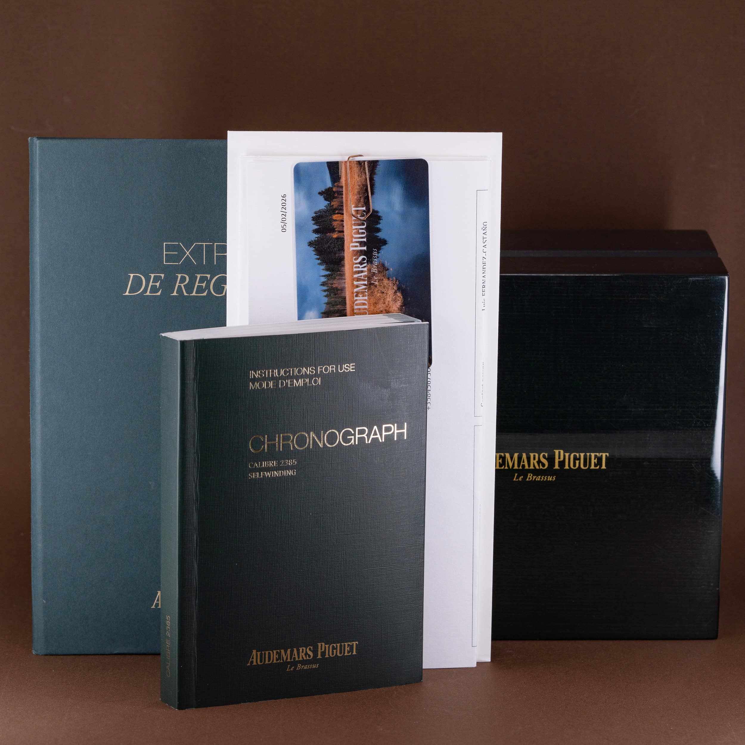 Kellon mukana tulee Royal Oak mallin kellolaatikko (sisä ja ulko), käyttöohjeet, AP:n Extract-de-Registre –todistus sekä tehdashuollon dokumentit.