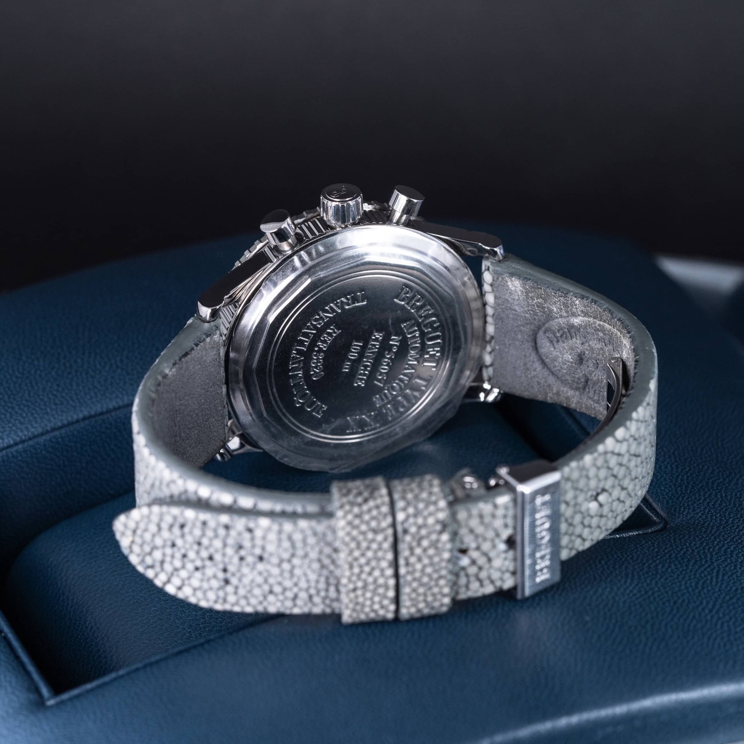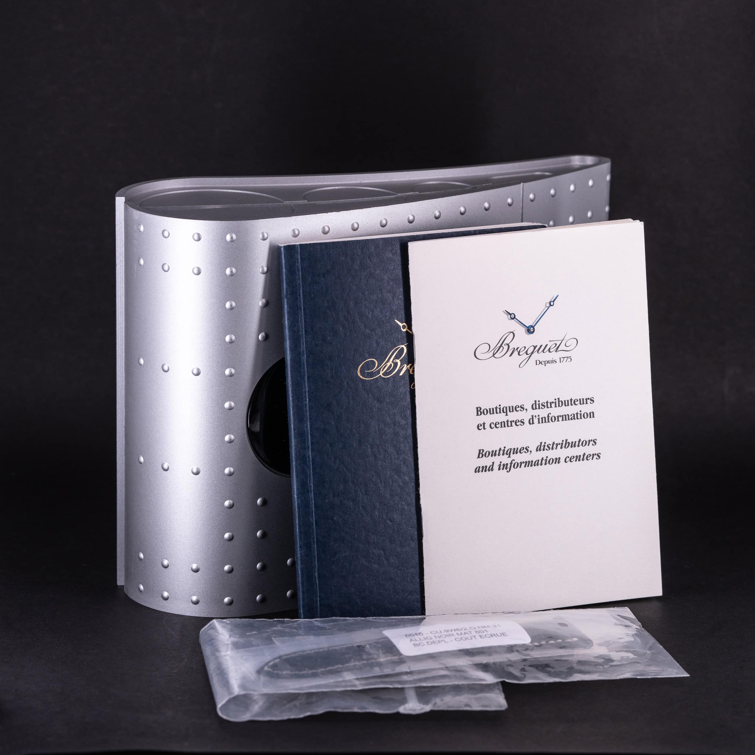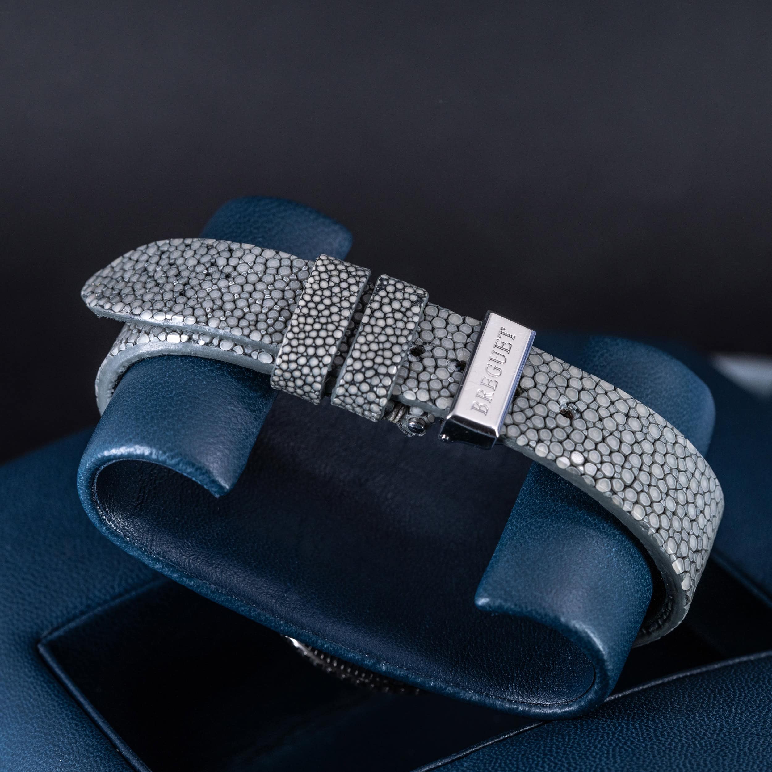 Kellossa on siniharmaa rauskunnahka ranneke Breguetin alkuperäisellä soljella. Mukana tulee myös uusi ja käyttämätön Breguetin oma alligaattori nahkaranneke.